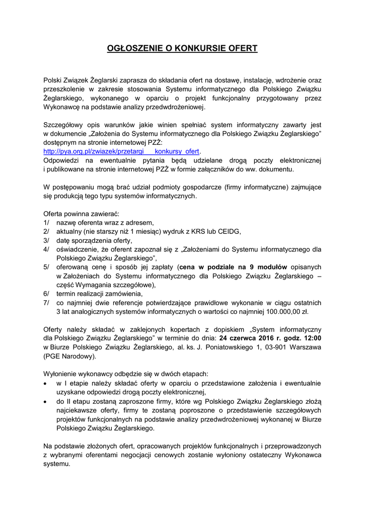 OGŁOSZENIE O KONKURSIE OFERT Polski Związek Żeglarski zaprasza do składania ofert na dostawę, instalację, wdrożenie oraz przeszkolenie w zakresie stosowania Systemu informatycznego dla Polskiego Związku Żeglarskiego, wykonanego w oparciu o projekt funkcjonalny przygotowany przez Wykonawcę na podstawie analizy przedwdrożeniowej. Szczegółowy opis warunków jakie winien spełniać system informatyczny zawarty jest w dokumencie „Założenia do Systemu informatycznego dla Polskiego Związku Żeglarskiego” dostępnym na stronie internetowej PZŻ: http://pya.org.pl/zwiazek/przetargi___konkursy_ofert. Odpowiedzi na ewentualnie pytania będą udzielane drogą poczty elektronicznej i publikowane na stronie internetowej PZŻ w formie załączników do ww. dokumentu. W postępowaniu mogą brać udział podmioty gospodarcze (firmy informatyczne) zajmujące się produkcją tego typu systemów informatycznych. Oferta powinna zawierać: 1/ nazwę oferenta wraz z adresem, 2/ aktualny (nie starszy niż 1 miesiąc) wydruk z KRS lub CEIDG, 3/ datę sporządzenia oferty, 4/ oświadczenie, że oferent zapoznał się z „Założeniami do Systemu informatycznego dla Polskiego Związku Żeglarskiego”, 5/ oferowaną cenę i sposób jej zapłaty (cena w podziale na 9 modułów opisanych w Założeniach do Systemu informatycznego dla Polskiego Związku Żeglarskiego – część Wymagania szczegółowe), 6/ termin realizacji zamówienia, 7/ co najmniej dwie referencje potwierdzające prawidłowe wykonanie w ciągu ostatnich 3 lat analogicznych systemów informatycznych o wartości co najmniej 100.000,00 zł. Oferty należy składać w zaklejonych kopertach z dopiskiem „System informatyczny dla Polskiego Związku Żeglarskiego” w terminie do dnia: 24 czerwca 2016 r. godz. 12:00 w Biurze Polskiego Związku Żeglarskiego, al. ks. J. Poniatowskiego 1, 03-901 Warszawa (PGE Narodowy). Wyłonienie wykonawcy odbędzie się w dwóch etapach: w I etapie należy składać oferty w oparciu o przedstawione założenia i ewentualnie uzyskane odpowiedzi drogą poczty elektronicznej, do II etapu zostaną zaproszone firmy, które wg Polskiego Związku Żeglarskiego złożą najciekawsze oferty, firmy te zostaną poproszone o przedstawienie szczegółowych projektów funkcjonalnych na podstawie analizy przedwdrożeniowej wykonanej w Biurze Polskiego Związku Żeglarskiego. Na podstawie złożonych ofert, opracowanych projektów funkcjonalnych i przeprowadzonych z wybranymi oferentami negocjacji cenowych zostanie wyłoniony ostateczny Wykonawca systemu. Kryteriami, którymi będzie kierował się Polski Związek Żeglarski przy wyłonieniu zwycięzcy postępowania będą: cena i warunki płatności, doświadczenie firmy przy realizacji zamówień o podobnym stopniu złożoności, serwis gwarancyjny i pogwarancyjny, projekt funkcjonalny, termin wykonania zamówienia. Informacji dodatkowych w zakresie funkcjonalności planowanego Systemu informatycznego dla Polskiego Związku Żeglarskiego udziela: Piotr Zagajewski: [email protected]. Do postępowania nie stosuje się przepisów Ustawy z dnia 29 stycznia 2004 r. Prawo zamówień publicznych. Polski Związek Żeglarski zastrzega sobie prawo odwołania konkursu ofert bez podania przyczyn.
