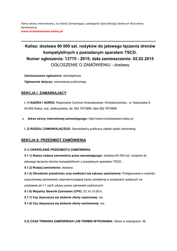 Adres strony internetowej, na której Zamawiający udostępnia Specyfikację Istotnych Warunków Zamówienia: www.krwiodawstwo.kalisz.pl Kalisz: dostawa 60 000 szt. nożyków do jałowego łączenia drenów kompatybilnych z posiadanym aparatem TSCD. Numer ogłoszenia: 13775 - 2015; data zamieszczenia: 02.02.2015 OGŁOSZENIE O ZAMÓWIENIU - dostawy Zamieszczanie ogłoszenia: obowiązkowe. Ogłoszenie dotyczy: zamówienia publicznego. SEKCJA I: ZAMAWIAJĄCY I. 1) NAZWA I ADRES: Regionalne Centrum Krwiodawstwa i Krwiolecznictwa , ul. Kaszubska 9, 62-800 Kalisz, woj. wielkopolskie, tel. 062 7673889, faks 062 7673889. Adres strony internetowej zamawiającego: http://www.krwiodawstwo.kalisz.pl I. 2) RODZAJ ZAMAWIAJĄCEGO: Samodzielny publiczny zakład opieki zdrowotnej. SEKCJA II: PRZEDMIOT ZAMÓWIENIA II.1) OKREŚLENIE PRZEDMIOTU ZAMÓWIENIA II.1.1) Nazwa nadana zamówieniu przez zamawiającego: dostawa 60 000 szt. nożyków do jałowego łączenia drenów kompatybilnych z posiadanym aparatem TSCD.. II.1.2) Rodzaj zamówienia: dostawy. II.1.4) Określenie przedmiotu oraz wielkości lub zakresu zamówienia: Postępowanie o wartości szacunkowej zamówienia nieprzekraczającej kwoty określonej w przepisach wydanych na podstawie art.11 ust.8 ustawy prawo zamówień publicznych. II.1.6) Wspólny Słownik Zamówień (CPV): 33.14.10.00-0. II.1.7) Czy dopuszcza się złożenie oferty częściowej: nie. II.1.8) Czy dopuszcza się złożenie oferty wariantowej: nie. II.2) CZAS TRWANIA ZAMÓWIENIA LUB TERMIN WYKONANIA: Okres w miesiącach: 36. SEKCJA III: INFORMACJE O CHARAKTERZE PRAWNYM, EKONOMICZNYM, FINANSOWYM I TECHNICZNYM III.1) WADIUM Informacja na temat wadium: nie dotyczy III.2) ZALICZKI III.3) WARUNKI UDZIAŁU W POSTĘPOWANIU ORAZ OPIS SPOSOBU DOKONYWANIA OCENY SPEŁNIANIA TYCH WARUNKÓW III. 3.1) Uprawnienia do wykonywania określonej działalności lub czynności, jeżeli przepisy prawa nakładają obowiązek ich posiadania Opis sposobu dokonywania oceny spełniania tego warunku o Zamawiający nie stawia szczegółowych warunków w zakresie wskazanym w art. 22 ust.1 pkt 1 pzp. Wykonawca przedłoży oświadczenie o spełnieniu warunków udziału w postępowaniu z art. 22 ust. 1 pkt 1 pzp III.3.2) Wiedza i doświadczenie Opis sposobu dokonywania oceny spełniania tego warunku o Zamawiający nie stawia szczegółowych warunków w zakresie wskazanym w art. 22 ust.1 pkt 2 pzp. Wykonawca przedłoży oświadczenie o spełnieniu warunków udziału w postępowaniu z art. 22 ust. 1 pkt 2 pzp III.3.3) Potencjał techniczny Opis sposobu dokonywania oceny spełniania tego warunku o Zamawiający nie stawia szczegółowych warunków w zakresie wskazanym w art. 22 ust.1 pkt 3 pzp. Wykonawca przedłoży oświadczenie o spełnieniu warunków udziału w postępowaniu z art. 22 ust. 1 pkt 3 pzp III.3.4) Osoby zdolne do wykonania zamówienia Opis sposobu dokonywania oceny spełniania tego warunku o Zamawiający nie stawia szczegółowych warunków w zakresie wskazanym w art. 22 ust.1 pkt 3 pzp. Wykonawca przedłoży oświadczenie o spełnieniu warunków udziału w postępowaniu z art. 22 ust. 1 pkt 3 pzp III.3.5) Sytuacja ekonomiczna i finansowa Opis sposobu dokonywania oceny spełniania tego warunku o Zamawiający nie stawia szczegółowych warunków w zakresie wskazanym w art. 22 ust.1 pkt 4 pzp. Wykonawca przedłoży oświadczenie o spełnieniu warunków udziału w postępowaniu z art. 22 ust. 1 pkt 4 pzp III.4) INFORMACJA O OŚWIADCZENIACH LUB DOKUMENTACH, JAKIE MAJĄ DOSTARCZYĆ WYKONAWCY W CELU POTWIERDZENIA SPEŁNIANIA WARUNKÓW UDZIAŁU W POSTĘPOWANIU ORAZ NIEPODLEGANIA WYKLUCZENIU NA PODSTAWIE ART. 24 UST. 1 USTAWY III.4.1) W zakresie wykazania spełniania przez wykonawcę warunków, o których mowa w art. 22 ust. 1 ustawy, oprócz oświadczenia o spełnianiu warunków udziału w postępowaniu należy przedłożyć: III.4.2) W zakresie potwierdzenia niepodlegania wykluczeniu na podstawie art. 24 ust. 1 ustawy, należy przedłożyć: oświadczenie o braku podstaw do wykluczenia; aktualny odpis z właściwego rejestru lub z centralnej ewidencji i informacji o działalności gospodarczej, jeżeli odrębne przepisy wymagają wpisu do rejestru lub ewidencji, w celu wykazania braku podstaw do wykluczenia w oparciu o art. 24 ust. 1 pkt 2 ustawy, wystawiony nie wcześniej niż 6 miesięcy przed upływem terminu składania wniosków o dopuszczenie do udziału w postępowaniu o udzielenie zamówienia albo składania ofert; III.4.4) Dokumenty dotyczące przynależności do tej samej grupy kapitałowej lista podmiotów należących do tej samej grupy kapitałowej w rozumieniu ustawy z dnia 16 lutego 2007 r. o ochronie konkurencji i konsumentów albo informacji o tym, że nie należy do grupy kapitałowej; III.5) INFORMACJA O DOKUMENTACH POTWIERDZAJĄCYCH, ŻE OFEROWANE DOSTAWY, USŁUGI LUB ROBOTY BUDOWLANE ODPOWIADAJĄ OKREŚLONYM WYMAGANIOM W zakresie potwierdzenia, że oferowane roboty budowlane, dostawy lub usługi odpowiadają określonym wymaganiom należy przedłożyć: próbki, opisy lub fotografie produktów, które mają zostać dostarczone, których autentyczność musi zostać poświadczona przez wykonawcę na żądanie zamawiającego; inne dokumenty informacja zawarta w siwz SEKCJA IV: PROCEDURA IV.1) TRYB UDZIELENIA ZAMÓWIENIA IV.1.1) Tryb udzielenia zamówienia: przetarg nieograniczony. IV.2) KRYTERIA OCENY OFERT IV.2.1) Kryteria oceny ofert: cena oraz inne kryteria związane z przedmiotem zamówienia: 1 - Cena - 90 2 - Termin realizacji zamówienia cząstkowego - 10 IV.4) INFORMACJE ADMINISTRACYJNE IV.4.1) Adres strony internetowej, na której jest dostępna specyfikacja istotnych warunków zamówienia: www.krwiodawstwo.kalisz.pl Specyfikację istotnych warunków zamówienia można uzyskać pod adresem: Regionalne Centrum Krwiodawstwa i Krwiolecznictwa w Kaliszu ul.Kaszubska 9. IV.4.4) Termin składania wniosków o dopuszczenie do udziału w postępowaniu lub ofert: 11.02.2015 godzina 10:00, miejs