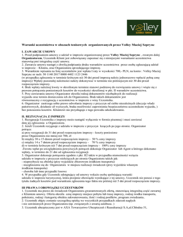 Warunki uczestnictwa w obozach tenisowych organizowanych przez Volley Maciej Szprync I. ZAWARCIE UMOWY 1. Przed podpisaniem umowy o udział w imprezie organizowanej przez Volley Maciej Szprync , zwanym dalej Organizatorem, Uczestnik-Klient jest zobowiązany zapoznać się z niniejszymi warunkami uczestnictwa stanowiącymi integralną część umowy. 2. Zawarcie umowy nastąpi z chwilą podpisania druku warunków uczestnictwa przez osobę zgłaszającą udział w imprezie – Klienta, oraz Organizatora sprzedającego imprezę. 3. Warunkiem wpisania na listę uczestników jest wpłata I raty w wysokości 700,- PLN, na konto : Volley Maciej Szprync nr rach: 50 1140 2017 0000 4402 1123 2446 (w przypadku zgłoszenia w terminie krótszym niż 30 dni przed imprezą należy jednorazowo wpłacić pełną cenę imprezy) Wpłaty pozostałej należności należy dokonywać w terminie nie późniejszym niż 30 dni przed rozpoczęciem imprezy. 4. Brak wpłaty należnej kwoty w określonym terminie stanowi podstawę do rozwiązania umowy i wiąże się z prawem potrącenia poniesionych kosztów do wysokości określonej w pkt. II warunków uczestnictwa. 5. Przy zawieraniu umowy Organizator określa rodzaj dokumentów niezbędnych do realizacji wyjazdu oraz termin dostarczenia ich do Organizatora. Brak takich dokumentów jest równoznaczny z rezygnacją z uczestnictwa w imprezie z winy Uczestnika. 6. Organizator zastrzega sobie prawo odwołania imprezy z przyczyn od siebie niezależnych (decyzje władz państwowych, działanie sił wyższych, braku możliwości zapewnienia bezpieczeństwa uczestnikom wyjazdu, ) bez ponoszenia kosztów. Klientowi nie przysługuje z tego powodu odszkodowanie. II. REZYGNACJA Z IMPREZY 1. Rezygnacja Uczestnika z imprezy może nastąpić wyłącznie w formie pisemnej i musi zawierać datę jej zgłoszenia u Organizatora. 2. Jeżeli Uczestnik rezygnuje z udziału w imprezie z przyczyn lezących po jego stronie. Organizator potrąca: a) przy rezygnacji do 31 dni przed rozpoczęciem imprezy - koszty poniesione przez Organizatora nie mniej niż 700, zł b) między 30 a 15 dniem przed rozpoczęciem imprezy - 50 % ceny imprezy c) między 14 a 7 dniem przed rozpoczęciem imprezy - 70 % ceny imprezy d) w terminie krótszym niż 7 dni przed rozpoczęciem imprezy - 100% ceny imprezy Zwrotu wpłat po uwzględnieniu powyższych potrąceń dokonuje Organizator lub Agent u którego dokonano wpłaty, w terminie do 21 dni od zgłoszenia rezygnacji. 3. Organizator dokonuje potrącenia zgodnie z pkt. II2 także w przypadku niemożności wzięcia udziału w imprezie z przyczyn nieleżących po stronie Organizatora takich jak: - nieprzybycie na zbiórkę (przy wyjeździe zbiorowym środkiem transportu) - niezgłoszenie się do Organizatora w miejscu realizacji świadczeń (przy wyjeździe własnym środkiem transportu) - choroba lub inne przypadki losowe 4. W przypadku gdy Uczestnik odstępujący od umowy wskaże osobę spełniającą warunki udziału w imprezie turystycznej, która przejmie obowiązki wynikające z tej umowy, Uczestnik nie ponosi z tego tytułu żadnych kosztów pod warunkiem zgłoszenia tego faktu nie później niż 5 dni przed rozpoczęciem imprezy. III PRAWA I OBOWIĄZKI UCZESTNIKÓW 1. Uczestnik ma prawo do świadczeń Organizatora gwarantowanych ofertą, stanowiącą integralną część zawartej z Klientem umowy. Oferta określa cenę imprezy miejsce pobytu lub trasę imprezy, rodzaj środka transportu, położenie, rodzaj i kategorię obiektu zakwaterowania, ilość i rodzaj posiłków, program zwiedzania.. 2. Uczestnik objęty zostanie szczególną opieką we wszystkich przypadkach zdarzeń nagłych i nie zawinionych przez Organizatora (np. związanych z awarią autobusu. ) 3. Uczestnik ubezpieczony jest w AXA Towarzystwo Ubezpieczeń i Reasekuracji S.A,ul.Chłodna 51, 00-867 Warszawa od następstw nieszczęśliwych wypadków , zakres ochrony ubezpieczeniowej : śmierć ubezpieczonego wskutek NW 10000 PLN , śmierć ubezpieczonego wskutek NW w środku lokomocji 10000 PLN , poważne urazy ubezpieczonego wskutek NW 10000 PLN , złamanie kości ubezpieczonego 1500 PLN . W razie zaistnienia szkody ubezpieczony zgadza się na zwolnienie lekarzy lecących go w kraju i za granicą z obowiązku dochowania tajemnicy lekarskie| oraz zezwala na udostępnienie ubezpieczycielowi dokumentacji z przebiegu leczenia. IV. REALIZACJA UMOWY, REKLAMACJE 1. Uczestnik zobowiązany jest do posiadania aktualnie obowiązujących dokumentów (przy wyjazdach na kolonie i obozy młodzieżowe w kraju aktualnej legitymacji szkolnej i nr PESEL). 2. Organizator zapewnia uczestnikom przebieg imprezy zgodnie z programem, dba o jakość świadczeń, przyjmuje od uczestników reklamacje i usuwa ich przyczyny, a jeżeli reklamacja jest złożona na piśmie, także potwierdza jej przyjęcie. 3. Uczestnicy są zobowiązani do przestrzegania regulaminów i innych przepisów obowiązujących w obiektach noclegowych, gastronomicznych, kortach ,zaleceń trenerów i wychowawców itp. 4. Uczestnik odpowiada za wyrządzone przez siebie szkody, za które ma obowiązek zapłacić w miejscu ich powstania z własnych środków. Za szkody wyrządzone przez osoby niepełnoletnie odpowiadają ich prawni opiekunowie 5. Organizator nie ponosi odpowiedzialności za przeszkody w wykonaniu usługi turystycznej, których przyczyny tkwią w sile wyższej (w szczególności w powodziach. pożarach wichurach itp. ) oraz wojnach strajkach, zamieszkach zamachach terrorystycznych i tym podobnych okolicznościach, na które Organizator nie ma wpływu. Organizator nie ponosi odpowiedzialności za szkody spowodowane działaniem osób trzecich takie jak kradzieże rabunki, pożary. Uczestnik imprezy zostanie objęty szczególną opieką we wszystkich przypadkach zdarzeń nagłych i niezawinionych przez Organizatora (np. związanych z awarią środka transportu, postojami w „korkach”). Organizator odpowiada za niewykonanie lub nienale