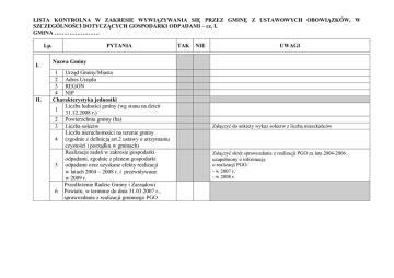 LISTA KONTROLNA W ZAKRESIE WYWIĄZYWANIA SIĘ PRZEZ GMINĘ Z USTAWOWYCH OBOWIĄZKÓW, W SZCZEGÓLNOŚCI DOTYCZĄCYCH GOSPODARKI ODPADAMI – cz. I. GMINA …………………… Lp. I. II. PYTANIA TAK NIE UWAGI Nazwa Gminy 1 Urząd Gminy/Miasta 2 Adres Urzędu 3 REGON 4 NIP Charakterystyka jednostki Liczba ludności gminy (wg stanu na dzień 1 31.12.2008 r.) 2 Powierzchnia gminy (ha) 3 Liczba sołectw Liczba nieruchomości na terenie gminy 4 (zgodnie z definicją art.2 ustawy o utrzymaniu czystości i porządku w gminach) Realizacja zadań w zakresie gospodarki odpadami, zgodnie z planem gospodarki 5 odpadami oraz uzyskane efekty realizacji w latach 2004 – 2008 r. i przewidywane w 2009 r. Przedłożenie Radzie Gminy i Zarządowi 6 Powiatu, w terminie do dnia 31.03.2007 r., sprawozdania z realizacji gminnego PGO Załączyć do ankiety wykaz sołectw z liczbą mieszkańców Załączyć skrót sprawozdania z realizacji PGO za lata 2004-2006 uzupełniony o informację o realizacji PGO: - w 2007 r. - w 2008 r. LISTA KONTROLNA W ZAKRESIE WYWIĄZYWANIA SIĘ PRZEZ GMINĘ Z USTAWOWYCH OBOWIĄZKÓW, W SZCZEGÓLNOŚCI DOTYCZĄCYCH GOSPODARKI ODPADAMI – cz. I. GMINA …………………… Lp. III IV PYTANIA Struktura organizacyjna Urzędu Gminy/Miasta 1 Zatrudnienie w Urzędzie Gminy / Miasta, w tym liczba etatów d/s ochrony środowiska (imię i nazwisko oraz kontakt telefoniczny i elektroniczny z osobą odpowiedzialną) 2 Wykaz obiektów, do których Gmina posiada tytuł prawny, a eksploatacja których powoduje korzystanie ze środowiska Wymienić uchwały Rady Gminy (kopie załączyć do protokołu) w sprawie: 1 Programu ochrony środowiska 2 Planu gospodarki odpadami 3 Regulaminu utrzymania czystości i porządku 4 Przynależności Gminy do związku gmin 5 Innych sposobów, niż określone w art. 6 ust. 1 ustawy o utrzymaniu czystości i porządku w gminach, udokumentowania wykonania obowiązków, o których mowa w art. 5 ust. 1 pkt 3b ww. ustawy 6 Górnych stawek opłat ponoszonych przez właścicieli nieruchomości za odbieranie odpadów komunalnych i opróżnianie zbiorników bezodpływowych 7 Przejęcia od właścicieli nieruchomości wszystkich lub wskazanych obowiązków, o których mowa w art.5 ust.1 pkt 1, 3b i 4 ustawy TAK NIE UWAGI LISTA KONTROLNA W ZAKRESIE WYWIĄZYWANIA SIĘ PRZEZ GMINĘ Z USTAWOWYCH OBOWIĄZKÓW, W SZCZEGÓLNOŚCI DOTYCZĄCYCH GOSPODARKI ODPADAMI – cz. I. GMINA …………………… Lp. V PYTANIA Realizacja zadań wynikających z ustawy z dnia 13.09.1996 r. o utrzymaniu czystości i porządku w gminach (Dz. U. z 2005 r. Nr 236, poz. 2008, z późn. zm.) 1 Czy Gmina utworzyła odpowiednie jednostki organizacyjne zapewniające utrzymanie czystości i porządku? Jeśli tak, to podać nazwy i zakres działania tych jednostek wg nadanego im statutu (art. 3 ust. 2 pkt 1), jeżeli nie - to jak tworzy warunki do zapewnienia utrzymania czystości i porządku w gminie? 2 Czy Gmina buduje, utrzymuje i eksploatuje własne lub wspólne z innymi gminami - jeśli tak, to podać ich nazwę i lokalizację (art. 3 ust. 2 pkt 2), w szczególności: Ø stacje zlewne dla nieczystości ciekłych gromadzonych w zbiornikach bezodpływowych? Ø instalacje i urządzenia do zbierania, transportu lub unieszkodliwiania zwłok zwierzęcych lub ich części? TAK NIE UWAGI LISTA KONTROLNA W ZAKRESIE WYWIĄZYWANIA SIĘ PRZEZ GMINĘ Z USTAWOWYCH OBOWIĄZKÓW, W SZCZEGÓLNOŚCI DOTYCZĄCYCH GOSPODARKI ODPADAMI – cz. I. GMINA …………………… Lp. PYTANIA 3 4 5 W jaki sposób realizowany jest obowiązek zapobiegania zanieczyszczeniu ulic, placów i terenów otwartych poprzez zbieranie i pozbywanie się błota, śniegu, lodu oraz innych zanieczyszczeń uprzątniętych z chodników przez właścicieli nieruchomości oraz odpadów zgromadzonych w przeznaczonych do tego urządzeniach ustawionych na chodnikach? Wskazać miejsca przeznaczone do składowania śniegu. Czy zachowane są warunki wynikające z art. 40 ust. 1 pkt 2 ustawy Prawo wodne? Czy Gmina udostępniła mieszkańcom na stronie internetowej oraz w sposób zwyczajowo przyjęty informacje o znajdujących się na terenie gminy firmach zbierających zużyty sprzęt elektryczny i elektroniczny, pochodzący z gospodarstw domowych oraz adresy punktów zbierania zużytego sprzętu elektrycznego i elektronicznego (art. 3 ust. 2 pkt 6a)? Czy wójt, burmistrz lub prezydent miasta wydał zezwolenia na świadczenie usług przez przedsiębiorców w zakresie: Ø odbierania odpadów komunalnych od właścicieli nieruchomości (art. 7 ust.1 pkt 1)? Ø opróżniania zbiorników bezodpływowych i transportu nieczystości ciekłych (art. 7 ust. TAK NIE UWAGI LISTA KONTROLNA W ZAKRESIE WYWIĄZYWANIA SIĘ PRZEZ GMINĘ Z USTAWOWYCH OBOWIĄZKÓW, W SZCZEGÓLNOŚCI DOTYCZĄCYCH GOSPODARKI ODPADAMI – cz. I. GMINA …………………… Lp. PYTANIA 1. 6 1 pkt 2)? Ø ochrony przed bezdomnymi zwierzętami (art. 7 ust. 1 pkt 3)? Ø prowadzenia schronisk dla bezdomnych zwierząt, a także grzebowisk i spalarni zwłok zwierzęcych i ich części (art.7 ust. 1 pkt 4)? Wykaz wydanych decyzji Czy wójt, burmistrz lub prezydent miasta określił i podał do publicznej wiadomości wymagania, jakie powinien spełniać przedsiębiorca ubiegający się o świadczenie ww. usług (art.7. ust. 1 pkt 3 i 3a)? Jeśli tak to kopię załączyć do ankiety? 7 Czy przed podjęciem decyzji w sprawie wydania zezwolenia wójt, burmistrz lub prezydent miasta dokonał kontrolnego sprawdzenia faktów podanych we wniosku o udzielenie zezwolenia, w celu stwierdzenia, czy przedsiębiorca spełnia warunki wykonywania działalności objętej zezwoleniem (art. 8a)? 8 Czy wójt, burmistrz lub prezydent miasta podając do publicznej wiadomości wymagania, jakie powinien spełniać przedsiębiorca ubiegający się o wydanie zezwolenia na odbiór odpadów komunalnych lub opróżnianie zbiorników bezodpływowych TAK NIE UWAGI LISTA KONTROLNA W ZAKRESIE WYWIĄZYWANIA SIĘ PRZEZ GMIN