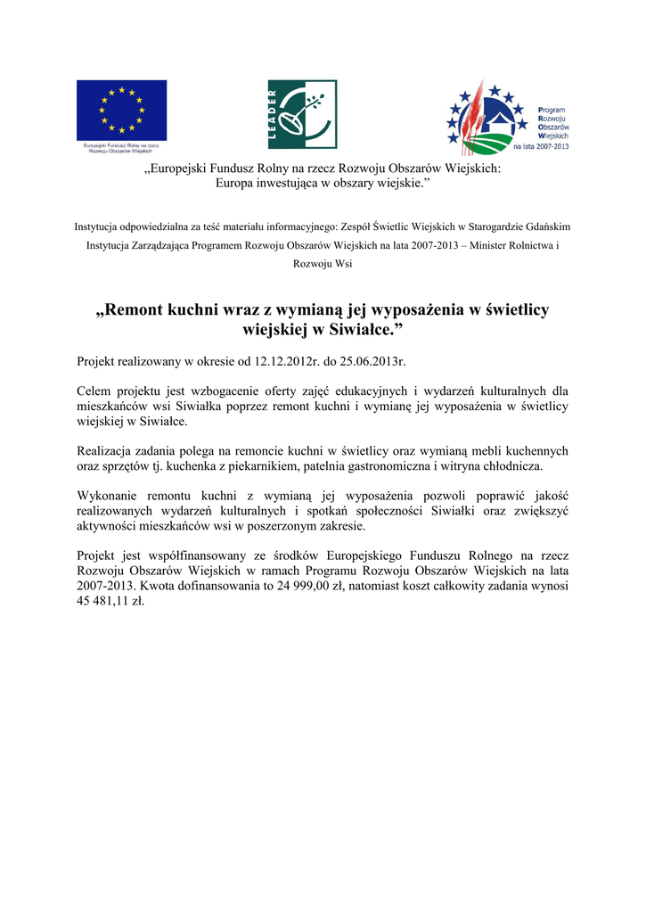„Europejski Fundusz Rolny na rzecz Rozwoju Obszarów Wiejskich: Europa inwestująca w obszary wiejskie.” Instytucja odpowiedzialna za teść materiału informacyjnego: Zespół Świetlic Wiejskich w Starogardzie Gdańskim Instytucja Zarządzająca Programem Rozwoju Obszarów Wiejskich na lata 2007-2013 – Minister Rolnictwa i Rozwoju Wsi „Remont kuchni wraz z wymianą jej wyposażenia w świetlicy wiejskiej w Siwiałce.” Projekt realizowany w okresie od 12.12.2012r. do 25.06.2013r. Celem projektu jest wzbogacenie oferty zajęć edukacyjnych i wydarzeń kulturalnych dla mieszkańców wsi Siwiałka poprzez remont kuchni i wymianę jej wyposażenia w świetlicy wiejskiej w Siwiałce. Realizacja zadania polega na remoncie kuchni w świetlicy oraz wymianą mebli kuchennych oraz sprzętów tj. kuchenka z piekarnikiem, patelnia gastronomiczna i witryna chłodnicza. Wykonanie remontu kuchni z wymianą jej wyposażenia pozwoli poprawić jakość realizowanych wydarzeń kulturalnych i spotkań społeczności Siwiałki oraz zwiększyć aktywności mieszkańców wsi w poszerzonym zakresie. Projekt jest współfinansowany ze środków Europejskiego Funduszu Rolnego na rzecz Rozwoju Obszarów Wiejskich w ramach Programu Rozwoju Obszarów Wiejskich na lata 2007-2013. Kwota dofinansowania to 24 999,00 zł, natomiast koszt całkowity zadania wynosi 45 481,11 zł.