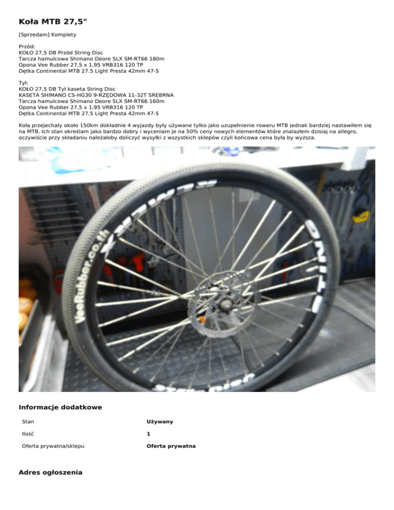 Koła MTB 27,5" [Sprzedam] Komplety Przód: KOŁO 27,5 DB Przód String Disc Tarcza hamulcowa Shimano Deore SLX SM-RT66 180m Opona Vee Rubber 27,5 x 1,95 VRB316 120 TP Dętka Continental MTB 27.5 Light Presta 42mm 47-5 Tył: KOŁO 27,5 DB Tył kaseta String Disc KASETA SHIMANO CS-HG30 9-RZĘDOWA 11-32T SREBRNA Tarcza hamulcowa Shimano Deore SLX SM-RT66 160m Opona Vee Rubber 27,5 x 1,95 VRB316 120 TP Dętka Continental MTB 27.5 Light Presta 42mm 47-5 Koła przejechały około 150km dokładnie 4 wyjazdy były używane tylko jako uzupełnienie roweru MTB jednak bardziej nastawiłem się na MTB, Ich stan określam jako bardzo dobry i wyceniam je na 50% ceny nowych elementów które znalazłem dzisiaj na allegro, oczywiście przy składaniu należałoby doliczyć wysyłki z wszystkich sklepów czyli końcowa cena była by wyższa. Informacje dodatkowe Stan Używany Ilość 1 Oferta prywatna/sklepu Oferta prywatna Adres ogłoszenia http://rowerowybazar.com.pl/kola-mtb-275-,o5011 Kontakt Mail: [email protected] Telefon: 510999534 Lokalizacja , Olsztyn - (Polska) Ogłoszenie dodano: 2017-02-07 00:29:59 Ogłoszenie wygasa: 2017-02-25 23:30:09 Powered by TCPDF (www.tcpdf.org)