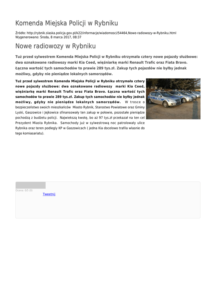 Komenda Miejska Policji w Rybniku Źródło: http://rybnik.slaska.policja.gov.pl/k22/informacje/wiadomosci/54464,Nowe-radiowozy-w-Rybniku.html Wygenerowano: Środa, 8 marca 2017, 08:37 Nowe radiowozy w Rybniku Tuż przed sylwestrem Komenda Miejska Policji w Rybniku otrzymała cztery nowe pojazdy służbowe: dwa oznakowane radiowozy marki Kia Ceed, więźniarkę marki Renault Trafic oraz Fiata Bravo. Łączna wartość tych samochodów to prawie 289 tys.zł. Zakup tych pojazdów nie byłby jednak możliwy, gdyby nie pieniądze lokalnych samorządów. Tuż przed sylwestrem Komenda Miejska Policji w Rybniku otrzymała cztery nowe pojazdy służbowe: dwa oznakowane radiowozy marki Kia Ceed, więźniarkę marki Renault Trafic oraz Fiata Bravo. Łączna wartość tych samochodów to prawie 289 tys.zł. Zakup tych samochodów nie byłby jednak możliwy, gdyby nie pieniądze lokalnych samorządów. W trosce o bezpieczeństwo swoich mieszkańców Miasto Rybnik, Starostwo Powiatowe oraz Gminy Lyski, Gaszowice i Jejkowice sfinansowały ten zakup w połowie, pozostałe pieniądze pochodzą z budżetu policji. Najwiekszą kwotę, bo aż 97 tys.zł przekazał na ten cel Prezydent Miasta Rybnika. Samochody już w sylwestrową noc patrolowały ulice Rybnika oraz teren podlegly KP w Gaszowicach ( jedna Kia docelowo trafila wlasnie do tego komiasariatu). Ocena: 0/5 (0) Tweetnij