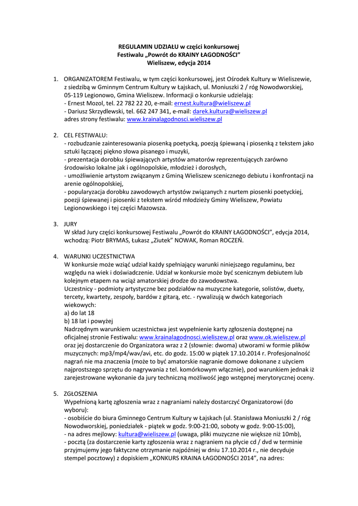 REGULAMIN UDZIAŁU w części konkursowej Festiwalu „Powrót do KRAINY ŁAGODNOŚCI” Wieliszew, edycja 2014 1. ORGANIZATOREM Festiwalu, w tym części konkursowej, jest Ośrodek Kultury w Wieliszewie, z siedzibą w Gminnym Centrum Kultury w Łajskach, ul. Moniuszki 2 / róg Nowodworskiej, 05-119 Legionowo, Gmina Wieliszew. Informacji o konkursie udzielają: - Ernest Mozol, tel. 22 782 22 20, e-mail: [email protected] - Dariusz Skrzydlewski, tel. 662 247 341, e-mail: [email protected] adres strony festiwalu: www.krainalagodnosci.wieliszew.pl 2. CEL FESTIWALU: - rozbudzanie zainteresowania piosenką poetycką, poezją śpiewaną i piosenką z tekstem jako sztuki łączącej piękno słowa pisanego i muzyki, - prezentacja dorobku śpiewających artystów amatorów reprezentujących zarówno środowisko lokalne jak i ogólnopolskie, młodzież i dorosłych, - umożliwienie artystom związanym z Gminą Wieliszew scenicznego debiutu i konfrontacji na arenie ogólnopolskiej, - popularyzacja dorobku zawodowych artystów związanych z nurtem piosenki poetyckiej, poezji śpiewanej i piosenki z tekstem wśród młodzieży Gminy Wieliszew, Powiatu Legionowskiego i tej części Mazowsza. 3. JURY W skład Jury części konkursowej Festiwalu „Powrót do KRAINY ŁAGODNOŚCI”, edycja 2014, wchodzą: Piotr BRYMAS, Łukasz „Ziutek” NOWAK, Roman ROCZEŃ. 4. WARUNKI UCZESTNICTWA W konkursie może wziąć udział każdy spełniający warunki niniejszego regulaminu, bez względu na wiek i doświadczenie. Udział w konkursie może być scenicznym debiutem lub kolejnym etapem na wciąż amatorskiej drodze do zawodowstwa. Uczestnicy - podmioty artystyczne bez podziałów na muzyczne kategorie, solistów, duety, tercety, kwartety, zespoły, bardów z gitarą, etc. - rywalizują w dwóch kategoriach wiekowych: a) do lat 18 b) 18 lat i powyżej Nadrzędnym warunkiem uczestnictwa jest wypełnienie karty zgłoszenia dostępnej na oficjalnej stronie Festiwalu: www.krainalagodnosci.wieliszew.pl oraz www.ok.wieliszew.pl oraz jej dostarczenie do Organizatora wraz z 2 (słownie: dwoma) utworami w formie plików muzycznych: mp3/mp4/wav/avi, etc. do godz. 15:00 w piątek 17.10.2014 r. Profesjonalność nagrań nie ma znaczenia (może to być amatorskie nagranie domowe dokonane z użyciem najprostszego sprzętu do nagrywania z tel. komórkowym włącznie), pod warunkiem jednak iż zarejestrowane wykonanie da jury techniczną możliwość jego wstępnej merytorycznej oceny. 5. ZGŁOSZENIA Wypełnioną kartę zgłoszenia wraz z nagraniami należy dostarczyć Organizatorowi (do wyboru): - osobiście do biura Gminnego Centrum Kultury w Łajskach (ul. Stanisława Moniuszki 2 / róg Nowodworskiej, poniedziałek - piątek w godz. 9:00-21:00, soboty w godz. 9:00-15:00), - na adres mejlowy: [email protected] (uwaga, pliki muzyczne nie większe niż 10mb), - pocztą (za dostarczenie karty zgłoszenia wraz z nagraniem na płycie cd / dvd w terminie przyjmujemy jego faktyczne otrzymanie najpóźniej w dniu 17.10.2014 r., nie decyduje stempel pocztowy) z dopiskiem „KONKURS KRAINA ŁAGODNOŚCI 2014”, na adres: Ośrodek Kultury w Wieliszewie Gminne Centrum Kultury Łajski, ul. Moniuszki 2, 05-119 Legionowo 6. ETAPY KONKURSU: - eliminacje (od 12.09. do 17.10.2014 r.) Etap eliminacji przebiega korespondencyjnie – organizatorzy rejestrują zgłoszenia a jury wstępnie ocenia dostarczone utwory i tworzy listę podmiotów artystycznych zakwalifikowanych do przesłuchań konkursowych. Uczestnicy otrzymują informację o kwalifikacji do dnia 21.10.2014 r. - przesłuchania konkursowe (26.10.2014 r.) Przesłuchania konkursowe odbywają się w dniu 26.10.2014 r., w Sali Koncertowej im. Krzysztofa Klenczona w Wieliszewie (kompleks administracyjny przy ul. Modlińskiej 1) wg. ustalonej przez jury kolejności prezentacji. - koncert laureatów i zaproszonych artystów (26.10.2014 r.) W koncercie laureatów udział wezmą nagrodzeni przez jury uczestnicy przesłuchań zdobywcy I, II, III miejsca oraz wyróżnień. Obok laureatów konkursu na scenie wystąpią GRUPA CARYNA oraz ROMAN ROCZEŃ i KRZYŚ KOWALEWSKI. 7. KRYTERIA OCENY JURY Przyjęta przez organizatorów otwarta formuła dopuszcza zarówno wykonywanie cudzych utworów oraz ich prezentację przy mechanicznym akompaniamencie (na płycie cd lub innym nośniku, o którym powiadamiamy w karcie zgłoszenia) jak i autorskie kompozycje muzyczne, własne teksty oraz akompaniament „na żywo”. 8. NAGRODY Jury przyzna I, II, III miejsce i wyróżnienia w obu kategoriach wiekowych. Jury zastrzega jednocześnie prawo do nie przyznania poszczególnych nagród lub przyznania dwóch i więcej nagród równoległych. Pula nagród w konkursie wynosi około 1000 PLN (słownie: tysiąc polskich nowych złotych) do rozdysponowania wg. decyzji jury, w postaci bonów wartościowych lub nagród rzeczowych. Przewidziano również nagrodę publiczności. 9. UWAGI ORGANIZATORA a) Organizator zastrzega, że przyjazd i ubezpieczenie finalistów odbywają się na ich własny koszt. b) W karcie zgłoszenia należy podać wymagania techniczne dotyczące warunków sceny, sprzętu, liczby mikrofonów, nagłośnienia własnego instrumentu, itd. Organizator zaznacza przy tym, iż nie jest zobligowany do pełnej realizacji przedstawionych wymogów. c) Wymiary sceny: około 10m x 5m d) Organizator dysponuje instrumentem YAMAHA Clavinova (pianino elektroniczne) i na wskazanie uczestnika udostępni go do prezentacji. Pozostałe instrumenty uczestnicy zapewniają we własnym zakresie. e) Wszelkie kwestie nie zapisane w Regulaminie rozstrzygają wspólnie Organizator i Jury. Dyrektor Ośrodka Kultury w Wieliszewie: Dariusz Skrzydlewski Jury Konkursu: Piotr Brymas, Roman Roczeń, Łukasz Nowak