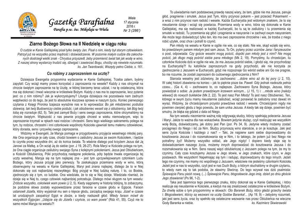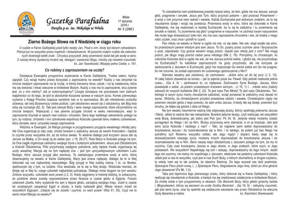 Gazetka Parafialna Parafia p.w. św. Mikołaja w Wielu Wiele 17 stycznia 2016 r. Nr 3 (286’) Ziarno Bożego Słowa na II Niedzielę w ciągu roku O cudzie w Kanie Galilejskiej pisał tylko święty Jan. Pisał o nim, kiedy był starym człowiekiem. Patrzył już na wszystko przez mądrość i doświadczenie. W pozornie małym cudzie dla zakochanych dostrzegł wielki znak - Chrystus przyszedł, żeby przemienić świat tak jak wodę w wino. Z naszej strony wystarczy trudzić się, dźwigać i zawierzać Bogu, choćby się niewiele rozumiało. ks. Jan Twardowski, Wszędy pełno Ciebie, s. 161. Co robimy z zaproszeniem na ucztę? Dzisiejsza Ewangelia przypomina wydarzenie w Kanie Galilejskiej. Trzeba zatem, byśmy zapytali: Czy wciąż mamy prawo korzystać z zaproszenia na wesele? Każdy z nas otrzymał na chrzcie świętym zaproszenie na tę Ucztę, w której bierzemy teraz udział, i na tę ostateczną, która ma się dokonać i trwać wiecznie w królestwie Bożym. Każdy z nas ma to zaproszenie, lecz pytanie jest: co z nim robimy? Jak je wykorzystujemy? Liturgia dzisiejsza nie pozostawia nam żadnych wątpliwości co do tego, że jest to absolutnie kluczowa sprawa w naszym życiu. Koniec pierwszego czytania z Księgi Proroka Izajasza wyraźnie nas w to wprowadza: Bo jak młodzieniec poślubia dziewicę, tak twój Budowniczy ciebie poślubi, i jak oblubieniec weseli się z oblubienicy, tak Bóg twój tobą się rozraduje (62, 5). Taki jest zamysł Boży i sens owego zaproszenia, które otrzymaliśmy na chrzcie świętym. Większość z nas pewnie przyjęła chrzest w wieku niemowlęcym, więc to zaproszenie trzymali w rękach nasi rodzice i chrzestni. Sens tego wielkiego sakramentu polega na tym, by rodzice, chrzestni i inni członkowie wspólnoty Kościoła ujawniali temu małemu człowiekowi, który dorasta, sens i przywilej owego zaproszenia. Widzimy w Ewangelii, że Maryja pomaga w przygotowaniu przyjęcia weselnego młodej pary. Ale Ona organizuje je cały czas, chodzi bowiem o zaślubiny Jezusa ze swoim Kościołem, i będzie to czyniła przez wszystkie dni, aż do końca świata. To właśnie dlatego pod krzyżem Jezus dał Ją Janowi za Matkę, a On wziął Ją do siebie (por. J 19, 26-27). Rola Maryi w Kościele polega na tym, że Ona ciągle organizuje zaślubiny swojego Syna z kolejnymi pokoleniami. Jezus jest Oblubieńcem, a Kościół Oblubienicą. Póki przychodzą następne pokolenia, póty będzie trwała organizacja tej uczty weselnej. Maryja się na tym najlepiej zna – jest tym uprzywilejowanym członkiem Ludu Bożego, który Jezusa przyjął jako pierwszy. Ta zaskakująca przemiana wody w wino, którą obserwujemy na weselu w Kanie Galilejskiej, Maryi jest znana najlepiej, dlatego że to w Niej dokonało się coś najbardziej niezwykłego: Bóg przyjął w Niej ludzką naturę. I to, co Boskie, zjednoczyło się z tym, co ludzkie. Ona wiedziała, że to się w Niej dzieje. Wiedziała również, że dzieje się w Niej to, czego człowiek najbardziej potrzebuje. Dlatego mówi sługom na tym weselu: Zróbcie wszystko, cokolwiek wam powie (J 2, 5). Kiedy sięgniemy w historię biblijną, to zobaczymy, że podobne słowa zostały wypowiedziane przez faraona w czasie głodu w Egipcie. Faraon ustanowił Józefa, który wyjaśniał mu sen o klęsce głodu, zarządcą swojego kraju. Józef w czasie lat urodzajnych zaopatrzył Egipt w zboże, a kiedy nadszedł głód: Wtedy faraon mówił do wszystkich Egipcjan: „Udajcie się do Józefa i czyńcie, co wam powie” (Rdz 41, 55). Czyż nie to samo mówi Maryja na weselu?! To uświadamia nam podstawową prawdę naszej wiary, że tam, gdzie nie ma Jezusa, panuje głód, pragnienie i smutek. Jezus jest Tym, który przynosi pokarm – jest przecież Pokarmem! – a wraz z nim przynosi nam radość i wesele. Każda Eucharystia jest widomym znakiem, że to się nieustannie dzieje i wciąż się powtarza. Przemiana wody w wino, która się dokonała w Kanie Galilejskiej, ma się realizować w każdej Eucharystii, bo tu są te zaślubiny i tu przemienia się smutek w radość. Tu przemienia się głód i pragnienie w nasycenie i w zachwyt owym nasyceniem. Ale może tego doświadczyć tylko ten, kto ma owo zaproszenie chrzcielne i wie, że trzeba z niego robić użytek, oraz chce i potrafi to czynić. Pan młody na weselu w Kanie w ogóle nie wie, co się stało. Nie wie, skąd wzięło się wino, bo prawdziwym panem młodym jest sam Jezus. To On, pytany przez uczniów Jana i faryzeuszów o post, odpowiada: Czy goście weselni mogą pościć, dopóki pan młody jest z nimi? Nie mogą pościć, jak długo mają pośród siebie pana młodego (Mk 2, 19). Pomyślmy, ilu chrześcijan, ilu członków Kościoła dziś w ogóle nie wie, że ma Jezusa pośród siebie, i głodzi się, nie przychodząc na Eucharystię?! Ilu katolików zaproszonych na gody przychodzi, ale nie korzysta ze zjednoczenia z Jezusem w Eucharystii, gdyż nie rozpoznaje Go wśród siebie ani Go nie pragnie, bo nie rozumie, że zostali zaproszeni do cudownego zjednoczenia z Nim? Starosta weselny jest zdziwiony, że zachowano: ...dobre wino aż do tej pory (J 2, 10). W całej historii zbawienia na koniec – jak to pięknie pisze św. Paweł: Gdy jednak nadeszła pełnia czasu... (Ga 4, 4) – zachowano to, co najlepsze. Zachowano Syna Bożego, Jezusa, który powiedział o sobie: Ja jestem prawdziwym krzewem winnym... (J 15, 1) i: ...młode wino [należy wlewać] do nowych bukłaków (Mk 2, 22). To jest nasz Pan Młody! To jest nasz Oblubieniec. Ten, którego w swym życiu mamy nieustannie zaślubiać, wciąż ponawiać te zaślubiny oraz dawać im wyraz. Widzimy, że chrześcijanom przystoi prawdziwa radość i wesele. Chrześcijanin nigdy nie powinien cierpieć głodu z tego powodu, że sam unika Jezusa. A kiedy tak się dzieje, powinien być smutny, że błąka się gdzieś z dala od Niego. Na tym weselu niezmiernie ważną rolę odgrywają słudzy, którzy spełniaj