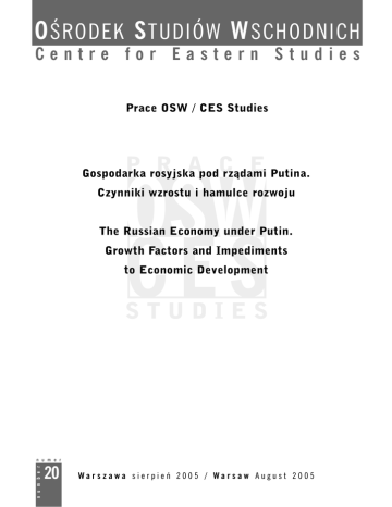 O ÂRODEK S TUDIÓW W SCHODNICH Centre for Eastern Studies Prace OSW / CES Studies P R A C E Gospodarka rosyjska pod rzàdami Putina. OSW CES Czynniki wzrostu i hamulce rozwoju The Russian Economy under Putin. Growth Factors and Impediments to Economic Development STUDIES n u m b e r n u m e r 20 Warszawa sierpieƒ 2005 / Warsaw August 2005 © Copyright by OÊrodek Studiów Wschodnich © Copyright by Centre for Eastern Studies Redaktor serii / Series editor Anna ¸abuszewska Opracowanie graficzne / Graphic design Dorota Nowacka T∏umaczenie / Translation Jadwiga Rogo˝a Wspó∏praca / Co-operation Jim Todd Mapy / Maps Wojciech Maƒkowski Wydawca / Publisher OÊrodek Studiów Wschodnich Centre for Eastern Studies ul. Koszykowa 6 a Warszawa / Warsaw, Poland tel./phone + 48 /22/ 525 80 00 fax: +48 /22/ 525 80 40 Seria „Prace OSW” zawiera materia∏y analityczne przygotowane w OÊrodku Studiów Wschodnich The “CES Studies” series contains analytical materials prepared at the Centre for Eastern Studies Materia∏y analityczne OSW mo˝na przeczytaç na stronie www.osw.waw.pl Tam równie˝ znaleêç mo˝na wi´cej informacji o OÊrodku Studiów Wschodnich The Centre’s analytical materials can be found on the Internet at www. osw.waw.pl More information about the Centre for Eastern Studies is available at the same web address ISSN 1642-4484 Spis treÊci / Contents Gospodarka rosyjska pod rzàdami Putina. Czynniki wzrostu i hamulce rozwoju / 5 Ewa Paszyc, Iwona WiÊniewska Tezy / 5 Wst´p / 6 I. Aktualna sytuacja makroekonomiczna Federacji Rosyjskiej / 7 II. Sektory gospodarki / 10 III. Czynniki rosyjskiego wzrostu / 16 IV. Ograniczenia i hamulce wzrostu gospodarczego w Rosji / 19 Konkluzje / 24 The Russian Economy under Putin. Growth factors and impediments to economic development / 33 Ewa Paszyc, Iwona WiÊniewska Key points / 33 Introduction / 34 I. The current macroeconomic situation in the Russian Federation / 35 II. Sectors of economy / 38 III. Growth factors in Russia / 44 IV. Constraints and impediments to economic growth in Russia / 46 Conclusions / 51 2. Doskona∏e wyniki makroekonomiczne w tym okresie rosyjska gospodarka zawdzi´cza splotowi korzystnych czynników, z których najwa˝niejszymi by∏y wysokie ceny surowców energetycznych na rynkach Êwiatowych, wzrost mi´dzynarodowej konkurencyjnoÊci Rosji dzi´ki znaczàcej realnej dewaluacji rubla (po kryzysie w 1998 roku), a tak˝e reformy rynkowe, jakie uda∏o si´ w tym okresie przeprowadziç. Gospodarka rosyjska pod rzàdami Putina. 3. W roku 2004, mimo utrzymujàcych si´ wcià˝ bardzo wysokich cen ropy naftowej i gazu na rynkach Êwiatowych, nastàpi∏o spowolnienie wzrostu. I chocia˝ gospodarka rozwija si´ nadal szybko, w naszej ocenie mo˝na ju˝ mówiç o wyczerpywaniu si´ tradycyjnych (poza cenami ropy i gazu) mechanizmów sprzyjajàcych rozwojowi gospodarczemu w Rosji i braku nowych, które zdo∏a∏yby je zastàpiç. Nierozwiàzane problemy strukturalne mogà w d∏u˝szym okresie spowodowaç wyhamowanie rozwoju ekonomicznego Rosji. Czynniki wzrostu i hamulce rozwoju Ewa Paszyc, Iwona WiÊniewska 4. Utrzymujàca si´ korzystna koniunktura nie zaowocowa∏a ani istotnà modernizacjà sektorów przetwórczych, ani odejÊciem gospodarki Federacji Rosyjskiej od modelu surowcowego, ani pojawieniem si´ instytucji spo∏eczeƒstwa obywatelskiego, niezb´dnych dla osiàgni´cia i utrzymania trwa∏ego wzrostu gospodarczego. Wcià˝ brak w Rosji realnych gwarancji praw w∏asnoÊci, prokuratura i organy Êcigania sà podporzàdkowane w∏adzy wykonawczej, podobnie jak system sàdowniczy. Jego orzeczenia na wszystkich poziomach (od sàdów dzielnicowych po sàdy arbitra˝owe i trybuna∏ konstytucyjny) dowodzà pe∏nego uzale˝nienia od dyspozycji w∏adzy politycznej. Mimo reformy systemu podatkowego, w obecnej rosyjskiej rzeczywistoÊci instytucje paƒstwowe pozostajà wcià˝ narz´dziami represji (administracyjnych i prawnych). Prace OSW 5 1. Po za∏amaniu gospodarczym, jakie nastàpi∏o po rozpadzie ZSRR i krachu finansowym roku 1998, gospodarka rosyjska zacz´∏a wydobywaç si´ z zapaÊci. Lata 1999–2004 by∏y okresem dynamicznego rozwoju wszystkich sektorów rosyjskiej gospodarki i szybkiego wzrostu PKB – o przesz∏o 7% w skali rocznej. Gospodarka rosyjska pod rzàdami Putina. Czynniki wzrostu i hamulce rozwoju Tezy 6 Gospodarka rosyjska pod rzàdami Putina. Czynniki wzrostu i hamulce rozwoju 5. Niezmiennie od czasów ZSRR jedynym atutem wi´kszoÊci ga∏´zi rosyjskiego przemys∏u sà stosunkowo niskie koszty produkcji (tanie surowce, energia i si∏a robocza), choç nale˝y zauwa˝yç, i˝ w ostatnich latach (2003/2004) koszty produkcji systematycznie wzrastajà, przyczyniajàc si´ do spowalniania tempa wzrostu. Wspólnym problemem wszystkich niemal sektorów jest technologiczne zapóênienie i niska jakoÊç wyrobów. Czynniki te sprawiajà, ˝e w niektórych dziedzinach (np. w przemyÊle motoryzacyjnym, samolotowym) Rosja w zasadzie nie liczy si´ na europejskim i Êwiatowym rynku produkcji wysoko przetworzonej. 6. Czynnikiem hamujàcym wzrost jest te˝ fakt wyczerpania mo˝liwoÊci rozwoju ekstensywnego – rezerwy i moce starej poradzieckiej bazy przemys∏owej w prawie wszystkich sektorach zosta∏y wykorzystane do maksimum. Dalszy wzrost zale˝y teraz od inwestycji w nowà infrastruktur´ i wspó∏czesne technologie. Jednak procesy polityczno-ekonomiczne zachodzàce w ostatnich latach w Federacji Rosyjskiej w znacznym stopniu zniech´cajà do aktywnoÊci potencjalnych inwestorów. 7. Realizowana od 2003 roku polityka Kremla w sferze gospodarki, polegajàca na coraz wi´kszej ingerencji paƒstwa w procesy gospodarcze oraz na rozszerzaniu obecnoÊci paƒstwa w sektorach uznawanych za strategiczne (naftowym, gazowym oraz finansowym) prowadzi do spowolnienia wzrostu gospodarczego. Czynnikiem hamujàcym okaza∏ si´ tak˝e radykalny zwrot w relacjach w∏adzy z biznesem, którego koro