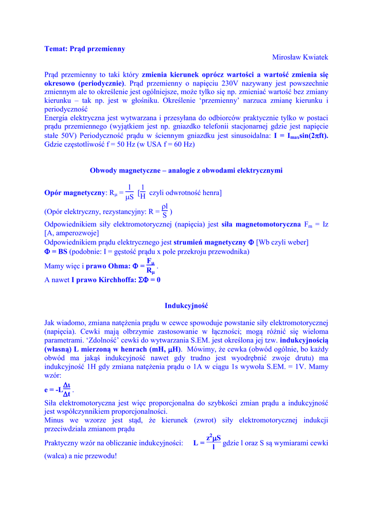 Temat: Prąd przemienny Mirosław Kwiatek Prąd przemienny to taki który zmienia kierunek oprócz wartości a wartość zmienia się okresowo (periodycznie). Prąd przemienny o napięciu 230V nazywany jest powszechnie zmiennym ale to określenie jest ogólniejsze, może tylko się np. zmieniać wartość bez zmiany kierunku – tak np. jest w głośniku. Określenie ‘przemienny’ narzuca zmianę kierunku i periodyczność Energia elektryczna jest wytwarzana i przesyłana do odbiorców praktycznie tylko w postaci prądu przemiennego (wyjątkiem jest np. gniazdko telefonii stacjonarnej gdzie jest napięcie stałe 50V) Periodyczność prądu w ściennym gniazdku jest sinusoidalna: I = Imaxsin(2ft). Gdzie częstotliwość f = 50 Hz (w USA f = 60 Hz) Obwody magnetyczne – analogie z obwodami elektrycznymi l 1 [ czyli odwrotność henra] S H l (Opór elektryczny, rezystancyjny: R = S ) Odpowiednikiem siły elektromotorycznej (napięcia) jest siła magnetomotoryczna Fm = Iz [A, amperozwoje] Odpowiednikiem prądu elektrycznego jest strumień magnetyczny [Wb czyli weber] = BS (podobnie: I = gęstość prądu x pole przekroju przewodnika) F Mamy więc i prawo Ohma: = . R A nawet I prawo Kirchhoffa: = 0 Opór magnetyczny: R = Indukcyjność Jak wiadomo, zmiana natężenia prądu w cewce spowoduje powstanie siły elektromotorycznej (napięcia). Cewki mają olbrzymie zastosowanie w łączności; mogą różnić się wieloma parametrami. ‘Zdolność’ cewki do wytwarzania S.EM. jest określona jej tzw. indukcyjnością (własną) L mierzoną w henrach (mH, H). Mówimy, że cewka (obwód ogólnie, bo każdy obwód ma jakąś indukcyjność nawet gdy trudno jest wyodrębnić zwoje drutu) ma indukcyjność 1H gdy zmiana natężenia prądu o 1A w ciągu 1s wywoła S.EM. = 1V. Mamy wzór: e = -L . t Siła elektromotoryczna jest więc proporcjonalna do szybkości zmian prądu a indukcyjność jest współczynnikiem proporcjonalności. Minus we wzorze jest stąd, że kierunek (zwrot) siły elektromotorycznej indukcji przeciwdziała zmianom prądu zS Praktyczny wzór na obliczanie indukcyjności: L = gdzie l oraz S są wymiarami cewki l (walca) a nie przewodu! Łączenie indukcyjności Indukcyjność L jest równie ważną wielkością elektryczną jak rezystancja R i pojemność C. Trzeba m.in. również znać wory na wypadkowe indukcyjności przy połączeniu szeregowym lub równoległym. Jednak wzory te są bardziej złożone (w przypadkach najogólniejszych) bo: 1. przy blisko siebie położonych cewkach istnieje ich indukcyjności wpływają na siebie więc trzeba uwzględnić tzw. indukcyjność wzajemną M będącą średnią geometryczną z indukcyjności składowych: M = LC 2. Wzory zależą od jednego z dwóch możliwych kierunków nawinięcia cewek: zgodnie lub przeciwnie Tak więc mamy: Przy szeregowym połączeniu zgodnym: L = L1 + L2 + 2M Przy szeregowym przeciwnym: L = L1 + L2 - 2M L1L2 - M2 Przy równoległym zgodnym: L = L1 + L2 + 2M L1L2 - M2 Przy równoległym przeciwnym: L = L1 + L2 - 2M Załóżmy, że solenoidy (cewki) są daleko od siebie, czyli M = 0. Wtedy otrzymujemy wzory znane z łączenia rezystorów lub/i kondensatorów. W dwóch pierwszych wzorach widać to bezpośrednio natomiast przekształćmy np. wzór ostatni tworząc odwrotności obu stron: 1 L1 + L2 1 1 1 Czyli L = L1L2 L = L1 + L2 A więc wzór do połączenia równoległego oporników albo szeregowego kondensatorów Opór dla prądu przemiennego Taki opór to nie tylko rezystancja R. Nazywa się taki opór ogólniej zawadą Z albo impedancją albo oporem pozornym. Zawada zależy też od indukcyjności L, od pojemności elektrycznej C (też praktycznie prawie każdy obwód zawiera pojemność mimo, że możemy nie móc wyodrębnić kondensatora) oraz od częstotliwości prądu f. 1 2 Z= R2 + (L ) gdzie = 2f. C 2fL nazywa się oporem (biernym) indukcyjnym (reaktancją indukcyjną) XL a 1 oporem (biernym) pojemnościowym (reaktancją pojemnościową) XC. fC Przy jednej szczególnej wartości częstotliwości prądu nie będzie żadnych oporów elektrycznych poza rezystancyjnym R, tzn nie będzie ani RL ani RC. Oczywiście najczęściej chcielibyśmy maksymalnie zmniejszyć jakiś opór . Ze wzoru widać bardzo pięknie kiedy tak będzie; należy do niego podejść matematycznie. Jest we wzorze różnica a jako taka może mieć wartość zerową! Zeruje się gdy jest równość obu nierezystancyjnych oporów: 1 2fL = fC Stąd: (2f2LC = 1 i: 1 f= LC Taka częstotliwość nazywa się rezonansowa. Transformator Służy jak wiadomo do zmiany wartości (np. zmniejszenia z 230V albo podwyższenia z 6V) napięcia (przemiennego ale można go zamienić na stałe). Tu stosuje się wzór zwany przekładnią transformatora: U1 z1 I2 = = U z I Aby zapamiętać ten wzór (indeksy!) pamiętać trzeba, że moc elektryczna musi być taka sama (zakładamy dla uproszczenia bezstratność) po obu stronach rdzenia (na obu uzwojeniach): U1I1 = U2I2. oraz są równe amperozwoje: z1I1 = z2I2 Wartości skuteczne napięć i prądów przemiennych Gdy np. zamieniamy prąd przemienny na stały to ten stały nie będzie miał wartości maksymalnej prądu przemiennego lecz wartość mniejszą tzw skuteczną. Mamy więc: Umax Napięcie skuteczne Usk = oraz 2 Imax Natężenie skuteczne prądu: Isk = 2 Moc prądu przemiennego P = UskIskcos. Jak widać moc (czynna) zależy nie tylko od napięcia i prądu ale też od tzw współczynnika mocy będącego powyższym kosinusem. UR Cos = U Gdy obwód zawiera tylko rezystancję R to całe napięcie jest (‘odkłada się’) na tej rezystancji więc wtedy cosi moc jest maksymalna. Ale np. gdy do sieci prądu przemiennego są dołączone odbiorniki zawierające indukcyjności czyli cewki jak np. transformatory czy silniki to pojawia się napięcie UL. zmniejszające udział napięcia UR. w napięciu U co powoduje spadek wartości kosinusa a więc i spadek mocy. Dlatego np. do silników dołącza się równol