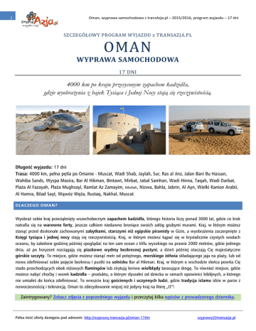1 Oman, wyprawa samochodowa z transAzja.pl – 2015/2016, program wyjazdu – 17 dni SZCZEGÓŁOWY PROGRAM WYJAZDU z TRANSAZJA.PL OMAN WYPRAWA SAMOCHODOWA 17 DNI 4000 km po kraju przesyconym zapachem kadzidła, gdzie wyobrażenia z bajek Tysiąca i Jednej Nocy stają się rzeczywistością. Długość wyjazdu: 17 dni Trasa: 4000 km, pełna pętla po Omanie - Muscat, Wadi Shab, Jaylah, Sur, Ras al Jinz, Jalan Bani Bu Hassan, Wahiba Sands, Wyspa Masira, Bar Al Hikman, Bintawt, Mirbat, Jabal Samhan, Wadi Hinna, Taqah, Wadi Darbat, Plaża Al Fazayah, Plaża Mughsayl, Ramlat Az Zamayim, Misfah, Nizwa, Bahla, Jabrin, Al Ayn, Wielki Kanion Arabii, Al Hamra, Bilad Sayt, Wąwóz Węża, Rustaq, Nakhal, Muscat DLACZEGO OMAN? Wyobraź sobie kraj przesiąknięty wszechobecnym zapachem kadzidła, którego historia liczy ponad 3000 lat, gdzie co krok natrafia się na warowne forty, jeszcze całkiem niedawno broniące swoich załóg grubymi murami. Kraj, w którym możesz stanąć przed doskonale zachowanymi zabytkami, starszymi niż egipskie piramidy w Gizie, a wyobrażenia zaczerpnięte z Księgi tysiąca i jednej nocy stają się rzeczywistością. Kraj, w którym możesz kąpać się w krystalicznie czystych wodach oceanu, by zaledwie godzinę później spoglądać na ten sam ocean z klifu wysokiego na prawie 2000 metrów, gdzie jednego dnia, aż po horyzont rozciągają się piaskowe wydmy bezkresnej pustyni, a dzień później otaczają Cię majestatyczne górskie szczyty. To miejsce, gdzie możesz stanąć metr od potężnego, morskiego żółwia składającego jaja na plaży, lub od nowa zdefiniować sobie pojęcie bezkresu i pustki na solnisku Bar al Hikman. Kraj, w którym o wschodzie słońca powita Cię stado przechodzących obok różowych flamingów lub zirytują leniwe wielbłądy tarasujące drogę. To również miejsce, gdzie możesz nabyć choćby i worek kadzidła – produktu, o którym słyszałeś od dziecka w ramach opowieści biblijnych, a którego nie umiałeś do końca zdefiniować. To wreszcie kraj gościnnych i uczynnych ludzi, gdzie tradycja islamu idzie w parze z nowoczesnością i tolerancją. Oman to zdecydowanie więcej niż jedyny kraj na literę „O”! Zaintrygowany? Zobacz zdjęcia z poprzedniego wyjazdu i przeczytaj kilka wpisów z prowadzonego dziennika. Pełna treść oferty dostępna pod adresem: http://wyprawy.transazja.pl/oman-17dni [email protected] 2 Oman, wyprawa samochodowa z transAzja.pl – 2015/2016, program wyjazdu – 17 dni TERMIN WYJAZDU Dwa terminy: 23 października – 8 listopada 2015 06 - 22 stycznia 2016 Dopuszczamy możliwość przesunięcia daty wylotu o +/- 3 dni Ostateczne data zostanie ustalona po zgromadzeniu się wymaganej liczby uczestników oraz dokonaniu rezerwacji lotniczej. KONCEPCJA WYJAZDU Ukryte piękno Omanu znajduje się częstokroć w głębokim interiorze, z dala od ośrodków miejskich, a nierzadko nawet od dróg. Nie da się zobaczyć najpiękniejszych miejsc w kraju i tego samego dnia dotrzeć do wygodnego hotelu. Aby doświadczyć Omanu trzeba mobilności, samowystarczalności i chęci przeżycia przygody. Mobilność zapewnią potężne, acz wygodne samochody terenowe, a samowystarczalność namioty i przewożony ekwipunek. Uwaga: ważne, przeczytaj to! Wyjazd zakłada całkowitą samowystarczalność uczestników, zupełnie bez wsparcia omańskich współorganizatorów. Uczestnicy (w ramach jasnego podziału ról) sami prowadzą samochody, gotują, dbają o wodę, zaopatrzenie, ekwipunek oraz sami rozbijają i składają obozy. Wszystkie noclegi poza stolicą Omanu będą odbywać się wyłącznie w namiotach. Logistykę na miejscu, nawigację na trasie, dużą cześć ekwipunku, wiedzę merytoryczną oraz doświadczenie zapewni z kolei polski prowadzący. GŁÓWNE ATRAKCJE Żółwie morskie składające jaja na plaży Ras al Jinz, Kamienne kurhany w Jaylah i Al Ayn - starsze niż piramidy w Gizie, Pustynia Wahiba i jej piaskowe wydmy, Bezkresne solnisko Bar Al Hikman, Pustynna, odizolowana Wyspa Masira, Białe, trudno dostępne wydmy Bintawt, Wydmy Empty Quarter - największej, piaszczystej pustyni świata, Plantacje kadzidłowca w południowym regionie Dhofar, Okazałe fortece w Bahla, Nizwa, Jabrin, Rustaq, Nakhal, Taqah, Nocleg na szczycie Wielkiego Kanionu Arabii, Urocze, górskie wioski: Bilad Sayt, Misfah, Ghul, Al Hamra, Obozowanie na idealnych plażach Al Fazayah i Mughsayl, Baobaby w Wadi Hinna, Wielbłądy w Wadi Darbat, Flamingi w Bar al Hikman i Khawr Ghawi, Obozowanie w najpiękniejszych zakątkach Omanu, 4000 km trasy dookoła kraju STOPIEŃ TRUDNOŚCI WYJAZDU Bardzo łatwy, umiarkowanie intensywny wyjazd objazdowy, dostępny bez ograniczeń wiekowych, dla każdego, dla kogo spędzanie dużej części dnia w samochodzie, spanie w namiotach i brak hotelowych wygód nie jest problemem. Pełna treść oferty dostępna pod adresem: http://wyprawy.transazja.pl/oman-17dni [email protected] 3 Oman, wyprawa samochodowa z transAzja.pl – 2015/2016, program wyjazdu – 17 dni PROGRAM WYJAZDU DZIEŃ 1, WYLOT Z POLSKI Wylot samolotem do Omanu z przesiadką w jednym z portów lotniczych w Europie lub na Bliskim Wschodzie. DZIEŃ 2, PRZYLOT / MUSCAT Do stolicy Omanu przylecimy w godzinach nocnych. Na lotnisku odbierzemy zarezerwowane samochody i pojedziemy do hotelu. Po śniadaniu odwiedzimy jeden z największych i najpiękniejszych meczetów świata islamu – Wielki Meczet Sułtana Kabusa. Następnie jadąc nadmorską promenadą Mutrah dotrzemy do Starego Muscat – dzielnicy rządowej, w której znajduje się między innymi Pałac Sułtana. Popołudnie i wieczór poświęcimy na uzupełnienie wyposażania i zakupy na następne dni wyprawy. Wielki Meczet Sułtana Kabusa jest największą świątynią w Omanie. Budowę zaczęto w 1995 roku na polecenie Sułtana Kabusa. Trwała ona sześć lat. Zmieścić się tam może aż 20 tys. osób. W czterech rogach wznoszą się minarety wysokie na 45 m, które wraz z piąty