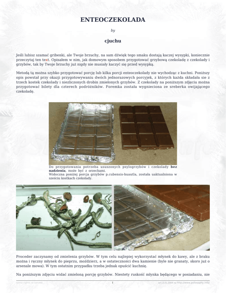 ENTEOCZEKOLADA by cjuchu Jeśli lubisz szamać gribenki, ale Twoje brzuchy, na sam dźwięk tego smaku dostają kaczej wysypki, koniecznie przeczytaj ten text. Opisałem w nim, jak domowym sposobem przygotować grzybową czekoladę z czekolady i grzybów, tak by Twoje brzuchy już nigdy nie musiały kaczyć się przed wysypką. Metodą tą można szybko przygotować porcję lub kilka porcji enteoczekolady nie wychodząc z kuchni. Poniższy opis powstał przy okazji przygotowywaniu dwóch jednorazowych porcyjek, z których każda składała sie z trzech kostek czekolady i niezliczonych drobin zmielonych grzybów. Z czekolady na poniższym zdjęciu można przygotować bilety dla czterech podróżników. Foremka została wygnieciona ze sreberka owijającego czekoladę. Do przygotowania potrzeba ususzonych psylogrzybów i czekolady bez nadzienia, może być z orzechami. Widoczna poniżej porcja grzybów p.cubensis-huautla, została uaktualniona w sześciu kostkach czekolady. Proceder zaczynamy od zmielenia grzybów. W tym celu najlepiej wykorzystać młynek do kawy, ale z braku można i ręczny młynek do pieprzu, moździerz, a w ostateczności dwa kamienie (byle nie granaty, skoro już o arsenale mowa). W tym ostatnim przypadku trzeba jednak opuścić kuchnię. Na poniższym zdjęciu widać zmieloną porcję grzybów. Niestety ruskość młynka będącego w posiadaniu, nie soma rights re-served 1 od 13.01.2004 na http://www.psilosophy.info/ enteoczekolada www.psilosophy.info/nofbgmqwbwjjbrcrctahbpgz pozwoliła zrobić tego dokładniej, ale nawet tak grube drobiny nie były wyczuwalne w przygotowanej czekoladzie. W celu połączenia grzybów z czekoladą trzeba doprowadzić ją do stanu płynnego. Ogólnie mówiąc, aby właściwie ją rozpuścić, trzeba ją umieścić w odpowiedniej temperaturze. Temperatura nie może być za wysoka, ponieważ cukier zawarty w czekoladzie szybko zamieni się w karmel, ani za niska ponieważ czekolada się nie rozpuści. Im dłużej męczymy czekoladę w zbyt wysokiej temperaturze, tym więcej cukru zmienia się w karmel, przez co czekolada staje się coraz twardsza, co uniemożliwia wymieszanie jej ze zmielonymi gribensonami. Dlatego czekolady nie należy rozpuszczać ani w garnku ani na patelni. Poniżej dwa zdjęcia: po lewo czekolada potraktowana patelnią - bardzo szybko zamieniła się w karmel, po prawo czekolada wystawiona na odpowiednią temperaturę - pięknie się upłynniła. Tak więc łamiemy czekoladzie kostki i wrzucamy je do szklanego naczynia. W tym przypadku jest to duralexowy szklanko-kubek. soma rights re-served 2 od 13.01.2004 na http://www.psilosophy.info/ enteoczekolada www.psilosophy.info/nofbgmqwbwjjbrcrctahbpgz Naczynie wkładamy do jakiejś miski lub garnka i wlewamy do niego wrzątek. Jak nie widać na poniższym zdjęciu, woda wlana jest jedynie do miski. Do szklanki z kostkami niczego na razie nie wlewamy. W celu zmniejszenia stygnięcia i zwiększenia temperatury w kubku z czekoladą, całość przykrywamy talerzem lub, w przypadku garnka, pokrywką i czekamy aż czekolada się rozpuści. Do rozpuszczonej czekolady wsypujemy zmielone grzyby i mieszamy je z czekoladą. Ponieważ wsypana masa jest sucha, czekolada traci płynną konsystencję. Jeśli chcemy posłużyć się czekoladą do wypełnienia formy, należy zwiększyć jej współczynnik upłynnienia ;) Wystarczy dolać trochę ciepłego płynu. Jeśli woda w misce/garnku jest czysta to można z niej skorzystać, ale można również dolać ogrzanego mleka. Dolewany płyn musi być ciepły, w przeciwnym wypadku czekolada zastygnie w kubku. Jeśli cały zabieg wykonujemy starannie i w miarę powoli, może zaistnieć konieczność dolania dodatkowej porcji wrzątku do miski, celem dogrzania czekolady. Kubek z kostkami czekolady można ewentualnie włożyć do garnka z wrzątkiem, i postawić na gazie. Trzeba jedynie tak zdozować temperaturę, by nie skarmelizować lub co gorsza nie zwęglić czekolady. Przy saunie pozagazowej nie ma możliwości skarmelizowania, ponieważ nie osiąga się tak wysokiej temperatury, dlatego jest to sposób pewniejszy. Po doprowadzeniu czekolady do właściwej płynności przelewamy ją w formę, lub w cokolwiek, i wstawiamy do lodówki celem szybszego skrzepnięcia. Jeśli za bardzo rozrzedzimy czekoladę, to może nie skrzepnąć. Dlatego rozrzedzać trzeba z wyczuciem. Informujemy pozostałych operatorów lodówki, o "toxyczności" umieszczonego w niej ładunku, ponieważ nie chcemy przypadkowiczów ściągać z księżyca, i czekamy aż czekolada skostnieje. soma rights re-served 3 od 13.01.2004 na http://www.psilosophy.info/ enteoczekolada www.psilosophy.info/nofbgmqwbwjjbrcrctahbpgz I gotowe. Zdjęcie poniżej na lewo - czekolada w "formie" przed lodówką, ugłaskana łyżeczką, a na prawo po lodówce - skrzepiona i dyskretnie formą naznaczona. Smak grzybów został wyeliminowany całkowicie, co mogą potwierdzić palce na najniższej fotografii. _ Voila und el Bon Appetit _ soma rights re-served 4 od 13.01.2004 na http://www.psilosophy.info/