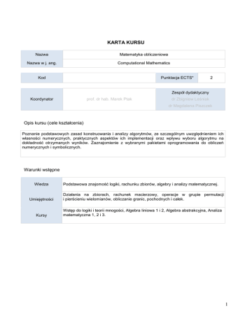KARTA KURSU Nazwa Matematyka obliczeniowa Nazwa w j. ang. Computational Mathematics Kod Punktacja ECTS* 2 Zespół dydaktyczny Koordynator prof. dr hab. Marek Ptak dr Zbigniew Leśniak dr Magdalena Piszczek Opis kursu (cele kształcenia) Poznanie podstawowych zasad konstruowania i analizy algorytmów, ze szczególnym uwzględnieniem ich własności numerycznych, praktycznych aspektów ich implementacji oraz wpływu wyboru algorytmu na dokładność otrzymanych wyników. Zaznajomienie z wybranymi pakietami oprogramowania do obliczeń numerycznych i symbolicznych. Warunki wstępne Wiedza Podstawowa znajomość logiki, rachunku zbiorów, algebry i analizy matematycznej. Umiejętności Działania na zbiorach, rachunek macierzowy, operacje w grupie permutacji i pierścieniu wielomianów, obliczanie granic, pochodnych i całek. Kursy Wstęp do logiki i teorii mnogości, Algebra liniowa 1 i 2, Algebra abstrakcyjna, Analiza matematyczna 1, 2 i 3. 1 Efekty kształcenia Efekt kształcenia dla kursu Wiedza W01 Zdobycie i pogłębienie wiedzy o zasadach K_W03, K_W08 modelowania matematycznego, metodach konstruowania, zapisywania i implementacji algorytmów oraz ich analizy w aspekcie poprawności semantycznej i złożoności obliczeniowej. W02 Poznanie sposobu badania uwarunkowania K_W08 problemu numerycznego i stabilności numerycznej a posteriori (poprawności numerycznej) algorytmu rozwiązującego problem numeryczny. W03 Poznanie możliwości wybranych programów do K_W09, K_W08 obliczeń numerycznych i symbolicznych oraz środowisk programistycznych. Efekt kształcenia dla kursu Umiejętności Odniesienie do efektów kierunkowych U01 Student potrafi rozpoznawać i specyfikować problemy algorytmiczne oraz konstruować modele matematyczne pozwalające doprowadzić proces rozwiązywania problemu do rozwiązań problemów znanych lub prostych i efektywnych własnych rozwiązań algorytmicznych. U02 Potrafi konstruować algorytmy i zapisywać je w pseudojęzyku, projektować schematy blokowe algorytmów i diagramy klas (również z wykorzystaniem programu MS Visio) oraz zapisywać algorytmy w językach programowania wysokiego poziomu: C#, C++ lub Java. U03 Potrafi kompilować, uruchamiać i testować napisane programy w środowiskach programistycznych: Microsoft Visual Studio lub NetBeans IDE, a także w edytorze języka Visual Basic dla Aplikacji wchodzącym w skład arkusza kalkulacyjnego Excel. U04 Potrafi badać poprawność semantyczną i wyznaczać złożoność obliczeniową prostszych algorytmów numerycznych oraz analizować je w aspekcie stabilności numerycznej a posteriori i wiarygodności otrzymywanych wyników uwzględniając wskaźnik uwarunkowania problemu. U05 Potrafi korzystać z pakietów matematycznych Scilab i Maxima (oraz GAP) w zakresie zasadniczych funkcji tych pakietów. Odniesienie do efektów kierunkowych K_U25, K_U29 K_U26 K_U27 K_U10, K_U16 K_U12, K_U15, K_U28 2 Odniesienie do efektów kierunkowych Efekt kształcenia dla kursu Kompetencje społeczne K01 Student jest otwarty na złożoność problemów, K_K01, K_K06 z którymi może się spotkać oraz stara się je rozwiązywać i obiektywnie oceniać otrzymane wyniki w oparciu o poznane metody i szukanie wskazówek w literaturze. K02 Potrafi pracować w zespole w zakresie K_K03 opracowywania projektów rozwiązywania problemów. Organizacja Forma zajęć Liczba godzin Ćwiczenia w grupach Wykład (W) A 15 K L 15 S P E 15 Opis metod prowadzenia zajęć Wykład częściowo z wykorzystaniem środków multimedialnych i pokazem działania poszczególnych programów komputerowych. Ćwiczenia z zadaniami rozwiązywanymi na tablicy oraz z użyciem komputera w pracowni komputerowej. Konsultacje. W01 W02 W03 U01 U02 U03 U04 U05 K01 K02 x x x x x x x x x x x x x x x x x x x x x x x x x x x x x x x x x x x Inne Egzamin pisemny Egzamin ustny Praca pisemna (esej) Referat Udział w dyskusji Projekt grupowy Projekt indywidualny Praca laboratoryjna Zajęcia terenowe Ćwiczenia w szkole Gry dydaktyczne E – learning Formy sprawdzania efektów kształcenia 3 Zaliczenie ćwiczeń audytoryjnych w oparciu o aktywne uczestnictwo w zajęciach oraz ocenę z pracy pisemnej. Kryteria oceny Zaliczenie ćwiczeń laboratoryjnych na podstawie wykonania projektu: algorytmu numerycznego oraz implementacji skonstruowanego algorytmu w wybranym języku programowania. Uwagi Treści merytoryczne (wykaz tematów) Problem algorytmiczny i jego specyfikacja, model matematyczny problemu. Algorytmy - własności, sposoby zapisu i klasyfikacja algorytmów. Metody konstruowania algorytmów. Przykłady algorytmów klasycznych. Analiza algorytmów w aspekcie poprawności semantycznej i złożoności obliczeniowej, prostota a efektywność algorytmów. Podstawowe abstrakcyjne struktury danych i ich implementacja. Implementacja algorytmów w językach programowania wysokiego poziomu: C#, C++, Java. Środowiska programistyczne: Microsoft Visual Studio, NetBeans IDE. Arytmetyka zmiennopozycyjna, błędy bezwzględne i względne. Arytmetyka przedziałowa. Uwarunkowanie problemu numerycznego – wskaźnik uwarunkowania. Własności algorytmów numerycznych – stabilność numeryczna a posteriori (poprawność numeryczna). Realizacja algorytmów numerycznych w arkuszu kalkulacyjnym Excel, edytor języka Visual Basic dla Aplikacji. Wykorzystanie programu do obliczeń numerycznych na przykładzie programu Scilab, porównanie pakietów Scilab i Matlab. Wykorzystanie komputerowych systemów obliczeń symbolicznych (systemów algebry komputerowej CAS) na przykładzie programów Maxima i GAP. 4 Wykaz literatury podstawowej 1. A. Aho, J. Hopcroft, J. Ullman, Projektowanie i analiza algorytmów, Helion, Gliwice 2003. 2. A. Brozi, Scilab w przykładach, Nakom, Poznań 2007. 3. D. Kincaid, W. Cheney, Analiza numeryczna, WNT, Warszawa 2006. 4. E. Krok, Z. Stempnakowski, Podstawy algorytmów, Schematy blokowe, Difin, Warszawa 2008. Wykaz literatury uzupełniającej 1. A. Aho, J. Hopc