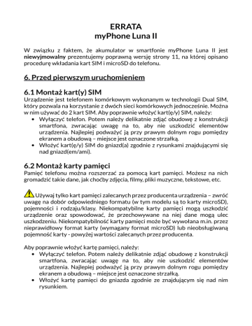 ERRATA myPhone Luna II W związku z faktem, że akumulator w smartfonie myPhone Luna II jest niewyjmowalny prezentujemy poprawną wersję strony 11, na której opisano procedurę wkładania kart SIM i microSD do telefonu. 6. Przed pierwszym uruchomieniem 6.1 Montaż kart(y) SIM Urządzenie jest telefonem komórkowym wykonanym w technologii Dual SIM, który pozwala na korzystanie z dwóch sieci komórkowych jednocześnie. Można w nim używać do 2 kart SIM. Aby poprawnie włożyć kart(ę/y) SIM, należy: • Wyłączyć telefon. Potem należy delikatnie zdjąć obudowę z konstrukcji smartfona, zwracając uwagę na to, aby nie uszkodzić elementów urządzenia. Najlepiej podważyć ją przy prawym dolnym rogu pomiędzy ekranem a obudową – miejsce jest oznaczone strzałką. • Włożyć kart(ę/y) SIM do gniazd(a) zgodnie z rysunkami znajdującymi się nad gniazd(em/ami). 6.2 Montaż karty pamięci Pamięć telefonu można rozszerzać za pomocą kart pamięci. Możesz na nich gromadzić takie dane, jak choćby zdjęcia, filmy, pliki muzyczne, tekstowe, etc. Używaj tylko kart pamięci zalecanych przez producenta urządzenia – zwróć uwagę na dobór odpowiedniego formatu (w tym modelu są to karty microSD), pojemności i rodzaju/klasy. Niekompatybilne karty pamięci mogą uszkodzić urządzenie oraz spowodować, że przechowywane na niej dane mogą ulec uszkodzeniu. Niekompatybilność karty pamięci może być wywołana m.in. przez nieprawidłowy format karty (wymagany format microSD) lub nieobsługiwaną pojemność karty - powyżej wartości zalecanych przez producenta. Aby poprawnie włożyć kartę pamięci, należy: • Wyłączyć telefon. Potem należy delikatnie zdjąć obudowę z konstrukcji smartfona, zwracając uwagę na to, aby nie uszkodzić elementów urządzenia. Najlepiej podważyć ją przy prawym dolnym rogu pomiędzy ekranem a obudową – miejsce jest oznaczone strzałką. • Włożyć kartę pamięci do gniazda zgodnie ze znajdującym się nad nim rysunkiem.