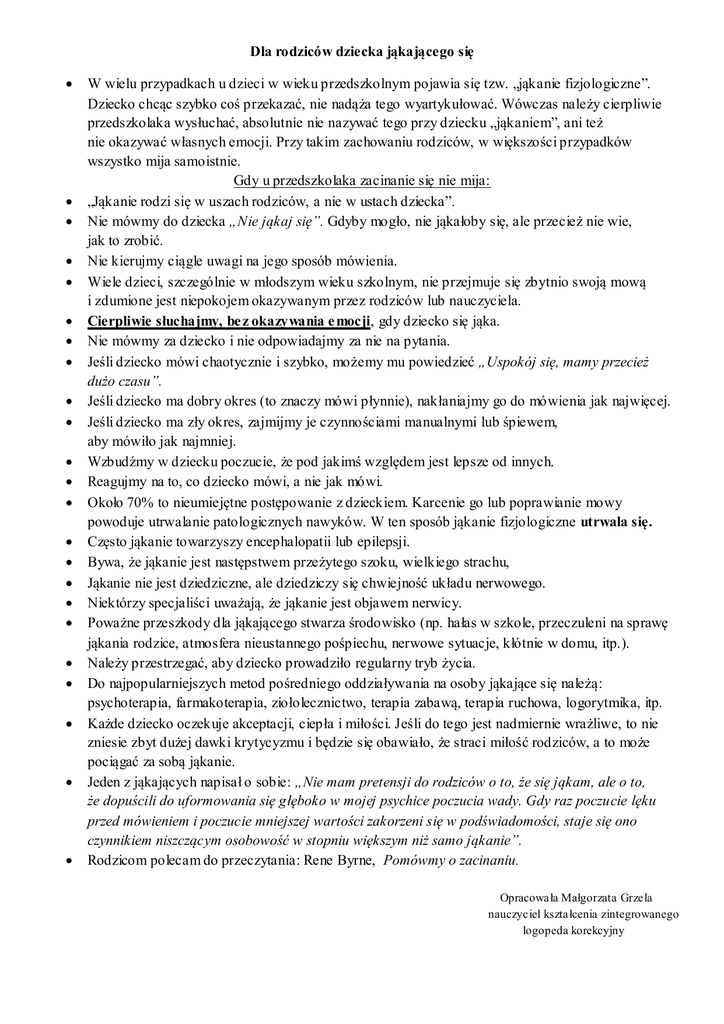 Dla rodziców dziecka jąkającego się W wielu przypadkach u dzieci w wieku przedszkolnym pojawia się tzw. „jąkanie fizjologiczne”. Dziecko chcąc szybko coś przekazać, nie nadąża tego wyartykułować. Wówczas należy cierpliwie przedszkolaka wysłuchać, absolutnie nie nazywać tego przy dziecku „jąkaniem”, ani też nie okazywać własnych emocji. Przy takim zachowaniu rodziców, w większości przypadków wszystko mija samoistnie. Gdy u przedszkolaka zacinanie się nie mija: „Jąkanie rodzi się w uszach rodziców, a nie w ustach dziecka”. Nie mówmy do dziecka „Nie jąkaj się”. Gdyby mogło, nie jąkałoby się, ale przecież nie wie, jak to zrobić. Nie kierujmy ciągle uwagi na jego sposób mówienia. Wiele dzieci, szczególnie w młodszym wieku szkolnym, nie przejmuje się zbytnio swoją mową i zdumione jest niepokojem okazywanym przez rodziców lub nauczyciela. Cierpliwie słuchajmy, be z okazywania e mocji, gdy dziecko się jąka. Nie mówmy za dziecko i nie odpowiadajmy za nie na pytania. Jeśli dziecko mówi chaotycznie i szybko, możemy mu powiedzieć „Uspokój się, mamy przecież dużo czasu”. Jeśli dziecko ma dobry okres (to znaczy mówi płynnie), nakłaniajmy go do mówienia jak najwięcej. Jeśli dziecko ma zły okres, zajmijmy je czynnościami manualnymi lub śpiewem, aby mówiło jak najmniej. Wzbudźmy w dziecku poczucie, że pod jakimś względem jest lepsze od innych. Reagujmy na to, co dziecko mówi, a nie jak mówi. Około 70% to nieumiejętne postępowanie z dzieckiem. Karcenie go lub poprawianie mowy powoduje utrwalanie patologicznych nawyków. W ten sposób jąkanie fizjologiczne utrwala się. Często jąkanie towarzyszy encephalopatii lub epilepsji. Bywa, że jąkanie jest następstwem przeżytego szoku, wielkiego strachu, Jąkanie nie jest dziedziczne, ale dziedziczy się chwiejność układu nerwowego. Niektórzy specjaliści uważają, że jąkanie jest objawem nerwicy. Poważne przeszkody dla jąkającego stwarza środowisko (np. hałas w szkole, przeczuleni na sprawę jąkania rodzice, atmosfera nieustannego pośpiechu, nerwowe sytuacje, kłótnie w domu, itp.). Należy przestrzegać, aby dziecko prowadziło regularny tryb życia. Do najpopularniejszych metod pośredniego oddziaływania na osoby jąkające się należą: psychoterapia, farmakoterapia, ziołolecznictwo, terapia zabawą, terapia ruchowa, logorytmika, itp. Każde dziecko oczekuje akceptacji, ciepła i miłości. Jeśli do tego jest nadmiernie wrażliwe, to nie zniesie zbyt dużej dawki krytycyzmu i będzie się obawiało, że straci miłość rodziców, a to może pociągać za sobą jąkanie. Jeden z jąkających napisał o sobie: „Nie mam pretensji do rodziców o to, że się jąkam, ale o to, że dopuścili do uformowania się głęboko w mojej psychice poczucia wady. Gdy raz poczucie lęku przed mówieniem i poczucie mniejszej wartości zakorzeni się w podświadomości, staje się ono czynnikiem niszczącym osobowość w stopniu większym niż samo jąkanie”. Rodzicom polecam do przeczytania: Rene Byrne, Pomówmy o zacinaniu. Opracowała Małgorzata Grzela nauczyciel kształcenia zintegrowanego logopeda korekcyjny