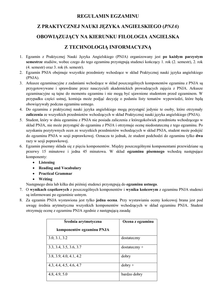 REGULAMIN EGZAMINU Z PRAKTYCZNEJ NAUKI JĘZYKA ANGIELSKIEGO (PNJA) OBOWIĄZUJĄCY NA KIERUNKU FILOLOGIA ANGIELSKA Z TECHNOLOGIĄ INFORMACYJNĄ 1. Egzamin z Praktycznej Nauki Języka Angielskiego (PNJA) organizowany jest po każdym parzystym semestrze studiów, wobec czego do tego egzaminu przystępują studenci kończący 1. rok (2. semestr), 2. rok (4. semestr) oraz 3. rok (6. semestr). 2. Egzamin PNJA obejmuje wszystkie przedmioty wchodzące w skład Praktycznej nauki języka angielskiego (PNJA). 3. Arkusze egzaminacyjne z zadaniami wchodzące w skład poszczególnych komponentów egzaminu z PNJA są przygotowywane i sprawdzane przez nauczycieli akademickich prowadzących zajęcia z PNJA. Arkusze egzaminacyjne są tajne do momentu egzaminu i nie mogą być ujawnione studentom przed egzaminem. W przypadku części ustnej, komisja może podjąć decyzję o podaniu listy tematów wypowiedzi, które będą obowiązywały podczas egzaminu ustnego. 4. Do egzaminu z praktycznej nauki języka angielskiego mogą przystąpić jedynie te osoby, które otrzymały zaliczenia ze wszystkich przedmiotów wchodzących w skład Praktycznej nauki języka angielskiego (PNJA). 5. Student, który w dniu egzaminu z PNJA nie posiada zaliczenia z któregokolwiek przedmiotu wchodzącego w skład PNJA, nie może przystąpić do egzaminu z PNJA i otrzymuje ocenę niedostateczną z tego egzaminu. Po uzyskaniu pozytywnych ocen ze wszystkich przedmiotów wchodzących w skład PNJA, student może podejść do egzaminu PNJA w sesji poprawkowej. Oznacza to jednak, że student podchodzi do egzaminu tylko dwa razy w sesji poprawkowej. 6. Egzamin pisemny składa się z pięciu komponentów. Między poszczególnymi komponentami przewidziane są przerwy 15 minutowe i jedna 45 minutowa. W skład egzaminu pisemnego wchodzą następujące komponenty: Listening Reading and Vocabulary Practical Grammar Writing Następnego dnia lub kilka dni później studenci przystępują do egzaminu ustnego. 7. O wynikach cząstkowych z poszczególnych komponentów i wyniku końcowym z egzaminu PNJA studenci są informowani po egzaminie ustnym. 8. Za egzamin PNJA wystawiona jest tylko jedna ocena. Przy wystawianiu oceny końcowej brana jest pod uwagę średnia arytmetyczna wszystkich komponentów wchodzących w skład egzaminu PNJA. Student otrzymuję ocenę z egzaminu PNJA zgodnie z następującą zasadą: Średnia arytmetyczna Ocena z egzaminu komponentów egzaminu PNJA 3.0, 3.1, 3.2 dostateczny 3.3, 3.4, 3.5, 3.6, 3.7 dostateczny + 3.8, 3.9, 4.0, 4.1, 4.2 dobry 4.3, 4.4, 4.5, 4.6, 4.7 dobry + 4.8, 4.9, 5.0 bardzo dobry 9. Niezdanie któregokolwiek z komponentów powoduje niezdanie całego egzaminu! Student otrzymuje wówczas ocenę niedostateczną z egzaminu PNJA. W sesji poprawkowej, poprawia jednak tylko te komponenty, za które otrzymał ocenę niedostateczną, a jego ocena końcowa, po zaliczeniu egzaminu poprawkowego, jest ustalana wg zasady przedstawionej w tabeli powyżej. 10. Wyniki z poszczególnych części ważne są tylko w ciągu jednego roku akademickiego, tzn. w ciągu dwóch następujących po sobie sesji: podstawowej oraz poprawkowej. Aby zdać egzamin z PNJA należy osiągnąć min. 50% z każdego komponentu egzaminu pisemnego i min. 50% punktów na egzaminie ustnym. 11. Studentom przysługuje prawo do wglądu w swoje arkusze egzaminacyjne po zakończeniu egzaminu. 12. Terminy egzaminu praktycznego, ze względu na swoją logistykę i liczbę zaangażowanych osób, są nieprzesuwalne. KRYTERIA OCENIANIA Wszystkie komponenty egzaminu PNJA są oceniane wg następującej skali: 100% - 92% - bardzo dobry 91% - 83% - dobry+ 82% - 73% - dobry 72% - 63% - dostateczny+ 62% - 50% - dostateczny STRUKTURA EGZAMINU USTNEGO (Speaking) Część ustna egzaminu trwa ok. 15 minut. Po wylosowaniu zestawu zdający przystępuje/ą do egzaminu. Nie przewidziano dodatkowego czasu na zapoznanie się z treścią całego zestawu przed odpowiedzią. I ROK - Egzamin ma formę rozmowy dwóch studentów przed Komisją egzaminacyjną. Studenci mają do wykonania dwa zadania z poziomu B2: (1) rozwiązanie problemu na podstawie materiału stymulującego; (2) udzielenie odpowiedzi na pytania związane z tematyką przedstawioną w zadaniu pierwszym. II ROK - Egzamin ma formę rozmowy dwóch studentów przed Komisją egzaminacyjną. Studenci mają do wykonania dwa zadania z poziomu B2+: (1) rozwiązanie problemu na podstawie materiału stymulującego; (2) udzielenie odpowiedzi na pytania związane z tematyką przedstawioną w zadaniu pierwszym. III ROK – Egzamin ma formę rozmowy studenta z Komisją egzaminacyjną. Student ma za zadanie wypowiedzieć się na dwa wylosowane tematy z poziomu C1. STRUKTURA EGZAMINU Z PISANIA (Writing) Podczas egzaminu z Pisania zadaniem studentów jest skonstruowanie wypowiedzi pisemnej zgodnie z poleceniem. Każdy zestaw zawiera tematy do wyboru. I ROK – Po pierwszym roku studiów zadaniem studentów jest napisanie eseju zawierającego od 250 do 300 słów na jeden z trzech tematów: opinion essay, for and against essay, problem-solving essay. II ROK – Po drugim roku studiów studenci muszą w ciągu 90 min. wykazać się umiejętnością pisania artykułu zawierającego min. 300 słów. opartego na materiale źródłowym. III ROK – Po trzecim roku studiów studenci piszą rozprawkę-dyskurs (discursive essay - 240-280 słów) w oparciu o 2 teksty i albo raport albo recenzję składającą się z 280-320 słów. Egzamin na tym poziomie trwa 2 godziny. KRYTERIA OCENIANIA CZĘŚCI USTNEJ EGZAMINU Przy ocenianiu części ustnej egzaminu, brane są pod uwagę następujące elementy: Wymowa Płynność Słownictwo Struktury gramatyczne Umiejętności komunikacyjne 0 1 2 3 4 0 1 2 3 4 0 1 2 3 4 0 1 2 3 4 0 1 2 3 4 Ilość zdobytych punktów Ocena końcowa z egzaminu ustnego wystawiana jest wg następującej skali: 25 – 23 pkt. – bardzo dobry 22 – 21 pkt. – dobry+ 20 – 18 pkt. – dobry 17 – 16 pkt. – dostateczn