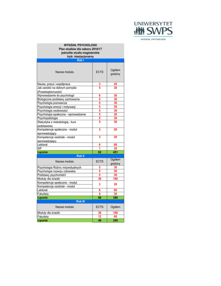 WYDZIAŁ PSYCHOLOGII Plan studiów dla naboru 2016/17 jednolite studia magisterskie tryb: niestacjonarny Rok I Nazwa modułu Nauka, praca i współpraca Jak zarobić na dobrym pomyśle (Przedsiębiorczość) Wprowadzenie do psychologii Biologiczne podstawy zachowania Psychologia poznawcza Psychologia emocji i motywacji Psychologia osobowości Psychologia społeczna - wprowadzenie Psychopatologia Statystyka z metodologią - kurs podstawowy Kompetencje społeczne - moduł wprowadzający Kompetencje osobiste - moduł wprowadzający Lektorat WF Łącznie Rok II Nazwa modułu Psychologia Różnic indywidualnych Psychologia rozwoju człowieka Podstawy psychometrii Moduły dla ścieżki Kompetencje społeczne - moduł Kompetencje osobiste - moduł Lektorat Fakultety Łącznie Rok III Nazwa modułu Moduły dla ścieżki Fakultety Łącznie ECTS Ogółem godziny 3 5 45 30 6 5 5 5 5 5 5 5 36 30 30 30 30 30 30 30 3 20 3 20 6 1 62 60 30 451 5 5 5 36 Ogółem godziny 30 30 30 180 3 20 6 6 66 60 30 380 ECTS Ogółem 36 12 48 180 60 240 ECTS Rok IV Nazwa modułu ECTS Ogółem 15 5 7 90 30 30 7 30 10 10 10 64 60 60 90 390 ECTS Ogółem Moduły dla specjalności Summa psychologiae Etyka zawodowa psychologa Seminarium magisterskie Fakultety Praktyka psychologiczna Aktywność naukowa lub społeczna 15 7 7 10 5 10 90 30 30 60 30 90 Łącznie 60 330 SUMA 300 1791 Moduły dla specjalności Język angielski w zastosowaniu Statystyka z metodologią - kurs Diagnoza psychologiczna c d Diagnoza psychologiczna Seminarium magisterskie Fakultety Praktyka psychologiczna Łącznie Rok V Nazwa modułu 6 WYDZIAŁ PSYCHOLOGII Szczegółowy Plan Modułów Specjalnościowych 2016/17 jednolite studia magisterskie tryb: niestacjonarny Specjalność PSYCHOLOGIA ZMIANY: KONFLIKT- KRYZYSWSPÓŁPRACA ROK IV Nazwa modułu ECTS Ogółem godziny 5 30 Umiejętność pracy z grupą i jednostką 5 30 Negocjacje i mediacje 5 30 Człowiek współczesny jako podmiot i przedmiot zmian: innowacje technologiczne Łącznie 15 90 Nazwa modułu ECTS Twórczy lider Wspomaganie współczesnej rodziny Psycholog społeczny wobec współczesnych zjawisk w Polsce Łącznie 5 5 5 Ogółem godziny 30 30 30 15 90 SUMA 30 180 ROK V