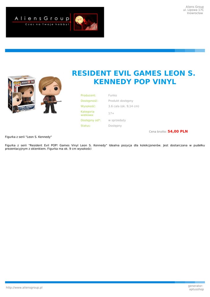 Aliens Group ul. Lipowa 17C Inowrocław RESIDENT EVIL GAMES LEON S. KENNEDY POP VINYL Producent: Funko Dostępność: Produkt dostępny Wysokość: 3.6 cala (ok. 9,14 cm) Kategoria wiekowa: 17+ Dostępny od*: w sprzedaży Status: Dostępny Cena brutto: 54,00 PLN Figurka z serii "Leon S. Kennedy" Figurka z serii "Resident Evil POP! Games Vinyl Leon S. Kennedy" Idealna pozycja dla kolekcjonerów. Jest dostarczana w pudełku prezentacyjnym z okienkiem. Figurka ma ok. 9 cm wysokości http://www.aliensgroup.pl generator: aptusshop