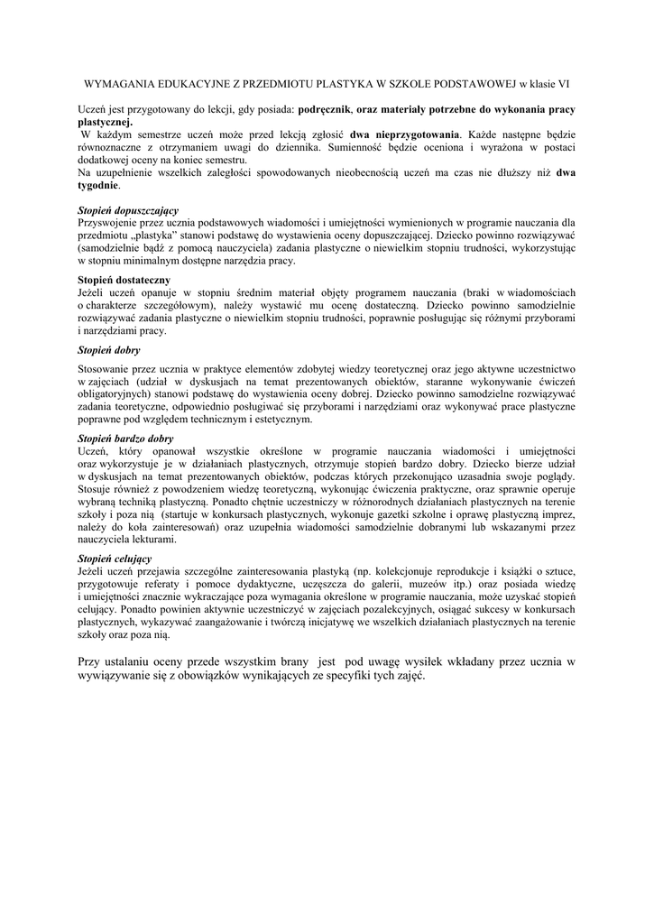 WYMAGANIA NA POSZCZEGÓLNE OCENY KLASA VI PLASTYKA