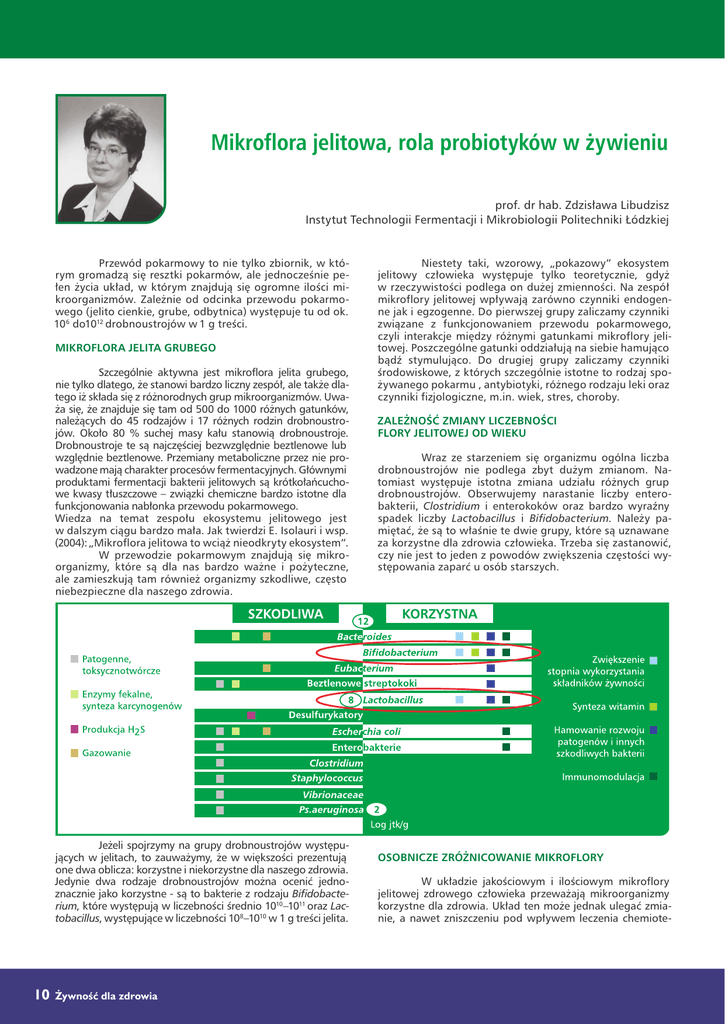 Mikroflora jelitowa, rola probiotyków w żywieniu prof. dr hab. Zdzisława Libudzisz Instytut Technologii Fermentacji i Mikrobiologii Politechniki Łódzkiej Przewód pokarmowy to nie tylko zbiornik, w którym gromadzą się resztki pokarmów, ale jednocześnie pełen życia układ, w którym znajdują się ogromne ilości mikroorganizmów. Zależnie od odcinka przewodu pokarmowego (jelito cienkie, grube, odbytnica) występuje tu od ok. 106 do1012 drobnoustrojów w 1 g treści. MIKROFLORA JELITA GRUBEGO Szczególnie aktywna jest mikroflora jelita grubego, nie tylko dlatego, że stanowi bardzo liczny zespół, ale także dlatego iż składa się z różnorodnych grup mikroorganizmów. Uważa się, że znajduje się tam od 500 do 1000 różnych gatunków, należących do 45 rodzajów i 17 różnych rodzin drobnoustrojów. Około 80 % suchej masy kału stanowią drobnoustroje. Drobnoustroje te są najczęściej bezwzględnie beztlenowe lub względnie beztlenowe. Przemiany metaboliczne przez nie prowadzone mają charakter procesów fermentacyjnych. Głównymi produktami fermentacji bakterii jelitowych są krótkołańcuchowe kwasy tłuszczowe – związki chemiczne bardzo istotne dla funkcjonowania nabłonka przewodu pokarmowego. Wiedza na temat zespołu ekosystemu jelitowego jest w dalszym ciągu bardzo mała. Jak twierdzi E. Isolauri i wsp. (2004): „Mikroflora jelitowa to wciąż nieodkryty ekosystem”. W przewodzie pokarmowym znajdują się mikroorganizmy, które są dla nas bardzo ważne i pożyteczne, ale zamieszkują tam również organizmy szkodliwe, często niebezpieczne dla naszego zdrowia. Jeżeli spojrzymy na grupy drobnoustrojów występujących w jelitach, to zauważymy, że w większości prezentują one dwa oblicza: korzystne i niekorzystne dla naszego zdrowia. Jedynie dwa rodzaje drobnoustrojów można ocenić jednoznacznie jako korzystne - są to bakterie z rodzaju Bifidobacterium, które występują w liczebności średnio 1010–1011 oraz Lactobacillus, występujące w liczebności 108–1010 w 1 g treści jelita. 10 Żywność dla zdrowia Niestety taki, wzorowy, „pokazowy” ekosystem jelitowy człowieka występuje tylko teoretycznie, gdyż w rzeczywistości podlega on dużej zmienności. Na zespół mikroflory jelitowej wpływają zarówno czynniki endogenne jak i egzogenne. Do pierwszej grupy zaliczamy czynniki związane z funkcjonowaniem przewodu pokarmowego, czyli interakcje między różnymi gatunkami mikroflory jelitowej. Poszczególne gatunki oddziałują na siebie hamująco bądź stymulująco. Do drugiej grupy zaliczamy czynniki środowiskowe, z których szczególnie istotne to rodzaj spożywanego pokarmu , antybiotyki, różnego rodzaju leki oraz czynniki fizjologiczne, m.in. wiek, stres, choroby. ZALEŻNOŚĆ ZMIANY LICZEBNOŚCI FLORY JELITOWEJ OD WIEKU Wraz ze starzeniem się organizmu ogólna liczba drobnoustrojów nie podlega zbyt dużym zmianom. Natomiast występuje istotna zmiana udziału różnych grup drobnoustrojów. Obserwujemy narastanie liczby enterobakterii, Clostridium i enterokoków oraz bardzo wyraźny spadek liczby Lactobacillus i Bifidobacterium. Należy pamiętać, że są to właśnie te dwie grupy, które są uznawane za korzystne dla zdrowia człowieka. Trzeba się zastanowić, czy nie jest to jeden z powodów zwiększenia częstości występowania zaparć u osób starszych. OSOBNICZE ZRÓŻNICOWANIE MIKROFLORY W układzie jakościowym i ilościowym mikroflory jelitowej zdrowego człowieka przeważają mikroorganizmy korzystne dla zdrowia. Układ ten może jednak ulegać zmianie, a nawet zniszczeniu pod wpływem leczenia chemiote- rapeutykami, infekcji wirusowych czy bakteryjnych. Zmienia się również pod wpływem rodzaju diety, stanu zdrowia, wieku czy stresu. Jeżeli zastanowimy się, jaka jest rozpiętość występowania poszczególnych grup mikroorganizmów w przewodzie pokarmowym, to na podstawie literatury można stwierdzić, że różnice w liczebności poszczególnych rodzajów mogą sięgać nawet 7–8 rzędów wielkości. Również znacznemu zróżnicowaniu podlega liczba bakterii korzystnych dla naszego zdrowia. Zależnie od człowieka poziom bifidobakterii w 1g treści jelita może wynosić 105, podczas gdy u innych 1013. Wiedza dotycząca zmienności ekosystemu jelitowego i korzystnej roli bakterii fermentacji mlekowej, w szczególności z rodzajów Bifidobacterium i Lactobacillus, stały się podstawą koncepcji probiozy. W zasadzie jej wyjaśnienia, gdyż sama koncepcja liczy już ponad 100 lat. PROBIOTYKI Probioza polega na spożywaniu w odpowiedniej ilości żywych mikroorganizmów, które wywierają korzystny wpływ na zdrowie człowieka. Mikroorganizmy uznawane za probiotyczne, to najczęściej gatunki należące do bakterii fermentacji mlekowej z rodzaju Lactobacillus i Bifidobacterium. Są to grupy bakterii endogennie związanych z mikroflorą jelitową, czyli występujące jako grupy typowe w przewodzie pokarmowym człowieka. Należy jednak pamiętać, że probiotykiem jest szczep bakterii a nie gatunek. W świecie mikroorganizmów, tak jak w całym świecie, zróżnicowanie między różnymi osobnikami jest ogromne. Można to obrazowo porównać do właściwości różnych ras psów: są rasy psów obronnych, pasterskich i wiele innych. Każda z ras ma inne cechy i inne przeznaczenie. Podobnie jest w przypadku probiotyków. Jest to cecha szczepu, a nie właściwość gatunku. Wobec tego, tak jak nie każdy pies jest odpowiedni do wszystkich zadań, tak i nie wszystkie szczepy danego gatunku bakterii wywołują identyczne efekty poprawy stanu zdrowia człowieka. Procedury badań szczepów probiotycznych, kryteria jakie muszą spełniać, zostały ustalone w 2001 i 2002 roku przez grupę roboczą FAO/WHO. W opracowanych przez tę grupę dokumentach dokładnie określono procedury badań oraz oceniono efekty, jakich możemy oczekiwać po spożywaniu bakterii probiotycznych. Procedury badań ujęte w tych dokumen