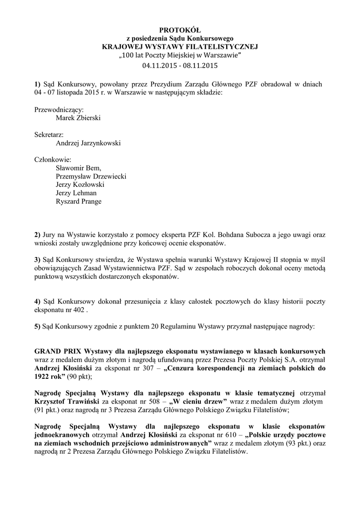 PROTOKÓŁ z posiedzenia Sądu Konkursowego KRAJOWEJ WYSTAWY FILATELISTYCZNEJ „100 lat Poczty Miejskiej w Warszawie” 04.11.2015 - 08.11.2015 1) Sąd Konkursowy, powołany przez Prezydium Zarządu Głównego PZF obradował w dniach 04 - 07 listopada 2015 r. w Warszawie w następującym składzie: Przewodniczący: Marek Zbierski Sekretarz: Andrzej Jarzynkowski Członkowie: Sławomir Bem, Przemysław Drzewiecki Jerzy Kozłowski Jerzy Lehman Ryszard Prange 2) Jury na Wystawie korzystało z pomocy eksperta PZF Kol. Bohdana Subocza a jego uwagi oraz wnioski zostały uwzględnione przy końcowej ocenie eksponatów. 3) Sąd Konkursowy stwierdza, że Wystawa spełnia warunki Wystawy Krajowej II stopnia w myśl obowiązujących Zasad Wystawiennictwa PZF. Sąd w zespołach roboczych dokonał oceny metodą punktową wszystkich dostarczonych eksponatów. 4) Sąd Konkursowy dokonał przesunięcia z klasy całostek pocztowych do klasy historii poczty eksponatu nr 402 . 5) Sąd Konkursowy zgodnie z punktem 20 Regulaminu Wystawy przyznał następujące nagrody: GRAND PRIX Wystawy dla najlepszego eksponatu wystawianego w klasach konkursowych wraz z medalem dużym złotym i nagrodą ufundowaną przez Prezesa Poczty Polskiej S.A. otrzymał Andrzej Kłosiński za eksponat nr 307 – „Cenzura korespondencji na ziemiach polskich do 1922 rok” (90 pkt); Nagrodę Specjalną Wystawy dla najlepszego eksponatu w klasie tematycznej otrzymał Krzysztof Trawiński za eksponat nr 508 – „W cieniu drzew” wraz z medalem dużym złotym (91 pkt.) oraz nagrodą nr 3 Prezesa Zarządu Głównego Polskiego Związku Filatelistów; Nagrodę Specjalną Wystawy dla najlepszego eksponatu w klasie eksponatów jednoekranowych otrzymał Andrzej Kłosiński za eksponat nr 610 – „Polskie urzędy pocztowe na ziemiach wschodnich przejściowo administrowanych” wraz z medalem złotym (93 pkt.) oraz nagrodą nr 2 Prezesa Zarządu Głównego Polskiego Związku Filatelistów. Gratulacje Jury otrzymały dwa eksponaty z klasy historii poczty: - Krzysztofa Piwko za eksponat nr 311 – „Poczty miejskie w okupowanej Polsce 1914 – 1918” wraz z medalem dużym złotym (90 pkt.) oraz nagrodą nr 4 Komitetu Organizacyjnego Wystawy; - Manfreda Schulze za eksponat nr 313 – „Poczty doręczeniowe polskich miast i gmin w General-Gouvernement Warschau w czasie I wojny światowej 1914-1918” wraz z medalem dużym złotym (86 pkt.) oraz nagrodą nr 9 Komitetu Organizacyjnego Wystawy. Szczegółowy wykaz uzyskanych wyróżnień w klasach konkursowych Wystawy oraz wykaz eksponatów klas: honorowej, oficjalnej i sędziów konkursowych podany jest w załączniku, który stanowi integralną część protokołu Sądu Konkursowego. 7) Sąd Konkursowy podkreśla, że znakomitym uzupełnieniem Wystawy są znaczące dla polskiej filatelistyki eksponaty prezentowane w klasie honorowej i oficjalnej. 8) Sąd Konkursowy składa podziękowania Poczcie Polskiej S.A. za sponsoring Wystawy, który pozwolił na jej zorganizowanie, jak również uświetnienie obchodów 100-lecia Poczty Miejskiej w Warszawie w sposób godny tego jubileuszu. 9) Sąd Konkursowy oddaje do dyspozycji Komitetu Organizacyjnego Wystawy nagrody nieprzydzielone przez siebie. 10) Na zakończenie Sąd Konkursowy gratuluje wszystkim wystawcom uzyskanych wyróżnień i dziękuje im za udostępnienie szerokiej rzeszy zwiedzających swoich cennych, a niejednokrotnie unikatowych eksponatów, co pozwoliło na zorganizowanie imprezy stojącej na wysokim poziomie filatelistycznym. 12) Sąd Konkursowy pragnie podziękować współpracującemu z nim ekspertowi PZF za wnikliwą analizę dostarczonych eksponatów. 13) Sąd Konkursowy składa wyrazy uznania i serdeczne podziękowania dla całego Komitetu Organizacyjnego Wystawy, z jego przewodniczącym Kol. Jackiem Kosmalą oraz Kolegów z Okręgu Warszawskiego za wysiłek włożony w zorganizowanie Wystawy, jak również przygotowanie jak najlepszych warunków pracy dla Sądu Konkursowego. Sekretarz Sądu Konkursowego Przewodniczący Sądu Konkursowego Andrzej JARZYNKOWSKI Marek ZBIERSKI Warszawa, dnia 07.11.2015 r. Załącznik KRAJOWA WYSTAWA FILATELISTYCZNA „100 lat Poczty Miejskiej w Warszawie” 05.11.2015 - 08.11.2015 Szczegółowy wykaz wyróżnień w klasach konkursowych Wystawy` oraz wykaz eksponatów klasy honorowego i klasy sędziów konkursowych i ekspertów. Nr Wystawca (okręg) KH 101 102 103 KO 151 152 153 TR 201 202 203 HP 301 302 303 304 Liczba Medal punktów Nagroda KLASA HONOROWA Julian AULEYTNER (O/Warszawski) Jacek KOSMALA (O/ Warszawski) Jim MAZEPA (Polonus) Początki poczty w niepodległej Polsce 1918-1920 6 Poczta w Warszawie do 1920 roku 7 Warszawskie wydanie prowizoryczne 10 KLASA OFICJALNA 121 KS Tytuł eksponatu Eksponat Muzeum P. i T. Wrocław KLASA SĘDZIÓW KONKURSOWYCH Przemysław DRZEWIECKI (O/Bydgoski) Jerzy KOZŁOWSKI (O/Warszawski) Marek ZBIERSKI (O/Wielkopolski) Poczta Armii Polskiej generała Andersa w ZSRR 1941-1942 Warszawa w latach 1915-1939 Dokumentacja obrotu pocztowego w Polsce V 1924 – IX 1939 KLASA TRADYCYJNA Bogdan CYMERYS (O/Warszawski) Roman OKNIŃSKI (O/Warszawski) Manfred SCHULZE (Niemcy) Izrael 1948 – 1960 Poczta miejska w Warszawie w latach 1915-1918 Poczta Miejska Komitetu Obywatelskiego m. st. Warszawy 1915-1918 78 DPZ 81 Z 83 Z 85 DZ 8 88 DZ 11 82 Z 87 DZ KLASA HISTORII POCZTY Janusz BATOR (O/Rzeszowski) Sławomir CHABROS (O/Warszawski) Sławomir CHABROS (O/Warszawski) Jerzy JAKUBIK PRZEMYŚL – historia poczty do 1918 r. Legiony Polskie 1914 – 1917 Walka o niepodległość Polski 1918 – 1921 Przesyłki rejestrowe Królestwa Polskiego 12 305 306 307 308 309 310 311 312 313 314 315 316 317 402 CP 401 403 404 405 TEM 501 502 503 504 505 506 507 508 (O/Warszawski) Adam KĘSTOWICZ (O/Wrocławski) Andrzej KLAMUT (O/Warszawski) Andrzej KŁOSIŃSKI (O/Pomorski) Janusz MANTERYS (O/Beskidzki) Artur MARSY (O/Wrocławski) Roman OKNIŃSKI (O/Warszawski) Krzysztof PIWKO (O/Warszawski) Miło