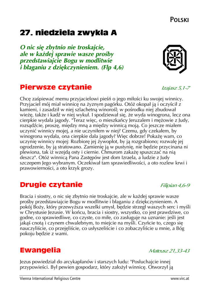 Polski O nic się zbytnio nie troskajcie, ale w każdej sprawie wasze prośby przedstawiajcie Bogu w modlitwie i błaganiu z dziękczynieniem. (Flp 4,6) Chcę zaśpiewać memu przyjacielowi pieśń o jego miłości ku swojej winnicy. Przyjaciel mój miał winnicę na żyznym pagórku. Otóż okopał ją i oczyścił z kamieni, i zasadził w niej szlachetną winorośl; w pośrodku niej zbudował wieżę, także i kadź w niej wykuł. I spodziewał się, że wyda winogrona, lecz ona cierpkie wydała jagody. "Teraz więc, o mieszkańcy Jeruzalem i mężowie z Judy, rozsądźcie, proszę, między mną a między winnicą moją. Co jeszcze miałem uczynić winnicy mojej, a nie uczyniłem w niej? Czemu, gdy czekałem, by winogrona wydała, ona cierpkie dała jagody? Więc dobrze! Pokażę wam, co uczynię winnicy mojej: Rozbiorę jej żywopłot, by ją rozgrabiono; rozwalę jej ogrodzenie, by ją stratowano. Zamienię ją w pustynię, nie będzie przycinana ni plewiona, tak iż wzejdą osty i ciernie. Chmurom zakażę spuszczać na nią deszcz". Otóż winnicą Pana Zastępów jest dom Izraela, a ludzie z Judy szczepem Jego wybranym. Oczekiwał tam sprawiedliwości, a oto rozlew krwi i prawowierności, a oto krzyk grozy. Bracia i siostry, o nic się zbytnio nie troskajcie, ale w każdej sprawie wasze prośby przedstawiajcie Bogu w modlitwie i błaganiu z dziękczynieniem. A pokój Boży, który przewyższa wszelki umysł, będzie strzegł waszych serc i myśli w Chrystusie Jezusie. W końcu, bracia i siostry, wszystko, co jest prawdziwe, co godne, co sprawiedliwe, co czyste, co miłe, co zasługuje na uznanie: jeśli jest jakąś cnotą i czynem chwalebnym, to miejcie na myśli. Czyńcie to, czego się nauczyliście, co przejęliście, co usłyszeliście i co zobaczyliście u mnie, a Bóg pokoju będzie z wami. Jezus powiedział do arcykapłanów i starszych ludu: "Posłuchajcie innej przypowieści. Był pewien gospodarz, który założył winnicę. Otworzył ją Vienna International Religious Centre www.virc.at murem, wykopał w niej prasę, zbudował wieżę, w końcu oddał ją w dzierżawę rolnikom i wyjechał. Gdy nadszedł czas zbiorów, posłał swoje sługi do rolników, by odebrali plon jemu należny. Ale rolnicy chwycili jego sługi i jednego obili, drugiego zabili, trzeciego kamieniami obrzucili. Wtedy posłał inne sługi, więcej niż za pierwszym razem, lecz i z nimi tak samo postąpili. W końcu posłał do nich swego syna, tak sobie myśląc: 'Uszanują mojego syna'. Lecz rolnicy, zobaczywszy syna, mówili do siebie: 'To jest dziedzic; chodźcie, zabijmy go, a posiądziemy jego dziedzictwo'. Chwyciwszy go, wyrzucili z winnicy i zabili. Kiedy więc właściciel winnicy przyjdzie, co uczyni z owymi rolnikami?" Rzekli Mu: "Nędzników marnie wytraci, a winnicę odda w dzierżawę innym rolnikom, takim, którzy mu będą oddawali plon we właściwej porze". Jezus im rzekł: "Czy nigdy nie czytaliście w Piśmie: 'Właśnie ten kamień, który odrzucili budujący, stał się głowicą węgła. Pan to sprawił i jest cudem w naszych oczach'. Dlatego powiadam wam: Królestwo Boże będzie wam zabrane, a dane narodowi, który wyda jego owoce". Przypowieść o złych zbieraczach winogron opisuje moment radykalnego kryzysu w życiu Mesjasza i rozwoju Bożej historii zbawienia względem ludzi. Najpierw Bóg zwracał się do zbieraczy winogron, którzy byli odpowiedzialni za winnicę – Izraela, przez proroków. Wreszcie posłał do nich swojego Syna. W poczuciu niekwestionowanego autorytetu zapowiada Jezus swoim słuchaczom grożący sąd Boży. Winnica musi przynieść owoce; lud Boży powinien i musi uznać Mesjasza, Posłańca Boga. Synowie Izraela nie są jednak lepsi od swoich przodków. Jak ci ostatni odrzucili ówczesnych sprawiedliwych i proroków, tak kapłani i faryzeusze planują zabić Dziedzica umiłowanej winnicy Boga. Z ich powodu utraci naród przywilej "ludu wybranego", ponieważ Przymierze z Bogiem zostało zerwane przez ludzi. Przypowieść jest tak transparentna, że nawet kapłani i faryzeusze zrozumieli o kogo i o co chodzi. Jezus zapowiada niniejszym swoją śmierć. Przypowieść kończy się jednocześnie zapowiedzią nowego Królestwa pod panowaniem Zmartwychwstałego. Bóg utworzy z celników, grzeszników i pogan nowy lud; misja, powierzona Domowi Izraela, zostanie mu zabrana i oddana innym dzierżawcom. Nowy lud stanie jednakże wobec tych samych wyzwań, co stary. Wciąż chodzi bowiem o "owoce", tj. o urzeczywistnienie sprawiedliwości i woli Boga w świecie. Jaki jest ten nowy lud, który Bóg utworzył z Żydów i pogan? Czy jest lepszy od starego? Wybraństwo nie jest przywilejem, który wynosi nas ponad innych lub przekazuje władzę. Jako Kościół mamy dużo większą odpowiedzialność. W oparciu o świadomość, że Bóg jest z nami, winniśmy służyć naszym siostrom i braciom w pokorze i miłości. Nie wolno nam zapomnieć, że Kościół zbudowany został na kamieniu węgielnym, odrzuconym przez budujących. Zwołani przez Odrzuconego, powinniśmy otworzyć się na odrzuconych z tego świata i być gotowymi do podjęcia tego samego losu, co Chrystus. Jeśli wymigujemy się od tej odpowiedzialności, musimy się liczyć z tym, że królestwo Boże zostanie także nam zabrane i powierzone ludowi, który wyda owoce. Vienna International Religious Centre [email protected]