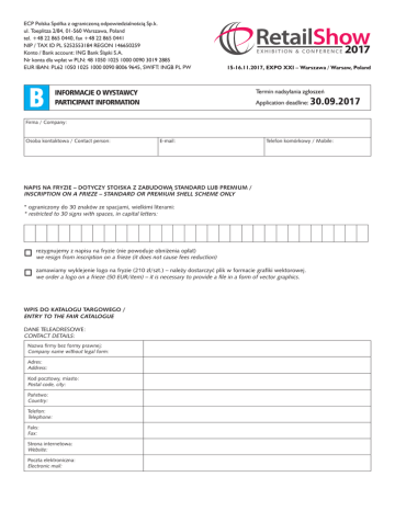 ECP Polska Spółka z ograniczoną odpowiedzialnością Sp.k. ul. Toeplitza 2/84, 01-560 Warszawa, Poland tel. +48 22 865 0440, fax +48 22 865 0441 NIP / TAX ID PL 5252553184 REGON 146650259 Konto / Bank account: ING Bank Śląski S.A. Nr konta dla wpłat w PLN: 48 1050 1025 1000 0090 3019 2885 EUR IBAN: PL62 1050 1025 1000 0090 8006 9645, SWIFT: INGB PL PW B EXHIBITION & CONFERENCE 15-16.11.2017, EXPO XXI – Warszawa / Warsaw, Poland Termin nadsyłania zgłoszeń INFORMACJE O WYSTAWCY PARTICIPANT INFORMATION Application deadline: 30.09.2017 Firma / Company: Osoba kontaktowa / Contact person: E-mail: Telefon komórkowy / Mobile: NAPIS NA FRYZIE – DOTYCZY STOISKA Z ZABUDOWĄ STANDARD LUB PREMIUM / INSCRIPTION ON A FRIEZE – STANDARD OR PREMIUM SHELL SCHEME ONLY * ograniczony do 30 znaków ze spacjami, wielkimi literami: * restricted to 30 signs with spaces, in capital letters: rezygnujemy zamawiamy z napisu na fryzie (nie powoduje obniżenia opłat) we resign from inscription on a frieze (it does not cause fees reduction) wyklejenie logo na fryzie (210 zł/szt.) – należy dostarczyć plik w formacie grafiki wektorowej. we order a logo on a frieze (50 EUR/item) – it is necessary to provide a file in a form of vector graphics. WPIS DO KATALOGU TARGOWEGO / ENTRY TO THE FAIR CATALOGUE DANE TELEADRESOWE: CONTACT DETAILS: Nazwa firmy bez formy prawnej: Company name without legal form: Adres: Address: Kod pocztowy, miasto: Postal code, city: Państwo: Country: Telefon: Telephone: Faks: Fax: Strona internetowa: Website: Poczta elektroniczna: Electronic mail: 2017 OPIS FIRMY: DESCRIPTION OF A COMPANY: * maksymalnie 1000 znaków ze spacjami. * maximum 1000 signs with spaces. Język polski / Polish language: Język angielski / English language: Po wypełnieniu prosimy odesłać faksem pod numer +48 (22) 865-04-41 lub e-mailem pod adres: [email protected] Please, send us filled form by fax +48 (22) 865-04-41 or e-mail [email protected]