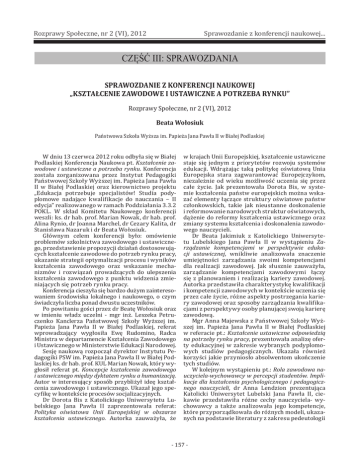 Rozprawy Społeczne, nr 2 (VI), 2012 Sprawozdanie z konferencji naukowej... CZĘŚĆ III: SPRAWOZDANIA SPRAWOZDANIE Z KONFERENCJI NAUKOWEJ „KSZTAŁCENIE ZAWODOWE I USTAWICZNE A POTRZEBA RYNKU” Rozprawy Społeczne, nr 2 (VI), 2012 Beata Wołosiuk Państwowa Szkoła Wyższa im. Papieża Jana Pawła II w Białej Podlaskiej W dniu 13 czerwca 2012 roku odbyła się w Białej Podlaskiej Konferencja Naukowa pt. Kształcenie zawodowe i ustawiczne a potrzeba rynku. Konferencja została zorganizowana przez Instytut Pedagogiki Państwowej Szkoły Wyższej im. Papieża Jana Pawła II w Białej Podlaskiej oraz kierownictwo projektu „Edukacja potrzebuje specjalistów! Studia podyplomowe nadające kwali ikacje do nauczania – II edycja” realizowanego w ramach Poddziałania 3.3.2 POKL. W skład Komitetu Naukowego konferencji weszli: ks. dr hab. prof. Marian Nowak, dr hab. prof. Alina Rynio, dr Joanna Marchel, dr Cezary Kalita, dr Stanisława Nazaruk i dr Beata Wołosiuk. Głównym celem konferencji było: omówienie problemów szkolnictwa zawodowego i ustawicznego, przedstawienie propozycji działań dostosowujących kształcenie zawodowe do potrzeb rynku pracy, ukazanie strategii optymalizacji procesu i wyników kształcenia zawodowego oraz wskazanie mechanizmów i rozwiązań prowadzących do ulepszenia kształcenia zawodowego z punktu widzenia zmieniających się potrzeb rynku pracy. Konferencja cieszyła się bardzo dużym zainteresowaniem środowiska lokalnego i naukowego, o czym świadczyła liczba ponad dwustu uczestników. Po powitaniu gości przez dr Beatę Wołosiuk oraz w imieniu władz uczelni - mgr inż. Leszeka Petruczenko Kanclerza Państwowej Szkoły Wyższej im. Papieża Jana Pawła II w Białej Podlaskiej, referat wprowadzający wygłosiła Ewę Rudomino, Radca Ministra w departamencie Kształcenia Zawodowego i Ustawicznego w Ministerstwie Edukacji Narodowej. Sesję naukową rozpoczął dyrektor Instytutu Pedagogiki PSW im. Papieża Jana Pawła II w Białej Podlaskiej ks. dr hab. prof. KUL Marian Nowak, który wygłosił referat pt. Koncepcje kształcenia zawodowego i ustawicznego między dyktatem rynku a humanizacją. Autor w interesujący sposób przybliżył ideę kształcenia zawodowego i ustawicznego. Ukazał jego specy ikę w kontekście procesów socjalizacyjnych. Dr Dorota Bis z Katolickiego Uniwersytetu Lubelskiego Jana Pawła II zaprezentowała referat: Polityka oświatowa Unii Europejskiej w obszarze kształcenia ustawicznego. Autorka zauważyła, że w krajach Unii Europejskiej, kształcenie ustawiczne staje się jednym z priorytetów rozwoju systemów edukacji. Wdrążając taką politykę oświatową Unia Europejska stara zagwarantować Europejczykom, niezależnie od wieku możliwość uczenia się przez całe życie. Jak prezentowała Dorota Bis, w systemie kształcenia państw europejskich można wskazać elementy łączące struktury oświatowe państw członkowskich, takie jak nieustanne doskonalenie i reformowanie narodowych struktur oświatowych, dążenie do reformy kształcenia ustawicznego oraz zmiany systemu kształcenia i doskonalenia zawodowego nauczycieli. Dr Beata Jakimiuk z Katolickiego Uniwersytetu Lubelskiego Jana Pawła II w wystąpieniu Zarządzanie kompetencjami w perspektywie edukacji ustawicznej, wnikliwie analizowała znaczenie umiejętności zarządzania swoimi kompetencjami dla realizacji zawodowej. Jak słusznie zauważyła, zarządzanie kompetencjami zawodowymi łączy się z planowaniem i realizacją kariery zawodowej. Autorka przedstawiła charakterystykę kwali ikacji i kompetencji zawodowych w kontekście uczenia się przez całe życie, różne aspekty postrzegania kariery zawodowej oraz sposoby zarządzania kwali ikacjami z perspektywy osoby planującej swoją karierę zawodową. Mgr Anna Majewska z Państwowej Szkoły Wyższej im. Papieża Jana Pawła II w Białej Podlaskiej w referacie pt.: Kształcenie ustawiczne odpowiedzią na potrzeby rynku pracy, prezentowała analizę oferty edukacyjnej w zakresie wybranych podyplomowych studiów pedagogicznych. Ukazała również korzyści jakie przyniosło absolwentom ukończenie tych studiów. W kolejnym wystąpieniu pt.: Rola zawodowa nauczyciela-wychowawcy w percepcji studentów. Implikacje dla kształcenia psychologicznego i pedagogicznego nauczycieli, dr Anna Lendzion prezentująca Katolicki Uniwersytet Lubelski Jana Pawła II, ciekawie przedstawiła różne cechy nauczyciela- wychowawcy a także analizowała jego kompetencje, które przyporządkowała do różnych modeli, ukazanych na podstawie literatury z zakresu pedeutologii - 157 - Rozprawy Społeczne, nr 2 (VI), 2012 Sprawozdanie z konferencji naukowej... i psychologii. Zaprezentowała podział kompetencji nauczycieli-wychowawców z przyporządkowaniem ich do odmiennych modeli, wzorców. Następnie dr Zbigniew Ostrach z Politechniki Radomskiej im. Kazimierza Pułaskiego w Radomiu w referacie Kształcenie nauczyciela przedszkola i doskonalenie jego rozwoju zawodowego zauważył, że nauczyciel w przedszkolu oprócz gruntownej wiedzy i praktycznych umiejętności musi wykazać także chęć ciągłego doskonalenia się i uzupełniania kwali ikacji. Ks. mgr Dariusz Tylutki z Zespołu Szkół w Gnojnicy Dolnej zaprezentował Wykorzystanie logoterapii V. E. Frankla w poradnictwie zawodowym. Jak zaznaczył autor, głównym celem logoterapii jest pomoc w odkryciu sensu, w przezwyciężaniu biologicznych i psychicznych ograniczeń oraz uzdolnienie człowieka do wykonywania jego zadań życiowych. Konferencję zakończył dr Zbigniew Chodkowski z Uniwersytetu Rzeszowskiego, prezentując referat pt.: Funkcjonowanie zawodowe słuchaczy studiów podyplomowych a typ społeczności przez nich zamiesz- kiwanej. Autor prezentował wyniki badań, które zostały przeprowadzone wśród słuchaczy studiów podyplomowych na Wydziale Pedagogiczno-Artystycznym Uniwersytetu Rzeszowskiego. Uczestnicy konferencji otrzymali publikację pt.: Kształceni