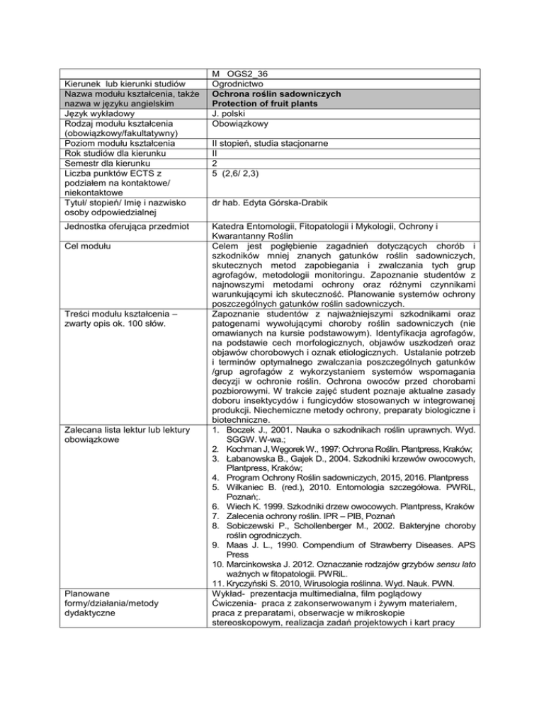 Kierunek lub kierunki studiów Nazwa modułu kształcenia, także nazwa w języku angielskim Język wykładowy Rodzaj modułu kształcenia (obowiązkowy/fakultatywny) Poziom modułu kształcenia Rok studiów dla kierunku Semestr dla kierunku Liczba punktów ECTS z podziałem na kontaktowe/ niekontaktowe Tytuł/ stopień/ Imię i nazwisko osoby odpowiedzialnej Jednostka oferująca przedmiot Cel modułu Treści modułu kształcenia – zwarty opis ok. 100 słów. Zalecana lista lektur lub lektury obowiązkowe Planowane formy/działania/metody dydaktyczne M OGS2_36 Ogrodnictwo Ochrona roślin sadowniczych Protection of fruit plants J. polski Obowiązkowy II stopień, studia stacjonarne II 2 5 (2,6/ 2,3) dr hab. Edyta Górska-Drabik Katedra Entomologii, Fitopatologii i Mykologii, Ochrony i Kwarantanny Roślin Celem jest pogłębienie zagadnień dotyczących chorób i szkodników mniej znanych gatunków roślin sadowniczych, skutecznych metod zapobiegania i zwalczania tych grup agrofagów, metodologii monitoringu. Zapoznanie studentów z najnowszymi metodami ochrony oraz różnymi czynnikami warunkującymi ich skuteczność. Planowanie systemów ochrony poszczególnych gatunków roślin sadowniczych. Zapoznanie studentów z najważniejszymi szkodnikami oraz patogenami wywołującymi choroby roślin sadowniczych (nie omawianych na kursie podstawowym). Identyfikacja agrofagów, na podstawie cech morfologicznych, objawów uszkodzeń oraz objawów chorobowych i oznak etiologicznych. Ustalanie potrzeb i terminów optymalnego zwalczania poszczególnych gatunków /grup agrofagów z wykorzystaniem systemów wspomagania decyzji w ochronie roślin. Ochrona owoców przed chorobami pozbiorowymi. W trakcie zajęć student poznaje aktualne zasady doboru insektycydów i fungicydów stosowanych w integrowanej produkcji. Niechemiczne metody ochrony, preparaty biologiczne i biotechniczne. 1. Boczek J., 2001. Nauka o szkodnikach roślin uprawnych. Wyd. SGGW. W-wa.; 2. Kochman J, Węgorek W., 1997: Ochrona Roślin. Plantpress, Kraków; 3. Łabanowska B., Gajek D., 2004. Szkodniki krzewów owocowych, Plantpress, Kraków; 4. Program Ochrony Roślin sadowniczych, 2015, 2016. Plantpress 5. Wilkaniec B. (red.), 2010. Entomologia szczegółowa. PWRiL, Poznań;. 6. Wiech K. 1999. Szkodniki drzew owocowych. Plantpress, Kraków 7. Zalecenia ochrony roślin. IPR – PIB, Poznań 8. Sobiczewski P., Schollenberger M., 2002. Bakteryjne choroby roślin ogrodniczych. 9. Maas J. L., 1990. Compendium of Strawberry Diseases. APS Press 10. Marcinkowska J. 2012. Oznaczanie rodzajów grzybów sensu lato ważnych w fitopatologii. PWRiL. 11. Kryczyński S. 2010, Wirusologia roślinna. Wyd. Nauk. PWN. Wykład- prezentacja multimedialna, film poglądowy Ćwiczenia- praca z zakonserwowanym i żywym materiałem, praca z preparatami, obserwacje w mikroskopie stereoskopowym, realizacja zadań projektowych i kart pracy