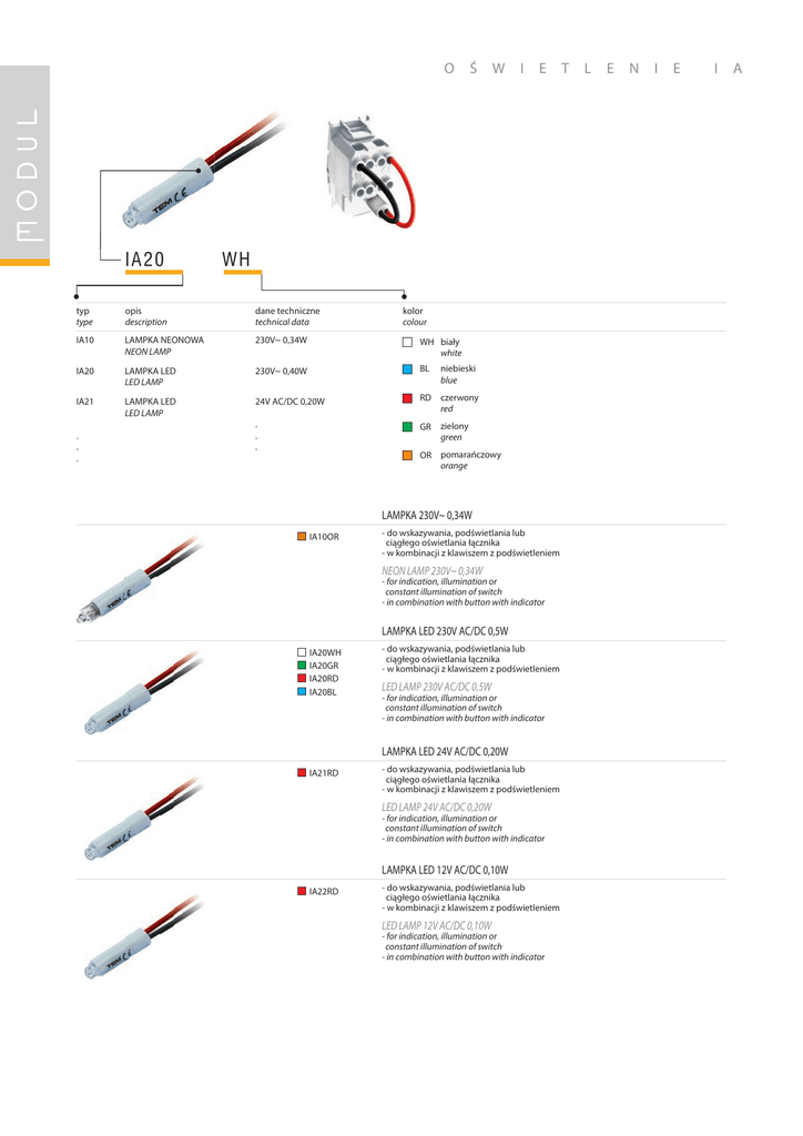 O I A2 0 Ś I E WH typ type opis description dane techniczne technical data IA10 LAMPKA NEONOWA NEON LAMP 230V~ 0,34W WH biały white IA20 LAMPKA LED LED LAMP 230V~ 0,40W BL IA21 LAMPKA LED LED LAMP 24V AC/DC 0,20W RD czerwony red . . . GR . . . W kolor colour niebieski blue zielony green OR pomarańczowy orange LAMPKA 230V~ 0,34W IA10OR - do wskazywania, podświetlania lub ciągłego oświetlania łącznika - w kombinacji z klawiszem z podświetleniem NEON LAMP 230V~ 0,34W - for indication, illumination or constant illumination of switch - in combination with button with indicator LAMPKA LED 230V AC/DC 0,5W IA20WH IA20GR IA20RD IA20BL - do wskazywania, podświetlania lub ciągłego oświetlania łącznika - w kombinacji z klawiszem z podświetleniem LED LAMP 230V AC/DC 0,5W - for indication, illumination or constant illumination of switch - in combination with button with indicator LAMPKA LED 24V AC/DC 0,20W IA21RD - do wskazywania, podświetlania lub ciągłego oświetlania łącznika - w kombinacji z klawiszem z podświetleniem LED LAMP 24V AC/DC 0,20W - for indication, illumination or constant illumination of switch - in combination with button with indicator LAMPKA LED 12V AC/DC 0,10W IA22RD - do wskazywania, podświetlania lub ciągłego oświetlania łącznika - w kombinacji z klawiszem z podświetleniem LED LAMP 12V AC/DC 0,10W - for indication, illumination or constant illumination of switch - in combination with button with indicator T L E N I E I A