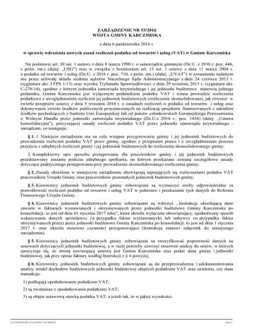 ZARZĄDZENIE NR 53/2016 WÓJTA GMINY KARCZMISKA z dnia 6 października 2016 r. w sprawie wdrożenia nowych zasad rozliczeń podatku od towarów i usług (VAT) w Gminie Karczmiska Na podstawie art. 30 ust. 1 ustawy z dnia 8 marca 1990 r. o samorządzie gminnym (Dz.U. z 2016 r. poz. 446, z późn. zm.) (dalej: „USG”) oraz w związku z brzmieniem art. 15 ust. 1 ustawy z dnia 11 marca 2004 r. o podatku od towarów i usług (Dz.U. z 2016 r. poz. 710, z późn. zm.) (dalej: „UVAT”) w rozumieniu nadanym mu przez uchwałę składu siedmiu sędziów Naczelnego Sądu Administracyjnego z dnia 24 czerwca 2013 r. (sygnatura akt: I FPS 1/13) oraz wyroku Trybunału Sprawiedliwości z dnia 29 września 2015 r. (sygnatura akt: C-276/14), zgodnie z którym jednostka samorządu terytorialnego i jej jednostki budżetowe stanowią jednego podatnika, Gmina Karczmiska jest wyłącznym podatnikiem podatku VAT i winna prowadzić rozliczenia podatkowe z uwzględnieniem rozliczeń jej jednostek budżetowych (rozliczenie skonsolidowane), jak również w świetle przepisów ustawy z dnia 5 września 2016 r. o zasadach rozliczeń w podatku od towarów i usług oraz dokonywania zwrotu środków publicznych przeznaczonych na realizację projektów finansowanych z udziałem środków pochodzących z budżetu Unii Europejskiej lub od państw członkowskich Europejskiego Porozumienia o Wolnym Handlu przez jednostki samorządu terytorialnego (Dz.U.z 2016 r., poz. 1454) (dalej: „Ustawa konsolidacyjna”), precyzującej zasady rozliczeń podatku VAT przez jednostki samorządu terytorialnego zarządzam, co następuje: § 1. 1. Niniejsze zarządzenie ma na celu wstępne przygotowanie gminy i jej jednostek budżetowych do prowadzenia rozliczeń podatku VAT przez gminę, zgodnie z przepisami prawa i z uwzględnieniem procesu przejścia z odrębnych rozliczeń gminy i jej jednostek budżetowych do rozliczenia skonsolidowanego gminy. 2. Kompleksowy opis sposobu postępowania dla pracowników gminy i jej jednostek budżetowych przedstawiony zostanie podczas odrębnego spotkania, na którym przekazane zostaną szczegółowe zasady dotyczące praktycznego postępowania przy prowadzeniu skonsolidowanego rozliczenia gminy. § 2. Zasady określone w niniejszym zarządzeniu obowiązują zajmujących się rozliczeniami podatku VAT pracowników Urzędu Gminy oraz pracowników pozostałych jednostek budżetowych gminy. § 3. Kierownicy jednostek budżetowych gminy zobowiązani są wyznaczyć osoby odpowiedzialne za prawidłowość rozliczeń podatku od towarów i usług VAT w jednostce i przekazanie tych danych do Referatu Finansowego Urzędu Gminy. § 4. Kierownicy jednostek budżetowych gminy zobowiązani są wdrożyć „Instrukcję określającą dane zawarte w fakturach wystawianych i otrzymywanych przez jednostki budżetowe Gminy Karczmiska po konsolidacji, to jest od dnia 01 stycznia 2017 roku”, która określa wyłącznie obowiązujący, ujednolicony sposób wskazywania danych sprzedawcy (w przypadku faktur wystawianych) lub nabywcy (w przypadku faktur otrzymywanych przez) przez jednostki budżetowe Gminy Karczmiska po konsolidacji, to jest od dnia 1 stycznia 2017 r. oraz określa stosowne czynności przygotowujące (Instrukcja stanowi załącznik do niniejszego zarządzenia). § 5. Kierownicy jednostek budżetowych gminy zobowiązani są zweryfikować poprawność danych na umowach dotyczących jednostki budżetowej, a w razie potrzeby zawrzeć stosowne aneksy do umów, w których sprecyzuje się, że stroną zawierającą umowę jest Gmina Karczmiska oraz podać dane gminy i jednostki budżetowej, jak przy opisie faktury według Instrukcji z § 4 powyżej. § 6. Kierownicy jednostek budżetowych gminy zobowiązani są do przeprowadzenia i udokumentowania analizy źródeł dochodów budżetowych jednostki budżetowej objętych podatkiem VAT oraz ustalenia, czy dane transakcje: 1) podlegają opodatkowaniu podatkiem VAT; 2) są zwolnione z opodatkowania podatkiem VAT; 3) są objęte ustawową stawką podatku VAT, a jeżeli tak, to w jakiej wysokości. Id: E1D856DE-EB61-4CAE-893D-C7A553DF04E3 Strona 1 § 7. Zarządzenie stanowi element polityki rachunkowości Urzędu Gminy Karczmiska i winno być uwzględnione w polityce rachunkowości jednostek budżetowych przez ich kierowników, a w szczególności w zakresie funkcjonowania kont związanych z rozliczeniem podatku VAT. § 8. 1. Kierownicy jednostek budżetowych gminy zobowiązani są do prowadzenia cząstkowych ewidencji sprzedaży dla jednostki budżetowej za poszczególne miesiące rozliczeniowe, począwszy od stycznia 2017 r. 2. Wskazane ewidencje należy prowadzić z uwzględnieniem wszystkich sprzedażowych dokumentów księgowych, to jest faktur, rachunków, wydruków z kas fiskalnych, kwitariuszy i innych. § 9. 1. Kierownicy jednostek budżetowych gminy zobowiązani są do prowadzenia cząstkowych ewidencji zakupów dla jednostki budżetowej za poszczególne miesiące rozliczeniowe, począwszy od stycznia 2017 r., jeżeli jednostce budżetowej przysługuje prawo do obniżenia kwoty podatku należnego o kwotę podatku naliczonego. Prawo to należy rozpatrywać w kontekście: 1) czynności podlegających UVAT i opodatkowanych według stawek przewidzianych ustawą (art. 86 ust. 1 UVAT); 2) czynności podlegających UVAT, ale od opodatkowania zwolnionych, do których zastosowanie znajduje tzw. współczynnik sprzedaży (art. 90 ust. 1 UVAT); 3) czynności w ogóle nie podlegających UVAT, do których zastosowanie znajdzie tzw. prewspółczynnik (art. 86 ust. 2a UVAT). 2. Wskazane ewidencje należy prowadzić z uwzględnieniem wyłącznie faktur, z których jednostka budżetowa ma prawo do odliczenia podatku VAT. § 10. 1. Kierownicy jednostek budżetowych gminy zobowiązani są do przekazywania do Referatu Finansowego Urzędu Gminy do dnia 15 każdego miesiąca podpisanych przez kierownika jednostki i głównego księgowego jednostki następujących dokumentów za po