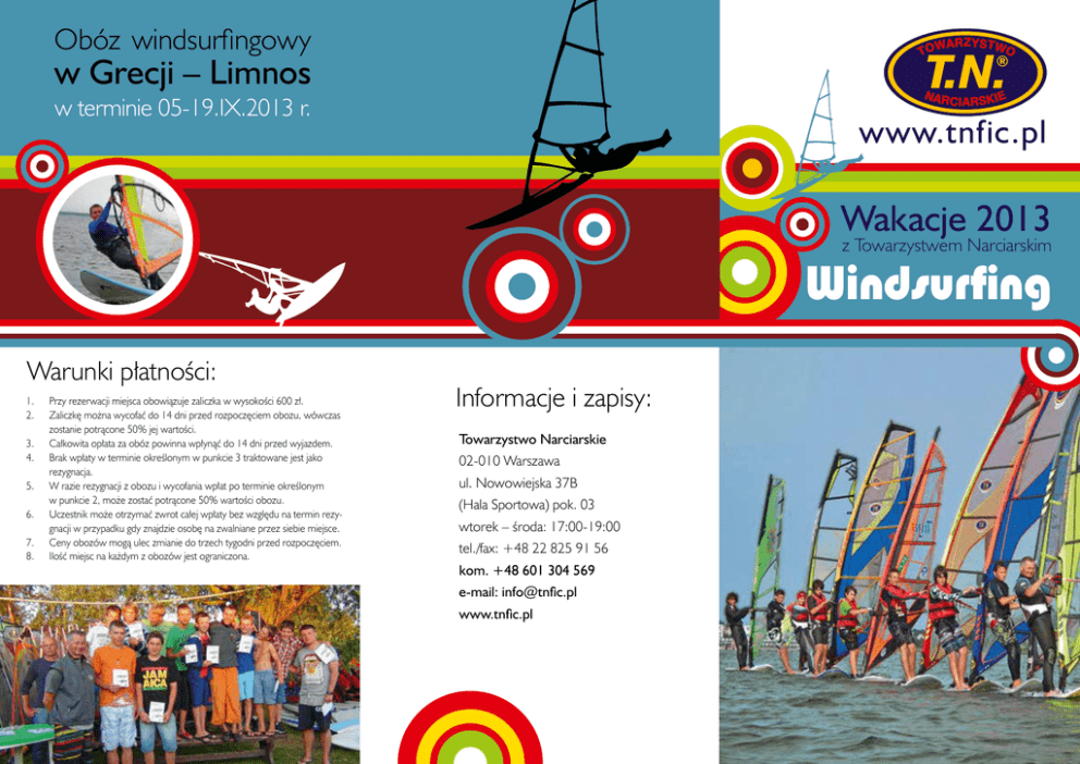 Obóz windsurfingowy WA TO RZYSTW O T.N. w Grecji – Limnos N AR w terminie 05-19.IX.2013 r. ® CIARSKIE www.tnfic.pl Wakacje 2013 z Towarzystwem Narciarskim Windsurfing Warunki płatności: 1. 2. 3. 4. 5. 6. 7. 8. Przy rezerwacji miejsca obowiązuje zaliczka w wysokości 600 zł. Zaliczkę można wycofać do 14 dni przed rozpoczęciem obozu, wówczas zostanie potrącone 50% jej wartości. Całkowita opłata za obóz powinna wpłynąć do 14 dni przed wyjazdem. Brak wpłaty w terminie określonym w punkcie 3 traktowane jest jako rezygnacja. W razie rezygnacji z obozu i wycofania wpłat po terminie określonym w punkcie 2, może zostać potrącone 50% wartości obozu. Uczestnik może otrzymać zwrot całej wpłaty bez względu na termin rezygnacji w przypadku gdy znajdzie osobę na zwalniane przez siebie miejsce. Ceny obozów mogą ulec zmianie do trzech tygodni przed rozpoczęciem. Ilość miejsc na każdym z obozów jest ograniczona. Informacje i zapisy: Towarzystwo Narciarskie 02-010 Warszawa ul. Nowowiejska 37B (Hala Sportowa) pok. 03 wtorek – środa: 17:00-19:00 tel./fax: +48 22 825 91 56 kom. +48 601 304 569 e-mail: [email protected] www.tnfic.pl Windsurfing Jastarnia Turnus dwutygodniowy cena: 2400 zł 30.06 – 13.07 14.07 – 27.07 28.07 – 10.08 11.08 – 24.08 Oragnizator zapewnia: • szkolenie windsurfingowe (4h dziennie); • trening przygotowawczy do sezonu narciarskiego; • zajęcia reakreacyjne, gry zespołowe; • zakwaterowanie (pokoje 3-5 os. oraz przyczepy kempingowe); • wyżywienie (3 x dziennie); • ubezpieczenie NNW; • sprzęt windsurfingowy (bez pianek). Uwagi: • pobyt na wszystkich turnusach rozpoczyna się kolacją (zakwaterowanie od godz. 15.00) i kończy śniadaniem; • jest możliwość uczestniczenia tylko w samym szkoleniu.