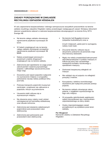 SITA Sverige AB, 2013-12-13 ORDNINGSREGLER >> HÖGDALEN ________________________ ZASADY PORZĄDKOWE W ZAKŁADZIE RECYKLINGU ODPADÓW HÖGDALEN ________________________________________________________________________________ W celu zapewnienia bezpieczeństwa i dobrego samopoczucia wszystkich pracowników na terenie zakładu recyklingu odpadów Högdalen należy przestrzegać następujących zasad. Niniejszy dokument stanowi uzupełnienie zaleceń w zakresie bezpieczeństwa obowiązujących na terenie firmy SITA Sverige AB. • • Na terenie całego zakładu obowiązuje ograniczenie prędkości wynoszące 20 km/h. W halach znajdujących się na terenie całego zakładu obowiązuje szczególne ograniczenie prędkości wynoszące 10 km/h. • Należy przestrzegać pionowych i poziomych znaków drogowych znajdujących się na terenie zakładu. • Zabronione jest wjeżdżanie na wagę przed zakończeniem ważenia poprzedniego pojazdu i całkowitego opuszczenia przez niego wagi. • • • Na terenie hali Byggåtervinnarna (odpadów budowlanych) oraz w innych miejscach, gdzie jest to wymagane, należy nosić kask. • Zrzucanie ładunku odbywa się po otrzymaniu polecenia od personelu wagi i/lub kierowcy ładowarki. • Nigdy nie należy przejeżdżać/zatrzymywać się/cofać/przebywać w pobliżu maszyny w trakcie jej pracy bez uprzedniego nawiązania kontaktu wzrokowego z operatorem maszyny. • Zachować bezpieczną odległość od maszyn. Dozwolony jest wjazd pojazdów wyłącznie na wyznaczone miejsca; w przypadku parkowania naczep należy podłożyć kliny pod koła. • Nie oddalać się od pojazdu na odległość powyżej 2 metrów. • Podczas transportu pojemniki muszą być zamknięte i znajdować się całkowicie w pojeździe, którym są przewożone. Korzystanie z telefonu komórkowego dozwolone jest wyłącznie podczas postoju pojazdu. • Na terenie zakładu obowiązuje zakaz palenia, z wyjątkiem wyznaczonego do tego celu miejsca. • W przypadku jakichkolwiek wątpliwości należy skonsultować się z kierownikiem odpowiedzialnego za dany obiekt. • Osoby nieprzestrzegające zasad porządkowych są wydalane poza teren zakładu. • Usuwanie siatki odbywa się w wyznaczonym miejscu. • Na obszarze pracy należy nosić odzież ostrzegawczą lub kamizelkę odblaskową oraz obuwie ochronne. • Zabronione jest stawianie załadowanych pojemników pod przewodami sieci elektrycznej. • Zabronione jest parkowanie pod przewodami sieci elektrycznej. Per Skoglund Kierownik obiektu w Zakładzie Recyklingu Högdalen
