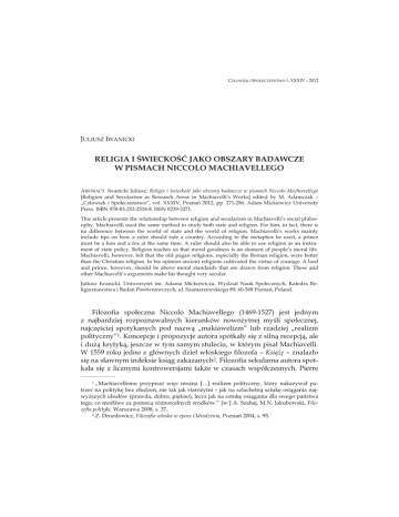CZ'OWIEK I SPO'ECZE(STWO T. XXXIV – 2012 JULIUSZ IWANICKI RELIGIA I WIECKO ! JAKO OBSZARY BADAWCZE W PISMACH NICCOLO MACHIAVELLEGO ABSTRACT. Iwanicki Juliusz, Religia i wiecko ! jako obszary badawcze w pismach Niccolo Machiavellego [Religion and Secularism as Research Areas in Machiavelli’s Works] edited by M. Adamczak – „Cz owiek i Spo ecze!stwo”, vol. XXXIV, Pozna! 2012, pp. 271-286. Adam Mickiewicz University Press. ISBN 978-83-232-2518-8. ISSN 0239-3271. This article presents the relationship between religion and secularism in Machiavelli’s social philosophy. Machiavelli used the same method to study both state and religion. For him, in fact, there is no difference between the world of state and the world of religion. Machiavelli’s works mainly include tips on how a ruler should rule a country. According to the metaphor he used, a prince must be a lion and a fox at the same time. A ruler should also be able to use religion as an instrument of state policy. Religion teaches us that moral goodness is an element of people’s moral life. Machiavelli, however, felt that the old pagan religions, especially the Roman religion, were better than the Christian religion. In his opinion ancient religions cultivated the virtue of courage. A lord and prince, however, should be above moral standards that are drawn from religion. These and other Machiavelli’s arguments make his thought very secular. Juliusz Iwanicki, Uniwersytet im. Adama Mickiewicza, Wydzia Nauk Spo ecznych, Katedra Religioznawstwa i Bada! Porównawczych, ul. Szamarzewskiego 89, 60-568 Pozna!, Poland. Filozofia spo eczna Niccolo Machiavellego (1469-1527) jest jednym z najbardziej rozpoznawalnych kierunków nowo"ytnej my#li spo ecznej, najcz$#ciej spotykanych pod nazw% „makiawelizm” lub rzadziej „realizm polityczny”1. Koncepcje i propozycje autora spotka y si$ z siln% recepcj%, ale i du"% krytyk%, jeszcze w tym samym stuleciu, w którym pisa Machiavelli. W 1559 roku jedno z g ównych dzie w oskiego filozofa – Ksi"#$ – znalaz o si$ na s awnym indeksie ksi%g zakazanych2. Filozofia sekularna autora spotka a si$ z licznymi kontrowersjami tak"e w czasach wspó czesnych. Pierre ________________ 1 „Machiavellemu przypisa& wi$c mo"na […] realizm polityczny, który nakazywa patrze& na polityk$ bez z udze!, nie tak jak staro"ytni – jak na szlachetn% sztuk$ osi%gania najwy"szych idea ów (prawda, dobro, pi$kno), leccz jak na sztuk$ osi%gania dla swego pa!stwa tego, co mo"liwe za pomoc% ró"norodnych #rodków.” [w:] A. Szahaj, M.N. Jakubowski, Filozofia polityki, Warszawa 2008, s. 37. 2 Z. Drozdowicz, Filozofia w%oska w epoce Odrodzenia, Pozna! 2004, s. 95. 272 Juliusz Iwanicki Manent napisa nawet, i": „Wiemy, i" [Machiavelli – J.I.] naucza czyni& z o; uczy jak przy u"yciu podst$pu i przemocy zdoby& oraz utrzyma& w adz$, co zrobi&, aby spisek si$ powiód 3. Nie zgadzaj%c si$ z tak radykaln% opini% Manenta, trzeba stwierdzi&, "e my#l Machiavellego nakierowana jest uwag% na sprawy rz%dzenia pa!stwem. Najbardziej w oskiego my#liciela absorbowa a kwestia, jaki powinien by& w adca, aby móg skutecznie utrzyma& w adz$ w pa!stwie? My#l sekularna Machiavellego mia a silne oparcie w obserwacji rzeczywisto#ci, jak stwierdza McCormick: „In the dedication to Prince, Machiavelli famously claimed to understand the nature of individual princes from firsthand experience: he had observed the actions of kings, queens, popes, and warlords on his diplomatic missions for the repubic [...]”4 Tematyka religii nie jest wi$c dla Machiavellego najwa"niejszym zagadnieniem, niemniej nie jest te" wcale problemem bagatelnym. W oski filozof, ze swoim specyficznie sekularnym podej#ciem do instytucji religii, traktuje j% jako dok adnie taki sam obiekt do analizy spo ecznej, jak inne byty spoeczne. Jak pisze w Rozwa#aniach nad pierwszym dziesi$cioksi$giem historii Rzymu Liwiusza: „[...] wszystkie religie, republiki i królestwa zawieraj% w sobie pocz%tkowo mniej lub wi$cej dobra, któremu zawdzi$czaj% sw% pierwotn% chwa $ i wielko#&”5 i dalej – „[...] nie ma nic wa"niejszego dla religii, dla republiki czy królestwa, jak wróci& im s aw$, któr% cieszy y si$ na pocz%tku swego istnienia”6. Dla Machiavellego zatem religie oraz #wieckie pa!stwa stanowi% dok adnie t$ sam% p aszczyzn$ rozwa"a! – #wieck% i na wskro# doczesn%. Nie widzi on powodu, by traktowa& religi$ odmiennie ni" inne zjawiska i byty spo eczne, uznaj%c, i" religia jest czym#, co stale uczestniczy i wp ywa na realny porz%dek i sprawy ziemskie. Machiavelli rozdziela w wyra)ny sposób poziom oddzia ywa! religii, przejawiaj%cy si$ w "yciu spo ecznym, od poziomu w którym religia og asza pewn% wiedz$ o "yciu transcendentnym. Je#li chodzi o p aszczyzn% metafizyczn%, to autor twierdzi: „Aby wyja#ni& przyczyny tych cudów [tj. ró"nych historycznych relacji o cudownych wydarzeniach – J.I.], nale"a oby posiada& wiedz$ o rzeczach przyrodzonych i nadprzyrodzonych, której my nie posiadamy”7. Machiavelli jest zdystansowany filozoficznie do zagadnie! metaficznych i spraw transcendencji, interesuj%c si$ przede wszystkimi sprawami ziemskimi, doczesnymi i politycznymi. Chocia" jako humanista ________________ P. Manent, Intelektualna historia liberalizmu, Kraków 1994, s. 27. J. McCormick, Machiavellian Democracy, Cambridge 2011, s. 27. 5 N. Machiavelli, Rozwa#ania nad pierwszym dziesi$cioksi$giem historii Rzymu Liwiusza, [w:] N. Machiavelli, Wybór pism, opr. K. Zaboklicki, wst$p J. Malarczyk, Warszawa 1972, s. 494. 6 N. Machiavelli, Rozwa#ania..., dz. cyt., s. 498. 7 Tam"e, s. 372. 3 4 Religia i wiecko ! jako obszary badawcze w pismach Niccolo Machiavellego 273 jest zainteresowany przesz o#ci%, odnosz%c si$ przede wszystkim do historii Rzymu, to nie kieruje go to wcale ku kultowi przesz o#ci, gdy" pisze, i": „#wiat jest obecnie taki sam, jaki by zawsze”8. W jego przekonaniu filozoficznym nie by o nigdy ró"nych Owidiuszowych epok, na kszta t Metamorfoz9. Machiavell