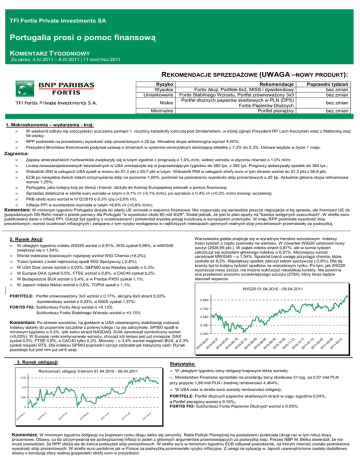 TFI Fortis Private Investments SA Portugalia prosi o pomoc finansową KOMENTARZ TYGODNIOWY Za okres: 4.IV.2011 – 8.IV.2011 | 11 KWIETNIA 2011 REKOMENDACJE SPRZEDAśOWE (UWAGA –NOWY PRODUKT): Ryzyko Wysokie Umiarkowane Niskie Minimalne Rekomendacje Fortis Akcji, Portfele 6x3, MISS i dywidendowy Fortis Stabilnego Wzrostu, Portfel zrównowaŜony 3x3 Portfel dłuŜnych papierów skarbowych w PLN (DPS) Fortis Papierów DłuŜnych Portfel pienięŜny Poprzedni tydzień bez zmian bez zmian bez zmian bez zmian 1. Makroekonomia – wydarzenia - kraj: • W weekend odbyły się uroczystości uczczenia pamięci 1. rocznicy katastrofy lotniczej pod Smoleńskiem, w której zginęli Prezydent RP Lech Kaczyński wraz z MałŜonką oraz 94 osoby; • RPP podniosła na posiedzeniu wysokość stóp procentowych o 25 bp. Aktualnie stopa referencyjna wynosi 4,00%; • Prezydent Bronisław Komorowski podpisał ustawę o zmianach w systemie emerytalnym obniŜającą składkę z 7,3% do 2,3%. Ustawa wejdzie w Ŝycie 1 maja; Zagranica: • Zapasy amerykańskich hurtowników zwiększyły się w lutym zgodnie z prognozą o 1,0% m/m, wobec wzrostu w styczniu równieŜ o 1,0% m/m; • • Liczba nowozarejestrowanych bezrobotnych w USA zmniejszyła się w poprzedzającym tygodniu do 382 tys. z 392 tys. Prognozy wskazywały spadek do 385 tys.; Wskaźnik ISM w usługach USA spadł w marcu do 57,3 pkt z 59,7 pkt w lutym. Wskaźnik PMI w usługach strefy euro w tym okresie wzrósł do 57,2 pkt z 56,9 pkt; • • ECB po niespełna dwóch latach utrzymywania stóp na poziomie 1,00%, podniósł na posiedzeniu wysokość stóp procentowych o 25 bp. Aktualnie główna stopa refinansowa wynosi 1,25%; Portugalia, jako kolejny kraj po Grecji i Irlandii, złoŜyła do Komisji Europejskiej wniosek o pomoc finansową; • • SprzedaŜ detaliczna w strefie euro wzrosła w lutym o 0,1% r/r (-0,1% m/m), po wzroście o 0,4% r/r (+0,2% m/m) miesiąc wcześniej; PKB strefy euro wzrósł w IV’Q’2010 o 0,3% q/q (+2,0% r/r); • Inflacja PPI w eurolandzie wyniosła w lutym +6,6% r/r (+0,8% m/m); Komentarz: W minionym tygodniu Portugalia złoŜyła do władz UE wniosek o wsparcie finansowe. Nie rozpoczęły się wprawdzie jeszcze negocjacje w tej sprawie, ale Komisarz UE ds. gospodarczych Olli Rehn mówił o planie pomocy dla Portugalii "w wysokości około 80 mld EUR". Dodał jednak, Ŝe jest to plan oparty na "bardzo wstępnych szacunkach". W strefie euro publikowano dane o inflacji PPI. Odczyt był zgodny z oczekiwaniami i potwierdził wysoką presję kosztową w europejskim przemyśle. W kraju RPP podniosła wysokość stóp procentowych, wzrost oczekiwań inflacyjnych i związane z tym ryzyko wystąpienia w najbliŜszych miesiącach ujemnych realnych stóp procentowych przemawiały za podwyŜką. 2. Rynek Akcji • • W ubiegłym tygodniu indeks WIG20 wzrósł o 0,91%, WIG zyskał 0,98%, a mWIG40 zwiększył się o 1,54%; Wśród indeksów branŜowych najwięcej wzrósł WIG Chemia (+8,2%); • Trzeci tydzień z kolei najmocniej spadł WIG SpoŜywczy (-2,8%); • • W USA Dow Jones wzrósł o 0,03%, S&P500 oraz Nasdaq spadły o 0,3%; W Europie DAX zyskał 0,5%, FTSE wzrósł o 0,8%, a CAC40 zyskał 0,2%; • W Budapeszcie BUX wzrósł o 3,4%, a w Pradze PX50 zyskał 1,1%; • W Japonii indeks Nikkei wzrósł o 0,6%, TOPIX spadł o 1,1%; Warszawska giełda znajduje się w wyraźnym trendzie wzrostowym. Indeksy trzeci tydzień z rzędu zyskiwały na wartości. W czwartek WIG20 ustanowił nowy szczyt (2928,95 pkt.). W piątek indeks stracił 0,87%, ale w sumie tydzień zakończył się wzrostem głównego indeksu o 0,91%. Mocniejszy wzrost zanotował MWIG40 – o 1,54%. Spośród branŜ uwagę przyciąga chemia, która zyskała aŜ 8,2%. Największy spadek zaliczył sektor spoŜywczy (-2,8%). Dla tej branŜy był to kolejny tydzień spadków na wzrostowym rynku. Po tym, jak WIG20 wyznaczył nowy szczyt, nie moŜna wykluczyć niewielkiej korekty. Nie powinna ona przełamać poziomu wcześniejszego szczytu (2794), który teraz będzie stanowił wsparcie. WIG20 01.04.2010 - 08.04.2011 PORTFELE: Portfel zrównowaŜony 3x3 wzrósł o 0,17%, akcyjny 6x3 stracił 0,22%, dywidendowy wzrósł o 0,22%, a MISS zyskał 1,37%; FORTIS FIO: Subfundusz Fortis Akcji wzrósł o +0.13% Subfundusz Fortis Stabilnego Wzrostu wzrósł o +0.15% 2 850 2 700 2 550 Komentarz: Po okresie wzrostów, na giełdach w USA obserwujemy stabilizację notowań. 3. Rynek obligacji 5,5 10 -0 401 10 -0 427 20 10 -0 523 20 10 -0 618 20 10 -0 714 20 10 -0 809 20 10 -0 904 20 10 -0 930 20 10 -1 026 20 10 -1 121 20 10 -1 217 20 11 -0 112 20 11 -0 207 20 11 -0 305 20 11 -0 331 • W USA oraz w strefie euro wzrosły rentowności obligacji; PORTFELE: Portfel dłuŜnych papierów skarbowych stracił w ciągu tygodnia 0,04%, a Portfel pienięŜny wzrósł o 0,10%; FORTIS FIO: Subfundusz Fortis Papierów DłuŜnych wzrósł o 0.05%; 5,25 5 10 20 • W ubiegłym tygodniu ceny obligacji krajowych lekko wzrosły; • Ministerstwo Finansów sprzedało na przetargu bony skarbowe 51-tyg. za 0,57 mld PLN przy popycie 1,69 mld PLN i średniej rentowności 4,464%; 5,75 20 2 250 Statystyka: Rentowność obligacji 5-letnich 01.04.2010 - 08.04.2011 0 4-0 2 400 20 Indeksy dotarły do poziomów szczytów z połowy lutego i tu się zatrzymały. SP500 spadł w minionym tygodniu o 0,3%, tyle samo stracił NASDAQ. DJIA zanotował symboliczny wzrost (+0,03%). W Europie rynki kontynuowały wzrosty, chociaŜ ich tempo jest juŜ mniejsze. DAX zyskał 0,5%, FTSE 0,8%, a CAC40 tylko 0,2%. Mocniej – o 3,4% wzrósł węgierski BUX, a 2,3% zyskał rosyjski RTS. Dla indeksu SP500 poprzedni szczyt zadziałał jak klasyczny opór. Rynek pozostaje tuŜ pod nim juŜ od 6 sesji. 1 20 10 05 31 20 10 07 30 20 10 09 28 20 10 11 27 20 11 01 26 20 11 03 27 Komentarz: W minionym tygodniu obligacje na krajowym rynku długu lekko się umocniły. Rada Polityki PienięŜnej na posiedzeniu podniosła (drugi raz w tym