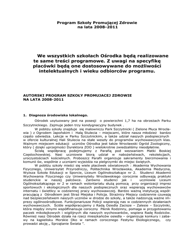Program Szkoły Promującej Zdrowie na lata 2008-2011 We wszystkich szkołach Ośrodka będą realizowane te same treści programowe. Z uwagi na specyfikę placówki będą one dostosowywane do możliwości intelektualnych i wieku odbiorców programu. AUTORSKI PROGRAM SZKOŁY PROMUJACEJ ZDROWIE NA LATA 2008-2011 1. Diagnoza środowiska lokalnego. Ośrodek usytuowany jest na posesji o powierzchni 1,7 ha na obrzeżach Parku Szczytnickiego. Zajmuje jeden trzy kondygnacyjny budynek . W pobliżu szkoły znajduje się malowniczy Park Szczytnicki ( Zielone Płuca Wrocławia ) z Ogrodem Japońskim i Halą Stulecia – miejscami, które nasza młodzież bardzo często odwiedza. Lekcje w Parku Szczytnickim, a także udział naszych podopiecznych w ofercie kulturalnej Hali Stulecia na stałe weszły do programów wychowawczych klas. Ważnym miejscem edukacji uczniów Ośrodka jest także Wrocławski Ogród Zoologiczny, który ( dzięki uprzejmości Dyrektora ZOO ) wielokrotnie zwiedzaliśmy nieodpłatnie. Ścisłą współpracę podejmujemy z Parafią pod wezwaniem Matki Boskiej Częstochowskiej. Nasi uczniowie biorą udział w nabożeństwach, rekolekcjach, uroczystościach kościelnych. Proboszcz Parafii organizuje sakramenty bierzmowania i komunii św, wspólnie z uczniami wyjeżdża na pielgrzymki do miejsc świętych. W pobliżu szkoły mieści się wiele placówek oświatowych : Akademia Wychowania Fizycznego, Uniwersytet Przyrodniczy, Politechnika Wrocławska, Akademia Medyczna, Wyższa Szkoła Edukacji w Sporcie, Liceum Ogólnokształcące nr 2. Studenci Akademii Wychowania Fizycznego czy Uniwersytetu Wrocławskiego corocznie odbywają praktyki studenckie w naszej palcówce. Zarówno studenci jak i uczniowie Liceum Ogólnokształcącego nr 2 w ramach wolontariatu służą pomocą przy organizacji imprez sportowych i ekologicznych dla naszych podopiecznych oraz wspierają wychowawców internatu i świetlicy w codziennej pracy wychowawczej. Bardzo ważną instytucją współpracującą z Ośrodkiem jest Straż Miejska i Policja. Strażnicy Miejscy codziennie czuwają nad bezpieczeństwem naszych uczniów w drodze do szkoły, a także nadzorują ważne imprezy ogólnoośrodkowe. Funkcjonariusze Policji wspierają nas w codziennych działaniach wychowawczych. Ściśle współpracujemy z Radą Osiedla Zacisze – Zalesie – Szczytniki, która między innymi współfinansuje coroczny Piknik Rodzinny, pomaga w przygotowaniu paczek mikołajkowych i wigilijnych dla naszych wychowanków, wspiera Radę Rodziców. Również nasz Ośrodek działa na rzecz mieszkańców osiedla – organizuje konkury i zabawy na kąpielisku Morskie Oko w ramach corocznego Festynu Ekologicznego, czy prowadzi akcję „ Sprzątanie Świata ”. Podejmujemy także współpracę z Miejską Biblioteką Publiczną, która organizuje wystawy prac naszych podopiecznych. Nieopodal mieści się Stacja Meteorologiczna źródło wiadomości o pogodzie. Otoczenie Ośrodka Szkolno – Wychowawczego nr 10, bogate w doznania oświatowe, kulturalne i przyrodnicze, czyni to miejsce wartościowym dla rozwoju naszych niepełnosprawnych podopiecznych. 2. Diagnoza środowiska szkolnego (rozpoznanie i opis problemów). Specjalny Ośrodek Szkolno – Wychowawczy nr 10 jest dużą placówką szkolnowychowawczą. Obejmuje edukacją dzieci i młodzież w wieku 7 –24 roku życia, z pośledzeniem umysłowym w stopniu lekkim, umiarkowanym i znacznym SOS-W Nr 10 składa się z czterech szkół : • Szkoła Podstawowa Nr 87 • Gimnazjum Nr 55 • Zasadnicza Szkoła Zawodowa Nr 13 • Szkoła Przysposabiająca do Pracy Nr 1 oraz • Całodobowy internat (dla uczniów SOS-W nr 10 oraz dzieci niedosłyszących uczących się w Zespole Szkół nr 15 przy ul. Chopina Przebywają w nim dzieci mieszkające na stałe poza Wrocławiem lub te, które zostały skierowane do placówki na mocy postanowienia Sądu Rodzinnego). • Świetlica szkolna ( czynna od 700 - 1700 ) Cechą charakterystyczną uczniów z upośledzeniem umysłowym jest ich słaba orientacja w przestrzeni i niska sprawność manualna. Uczniowie w naturalny sposób starają się zwykle unikać sytuacji sprawiających im trudności, dlatego bardzo ważnym etapem każdych działań jest wzbudzenie odpowiedniej motywacji do pokonywania lęku przed niepowodzeniem. Oprócz deficytu intelektualnego można zaobserwować u naszych podopiecznych zakłócenia rozwoju emocjonalnego i społecznego. Narażeni są na marginalizację i wykluczenie społeczne. Ze względu na swą niepełnosprawność fizyczną i umysłową podlegają dyskryminacji, źródłem której są uprzedzenia i stereotypy. Jest to przyczyną niskiej samooceny, frustracji, stresów i kompleksów młodych ludzi. Wychowankowie ośrodka mają trudności z adaptacją środowiskową i integracją społeczną. Cechuje ich ponadto znacznie obniżony krytycyzm – stąd są bardzo podatni na negatywne wpływy środowiska. Nasi uczniowie nagminnie palą papierosy, eksperymentują ze środkami odurzającymi, wagarują, wchodzą w kolizję z prawem. W większości pochodzą z rodzin o niskim statusie społecznym i materialnym, w których nawet elementarne potrzeby nie są w pełni zaspokajane; a potrzeby wyższego rzędu często nie mają racji bytu. Spory procent rodziców naszych uczniów, to nasi absolwenci, pozostający w większości bez pracy. Do Ośrodka trafiają dzieci i młodzież w wieku od 7 lat do 24 rż, dzieci z różnymi dodatkowymi schorzeniami (jak np. epilepsja, zaburzenia emocjonalne, rozhamowanie seksualne, agresja itp.), dzieci chore i te z pogranicza upośledzenia umysłowego, które weszły już w konflikt z prawem ( skierowane na mocy postanowienia Sądu Rodzinnego ). Stąd też nasilające się problemy natury wychowawczej, o które nietrudno w tak zróżnicowanym środowisku uczniowskim. Niestety współpraca ze środowiskiem rodzinnym ( zwłaszcza uczniów zaniedbanych środowiskowo i wychowawczo ) nie układa się na