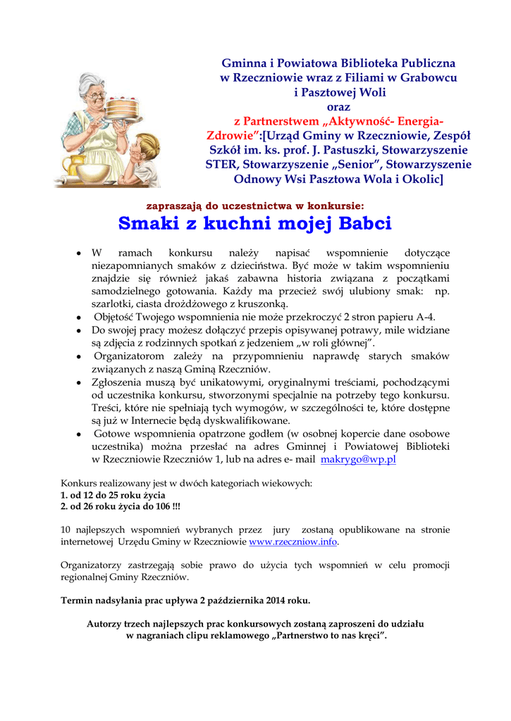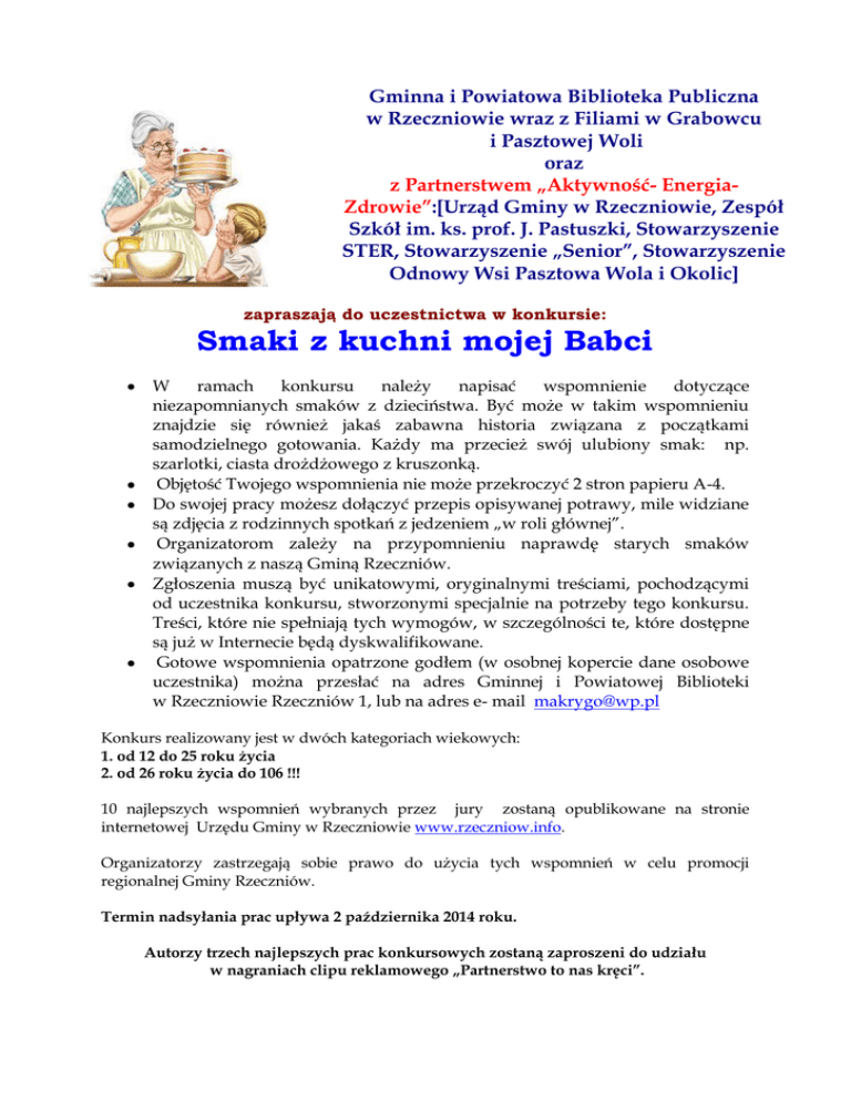 Gminna i Powiatowa Biblioteka Publiczna w Rzeczniowie wraz z Filiami w Grabowcu i Pasztowej Woli oraz z Partnerstwem „Aktywność- EnergiaZdrowie”:[Urząd Gminy w Rzeczniowie, Zespół Szkół im. ks. prof. J. Pastuszki, Stowarzyszenie STER, Stowarzyszenie „Senior”, Stowarzyszenie Odnowy Wsi Pasztowa Wola i Okolic] zapraszają do uczestnictwa w konkursie: Smaki z kuchni mojej Babci W ramach konkursu należy napisać wspomnienie dotyczące niezapomnianych smaków z dzieciństwa. Być może w takim wspomnieniu znajdzie się również jakaś zabawna historia związana z początkami samodzielnego gotowania. Każdy ma przecież swój ulubiony smak: np. szarlotki, ciasta drożdżowego z kruszonką. Objętość Twojego wspomnienia nie może przekroczyć 2 stron papieru A-4. Do swojej pracy możesz dołączyć przepis opisywanej potrawy, mile widziane są zdjęcia z rodzinnych spotkań z jedzeniem „w roli głównej”. Organizatorom zależy na przypomnieniu naprawdę starych smaków związanych z naszą Gminą Rzeczniów. Zgłoszenia muszą być unikatowymi, oryginalnymi treściami, pochodzącymi od uczestnika konkursu, stworzonymi specjalnie na potrzeby tego konkursu. Treści, które nie spełniają tych wymogów, w szczególności te, które dostępne są już w Internecie będą dyskwalifikowane. Gotowe wspomnienia opatrzone godłem (w osobnej kopercie dane osobowe uczestnika) można przesłać na adres Gminnej i Powiatowej Biblioteki w Rzeczniowie Rzeczniów 1, lub na adres e- mail [email protected] Konkurs realizowany jest w dwóch kategoriach wiekowych: 1. od 12 do 25 roku życia 2. od 26 roku życia do 106 !!! 10 najlepszych wspomnień wybranych przez jury zostaną opublikowane na stronie internetowej Urzędu Gminy w Rzeczniowie www.rzeczniow.info. Organizatorzy zastrzegają sobie prawo do użycia tych wspomnień w celu promocji regionalnej Gminy Rzeczniów. Termin nadsyłania prac upływa 2 października 2014 roku. Autorzy trzech najlepszych prac konkursowych zostaną zaproszeni do udziału w nagraniach clipu reklamowego „Partnerstwo to nas kręci”.