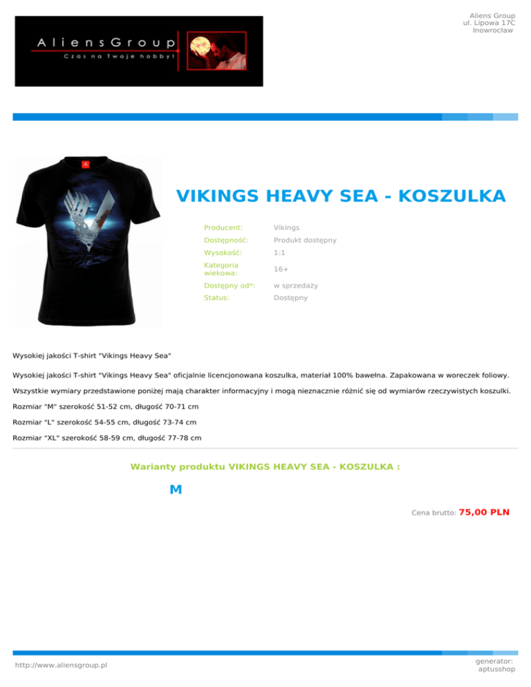 Aliens Group ul. Lipowa 17C Inowrocław VIKINGS HEAVY SEA - KOSZULKA Producent: Vikings Dostępność: Produkt dostępny Wysokość: 1:1 Kategoria wiekowa: 16+ Dostępny od*: w sprzedaży Status: Dostępny Wysokiej jakości T-shirt "Vikings Heavy Sea" Wysokiej jakości T-shirt "Vikings Heavy Sea" oficjalnie licencjonowana koszulka, materiał 100% bawełna. Zapakowana w woreczek foliowy. Wszystkie wymiary przedstawione poniżej mają charakter informacyjny i mogą nieznacznie różnić się od wymiarów rzeczywistych koszulki. Rozmiar "M" szerokość 51-52 cm, długość 70-71 cm Rozmiar "L" szerokość 54-55 cm, długość 73-74 cm Rozmiar "XL" szerokość 58-59 cm, długość 77-78 cm Warianty produktu VIKINGS HEAVY SEA - KOSZULKA : M Cena brutto: http://www.aliensgroup.pl 75,00 PLN generator: aptusshop