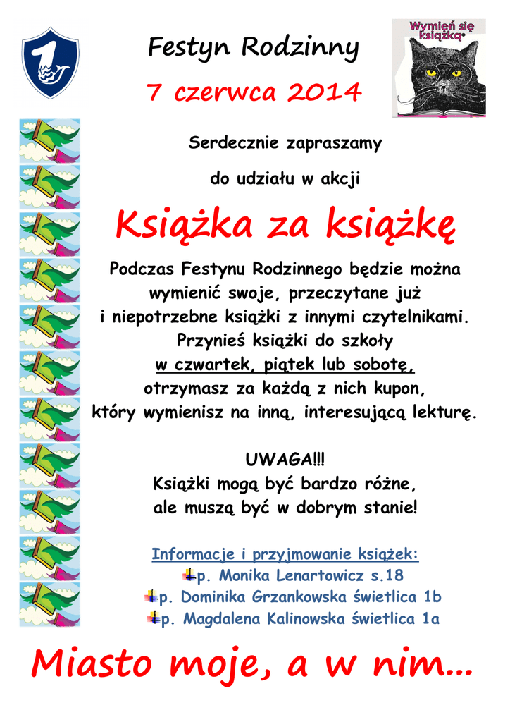 Festyn Rodzinny 7 czerwca 2014 Serdecznie zapraszamy do udziału w akcji Książka za książkę Podczas Festynu Rodzinnego będzie można wymienić swoje, przeczytane już i niepotrzebne książki z innymi czytelnikami. Przynieś książki do szkoły w czwartek, piątek lub sobotę, otrzymasz za każdą z nich kupon, który wymienisz na inną, interesującą lekturę. UWAGA!!! Książki mogą być bardzo różne, ale muszą być w dobrym stanie! Informacje i przyjmowanie książek: p. Monika Lenartowicz s.18 p. Dominika Grzankowska świetlica 1b p. Magdalena Kalinowska świetlica 1a Miasto moje, a w nim...