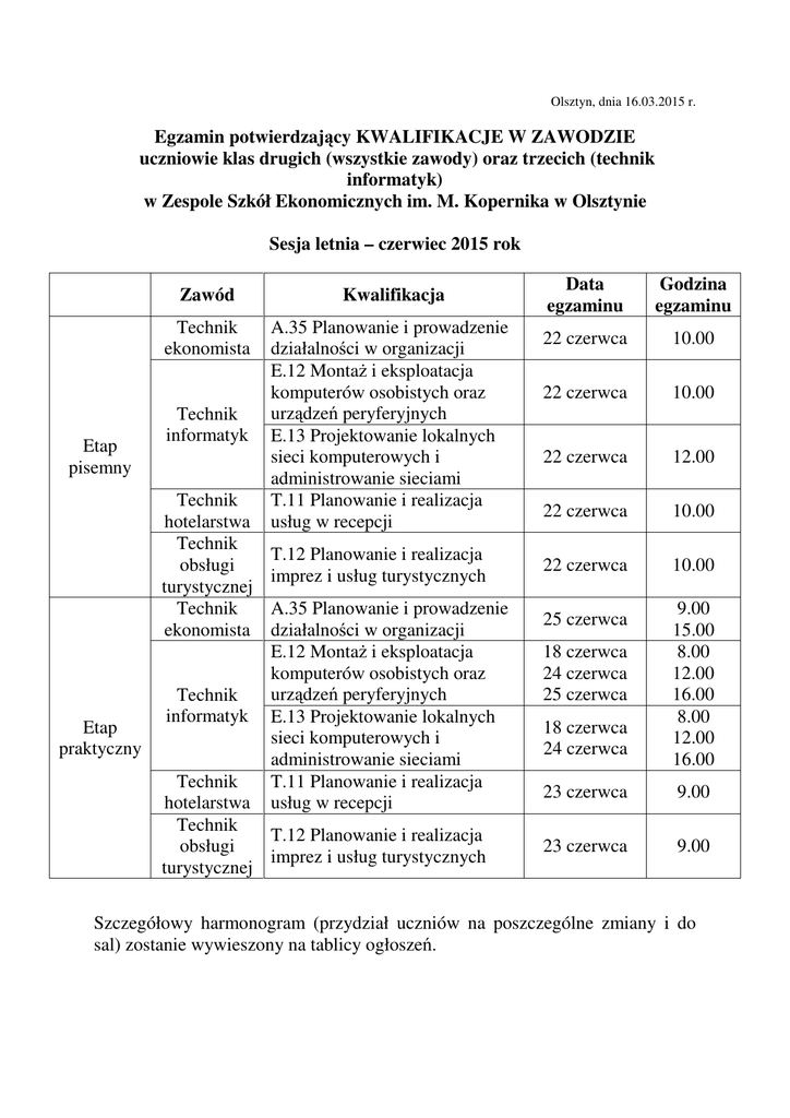 Olsztyn, dnia 16.03.2015 r. Egzamin potwierdzający KWALIFIKACJE W ZAWODZIE uczniowie klas drugich (wszystkie zawody) oraz trzecich (technik informatyk) w Zespole Szkół Ekonomicznych im. M. Kopernika w Olsztynie Sesja letnia – czerwiec 2015 rok Etap pisemny Zawód Kwalifikacja Technik ekonomista A.35 Planowanie i prowadzenie działalności w organizacji E.12 Montaż i eksploatacja komputerów osobistych oraz urządzeń peryferyjnych E.13 Projektowanie lokalnych sieci komputerowych i administrowanie sieciami T.11 Planowanie i realizacja usług w recepcji Technik informatyk Technik hotelarstwa Technik obsługi turystycznej Technik ekonomista Etap praktyczny Technik informatyk T.12 Planowanie i realizacja imprez i usług turystycznych A.35 Planowanie i prowadzenie działalności w organizacji E.12 Montaż i eksploatacja komputerów osobistych oraz urządzeń peryferyjnych E.13 Projektowanie lokalnych sieci komputerowych i administrowanie sieciami T.11 Planowanie i realizacja usług w recepcji Technik hotelarstwa Technik T.12 Planowanie i realizacja obsługi imprez i usług turystycznych turystycznej Data egzaminu Godzina egzaminu 22 czerwca 10.00 22 czerwca 10.00 22 czerwca 12.00 22 czerwca 10.00 22 czerwca 10.00 25 czerwca 18 czerwca 24 czerwca 25 czerwca 18 czerwca 24 czerwca 9.00 15.00 8.00 12.00 16.00 8.00 12.00 16.00 23 czerwca 9.00 23 czerwca 9.00 Szczegółowy harmonogram (przydział uczniów na poszczególne zmiany i do sal) zostanie wywieszony na tablicy ogłoszeń.