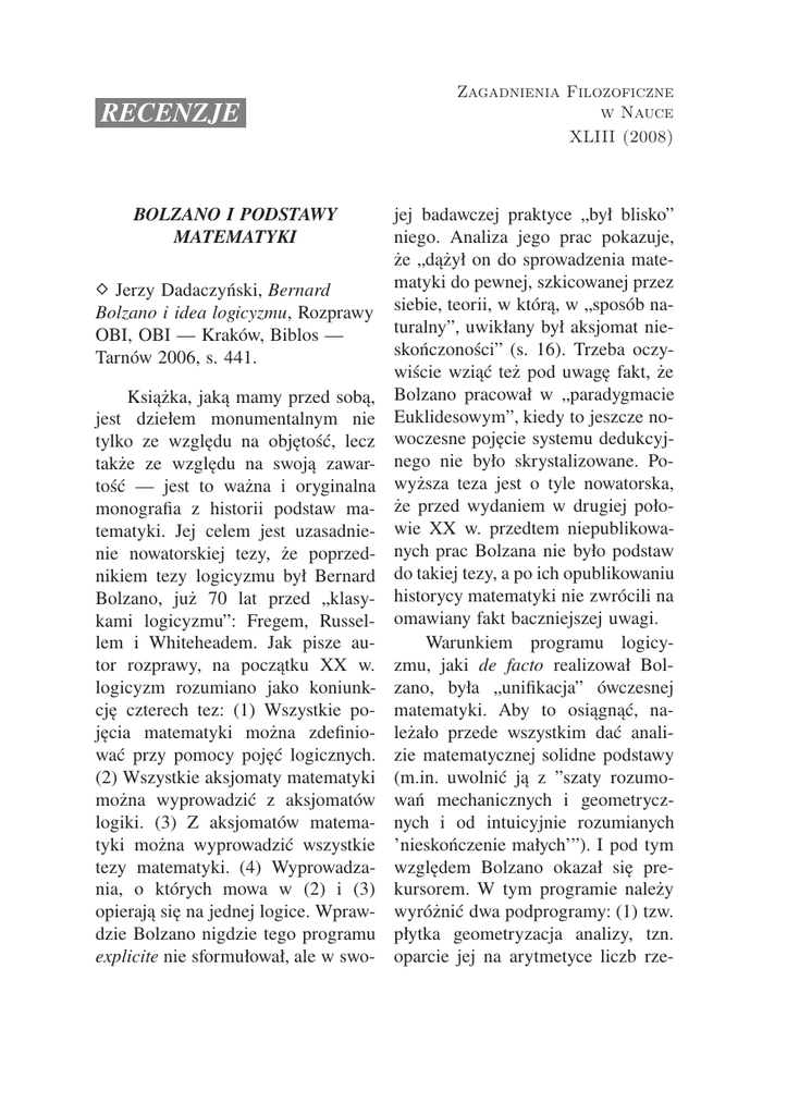 RECENZJE BOLZANO I PODSTAWY MATEMATYKI ⋄ Jerzy Dadaczyński, Bernard Bolzano i idea logicyzmu, Rozprawy OBI, OBI — Kraków, Biblos — Tarnów 2006, s. 441. Książka, jaką mamy przed sobą, jest dziełem monumentalnym nie tylko ze względu na objętość, lecz także ze względu na swoją zawartość — jest to ważna i oryginalna monografia z historii podstaw matematyki. Jej celem jest uzasadnienie nowatorskiej tezy, że poprzednikiem tezy logicyzmu był Bernard Bolzano, już 70 lat przed „klasykami logicyzmu”: Fregem, Russellem i Whiteheadem. Jak pisze autor rozprawy, na początku XX w. logicyzm rozumiano jako koniunkcję czterech tez: (1) Wszystkie pojęcia matematyki można zdefiniować przy pomocy pojęć logicznych. (2) Wszystkie aksjomaty matematyki można wyprowadzić z aksjomatów logiki. (3) Z aksjomatów matematyki można wyprowadzić wszystkie tezy matematyki. (4) Wyprowadzania, o których mowa w (2) i (3) opierają się na jednej logice. Wprawdzie Bolzano nigdzie tego programu explicite nie sformułował, ale w swo- Zagadnienia Filozoficzne w Nauce XLIII (2008) jej badawczej praktyce „był blisko” niego. Analiza jego prac pokazuje, że „dążył on do sprowadzenia matematyki do pewnej, szkicowanej przez siebie, teorii, w którą, w „sposób naturalny”, uwikłany był aksjomat nieskończoności” (s. 16). Trzeba oczywiście wziąć też pod uwagę fakt, że Bolzano pracował w „paradygmacie Euklidesowym”, kiedy to jeszcze nowoczesne pojęcie systemu dedukcyjnego nie było skrystalizowane. Powyższa teza jest o tyle nowatorska, że przed wydaniem w drugiej połowie XX w. przedtem niepublikowanych prac Bolzana nie było podstaw do takiej tezy, a po ich opublikowaniu historycy matematyki nie zwrócili na omawiany fakt baczniejszej uwagi. Warunkiem programu logicyzmu, jaki de facto realizował Bolzano, była „unifikacja” ówczesnej matematyki. Aby to osiągnąć, należało przede wszystkim dać analizie matematycznej solidne podstawy (m.in. uwolnić ją z ”szaty rozumowań mechanicznych i geometrycznych i od intuicyjnie rozumianych ’nieskończenie małych’”). I pod tym względem Bolzano okazał się prekursorem. W tym programie należy wyróżnić dwa podprogramy: (1) tzw. płytka geometryzacja analizy, tzn. oparcie jej na arytmetyce liczb rze- 142 Recenzje czywistych oraz (2) dogłębna arytmetyzacja analizy, tzn. oparcie jej na arytmetyce liczb naturalnych. Płytką arytmetyzację analizy Bolzano wykonał przez poprawne zdefiniowanie granicy ciągu, granicy funkcji, ciągłości funkcji i pochodnej funkcji. Warunkiem przeprowadzenia dogłębnej arytmetyzacji analizy jest skonstruowanie modelu liczb rzeczywistych w dziedzinie liczb wymiernych (model tych ostatnich w dziedzinie liczb naturalnych był już znany). Tu ma miejsce interesujący epizod. Ponieważ rękopisy Bolzana, opublikowane w 1962 r., zawierały pod tym względem wiele niejasności, należało zaproponowaną przez niego procedurę konstrukcji liczb rzeczywistych odpowiednio zrekonstruować. J. Dadaczyński obszernie omawia trzy takie rekonstrukcje, a mianowicie rekonstrukcję K. Rychlika, B. van Rootselaara oraz D. Laugwitza. Ta ostatnie okazała się trafna. Gdy w 1976 r. opublikowano resztę rękopisów Bolzana, stało się jasnym, że uściślił on swoje pierwotnie nieścisłe definicje dokładnie tak, jak zrekonstruował je Laugwitz. Dadaczyński konkluduje: „Interpretacja konstrukcji Bolzana, dokonana przez Laugwitza i potwierdzona zmianami tekstu samego Bolzana, pokazuje, że była ona oparta wyłącznie na podstawach arytmetycznych — nieskończonych ciągach liczb wymiernych” (s. 211). W ten sposób Bolzano doko- nał w istocie dogłębnej arytmetyzacji analizy matematycznej. Należy w tym miejscu zadać pytanie, w jakim sensie Bolzano antycypował Cauchy’ego, Weierstrassa, Cantora i innych. We wstępie do swej rozprawy Dadaczyński pisze, iż będzie „’życzliwie’ dopatrywać się w poszczególnych poczynaniach Bolzana antycypacji późniejszych rozwiązań” (s. 20). Ale co to znaczy? Rozpatrzmy przykład: Na s. 106 Dadaczyński przytacza twierdzenie sformułowane przez Bolzana, które w dzisiejszym języku można by ująć następująco: Każdy ciąg Cauchy’ego zmierza do pewnej granicy (abstrahuję od tego, że — wedle dzisiejszych standardów — twierdzenie to jest nieścisłe bez podania przestrzeni, w której ma ono zachodzić). Należy się zgodzić, że poprzednik tego twierdzenia (w sformułowaniu Bolzana) jest w istocie poprawną definicją ciągu Cauchy’ego i że łatwo ją przełożyć na współczesny „język delt i epsilonów”. Następnik tego twierdzenia miałby być antycypacją późniejszej definicji granicy ciągu. Następnik ten w sformułowaniu Bolzana brzmi: „to za każdym razem istnieje pewna stała wielkość, i to tylko jedna, do której wyrazy tego ciągu coraz bardziej się zbliżają, i które mogą podejść do niej tak blisko, jak tylko się chce, jeśli ten ciąg odpowiednio się przedłuża” (s. 106). Widzimy, że pozostały tu niejasne intuicje „zbliżania się” i ”podchodzenia”. Dadaczyń- Recenzje ski pisze: „Bolzano był w stanie podać definicję granicy ciągu, posługując się ’algebrą nierówności’ i wyrażeniami kwantyfikatorowymi, a nie uczynił tego ze względów stylistycznych. Musiałby bowiem w następniku implikacji — wewnątrz jednego zdania złożonego — użyć tych samych lub bardzo zbliżonych sformułowań do tych, których użył w jego poprzedniku” (ss. 108–109). Jest to niewątpliwie interpretacja „życzliwa”. Musimy także pamiętać, że nie jest to definicja explicite, lecz jedynie „w uwikłaniu” (jako następnik w twierdzeniu). Jest to stopień życzliwości, który chętnie akceptuję. Większe opory miałbym w stosunku do tego, co Dadaczyński pisze na temat Bolzana definicji granicy funkcji. Jego zdaniem, definicja ta jest implicite zawarta w B