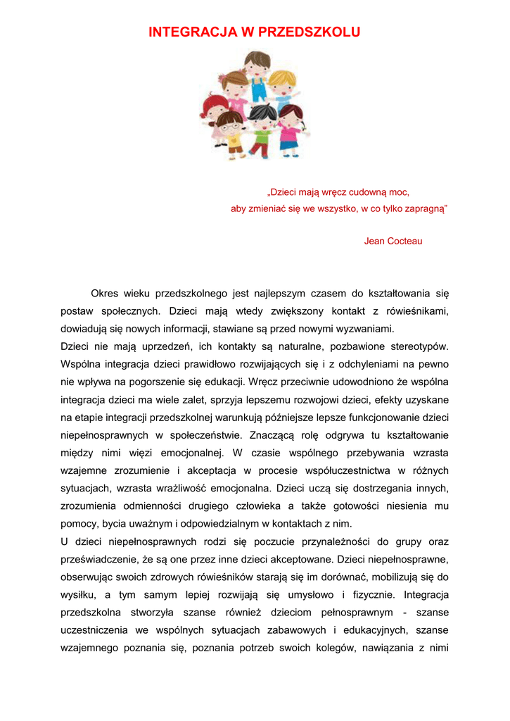 INTEGRACJA W PRZEDSZKOLU „Dzieci mają wręcz cudowną moc, aby zmieniać się we wszystko, w co tylko zapragną” Jean Cocteau Okres wieku przedszkolnego jest najlepszym czasem do kształtowania się postaw społecznych. Dzieci mają wtedy zwiększony kontakt z rówieśnikami, dowiadują się nowych informacji, stawiane są przed nowymi wyzwaniami. Dzieci nie mają uprzedzeń, ich kontakty są naturalne, pozbawione stereotypów. Wspólna integracja dzieci prawidłowo rozwijających się i z odchyleniami na pewno nie wpływa na pogorszenie się edukacji. Wręcz przeciwnie udowodniono że wspólna integracja dzieci ma wiele zalet, sprzyja lepszemu rozwojowi dzieci, efekty uzyskane na etapie integracji przedszkolnej warunkują późniejsze lepsze funkcjonowanie dzieci niepełnosprawnych w społeczeństwie. Znaczącą rolę odgrywa tu kształtowanie między nimi więzi emocjonalnej. W czasie wspólnego przebywania wzrasta wzajemne zrozumienie i akceptacja w procesie współuczestnictwa w różnych sytuacjach, wzrasta wrażliwość emocjonalna. Dzieci uczą się dostrzegania innych, zrozumienia odmienności drugiego człowieka a także gotowości niesienia mu pomocy, bycia uważnym i odpowiedzialnym w kontaktach z nim. U dzieci niepełnosprawnych rodzi się poczucie przynależności do grupy oraz przeświadczenie, że są one przez inne dzieci akceptowane. Dzieci niepełnosprawne, obserwując swoich zdrowych rówieśników starają się im dorównać, mobilizują się do wysiłku, a tym samym lepiej rozwijają się umysłowo i fizycznie. Integracja przedszkolna stworzyła szanse również dzieciom pełnosprawnym - szanse uczestniczenia we wspólnych sytuacjach zabawowych i edukacyjnych, szanse wzajemnego poznania się, poznania potrzeb swoich kolegów, nawiązania z nimi więzi koleżeńskich oraz uczenia się udzielania im pomocy. Dziecko pełnosprawne zwykle „podnosi poprzeczkę” dla swoich możliwości, stara się być coraz lepsze, by być wzorem dla swego niepełnosprawnego kolegi a co najważniejsze w kontakcie z dzieckiem niepełnosprawnym kształtuje swoją wrażliwość, uczy się rozumienia swoich mniej sprawnych kolegów. Ważne jest to aby dzieci mogły się w kontaktach z niepełnosprawnymi wzorować się na odzwierciedlenie dorosłych. Bo to jak my traktujemy takie osoby ma swoje w zachowaniu się dzieci. Nie należy nazywać osoby niepełnosprawne gorszymi, możemy tłumaczyć własnym dzieciom dlaczego dzieci zachowują się „dziwnie” tym, że te dzieci są chore lub po prostu inne. Inne – co nie znaczy gorsze! Bo inność to coś wyjątkowego. Opracowanie: Monika Dworaczek