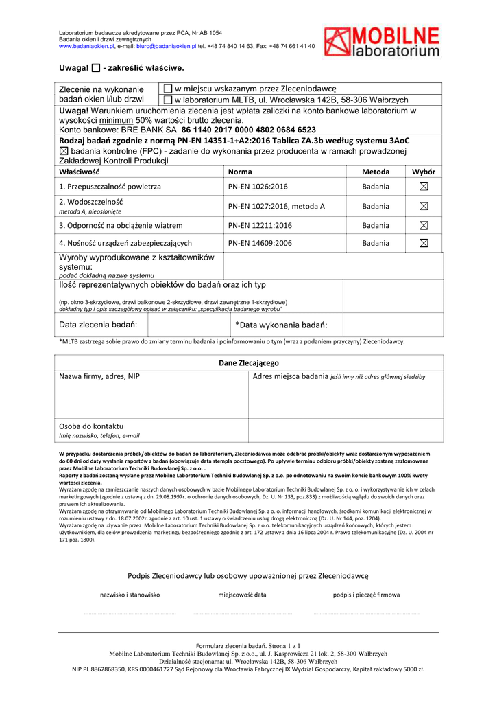 Laboratorium badawcze akredytowane przez PCA, Nr AB 1054 Badania okien i drzwi zewnętrznych www.badaniaokien.pl, e-mail: [email protected] tel. +48 74 840 14 63, Fax: +48 74 661 41 40 Uwaga! - zakreślić właściwe. w miejscu wskazanym przez Zleceniodawcę Zlecenie na wykonanie badań okien i/lub drzwi w laboratorium MLTB, ul. Wrocławska 142B, 58-306 Wałbrzych Uwaga! Warunkiem uruchomienia zlecenia jest wpłata zaliczki na konto bankowe laboratorium w wysokości minimum 50% wartości brutto zlecenia. Konto bankowe: BRE BANK SA 86 1140 2017 0000 4802 0684 6523 Rodzaj badań zgodnie z normą PN-EN 14351-1+A2:2016 Tablica ZA.3b według systemu 3AoC badania kontrolne (FPC) - zadanie do wykonania przez producenta w ramach prowadzonej Zakładowej Kontroli Produkcji Właściwość Norma Metoda Wybór 1. Przepuszczalność powietrza PN-EN 1026:2016 Badania PN-EN 1027:2016, metoda A Badania 3. Odporność na obciążenie wiatrem PN-EN 12211:2016 Badania 4. Nośność urządzeń zabezpieczających PN-EN 14609:2006 Badania 2. Wodoszczelność metoda A, nieosłonięte Wyroby wyprodukowane z kształtowników systemu: podać dokładną nazwę systemu Ilość reprezentatywnych obiektów do badań oraz ich typ (np. okno 3-skrzydłowe, drzwi balkonowe 2-skrzydłowe, drzwi zewnętrzne 1-skrzydłowe) dokładny typ i opis szczegółowy opisać w załączniku: „specyfikacja badanego wyrobu” Data zlecenia badań: *Data wykonania badań: *MLTB zastrzega sobie prawo do zmiany terminu badania i poinformowaniu o tym (wraz z podaniem przyczyny) Zleceniodawcy. Dane Zlecającego Nazwa firmy, adres, NIP Adres miejsca badania jeśli inny niż adres głównej siedziby Osoba do kontaktu Imię nazwisko, telefon, e-mail W przypadku dostarczenia próbek/obiektów do badań do laboratorium, Zleceniodawca może odebrać próbki/obiekty wraz dostarczonym wyposażeniem do 60 dni od daty wysłania raportów z badań (obowiązuje data stempla pocztowego). Po upływie terminu odbioru próbki/obiekty zostaną zezłomowane przez Mobilne Laboratorium Techniki Budowlanej Sp. z o.o. . Raporty z badań zostaną wysłane przez Mobilne Laboratorium Techniki Budowlanej Sp. z o.o. po odnotowaniu na swoim koncie bankowym 100% kwoty wartości zlecenia. Wyrażam zgodę na zamieszczanie naszych danych osobowych w bazie Mobilnego Laboratorium Techniki Budowlanej Sp. z o. o. i wykorzystywanie ich w celach marketingowych (zgodnie z ustawą z dn. 29.08.1997r. o ochronie danych osobowych, Dz. U. Nr 133, poz.833) z możliwością wglądu do swoich danych oraz prawem ich aktualizowania. Wyrażam zgodę na otrzymywanie od Mobilnego Laboratorium Techniki Budowlanej Sp. z o. o. informacji handlowych, środkami komunikacji elektronicznej w rozumieniu ustawy z dn. 18.07.2002r. zgodnie z art. 10 ust. 1 ustawy o świadczeniu usług drogą elektroniczną (Dz. U. Nr 144, poz. 1204). Wyrażam zgodę na używanie przez Mobilne Laboratorium Techniki Budowlanej Sp. z o.o. telekomunikacyjnych urządzeń końcowych, których jestem użytkownikiem, dla celów prowadzenia marketingu bezpośredniego zgodnie z art. 172 ustawy z dnia 16 lipca 2004 r. Prawo telekomunikacyjne (Dz. U. 2004 nr 171 poz. 1800). Podpis Zleceniodawcy lub osobowy upoważnionej przez Zleceniodawcę nazwisko i stanowisko miejscowość data podpis i pieczęć firmowa …………………………………………………… ……………………………………………………….. …………………………………………………………… Formularz zlecenia badań. Strona 1 z 1 Mobilne Laboratorium Techniki Budowlanej Sp. z o.o., ul. J. Kasprowicza 21 lok. 2, 58-300 Wałbrzych Działalność stacjonarna: ul. Wrocławska 142B, 58-306 Wałbrzych NIP PL 8862868350, KRS 0000461727 Sąd Rejonowy dla Wrocławia Fabrycznej IX Wydział Gospodarczy, Kapitał zakładowy 5000 zł.