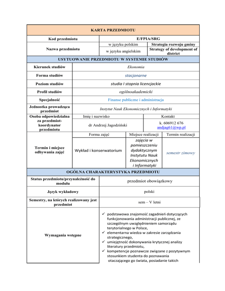 KARTA PRZEDMIOTU E/FPIA/SRG w języku polskim Strategia rozwoju gminy Strategy of development of w języku angielskim district Kod przedmiotu Nazwa przedmiotu USYTUOWANIE PRZEDMIOTU W SYSTEMIE STUDIÓW Kierunek studiów Ekonomia Forma studiów stacjonarne Poziom studiów studia I stopnia licencjackie Profil studiów ogólnoakademicki Specjalność Finanse publiczne i administracja Jednostka prowadząca przedmiot Osoba odpowiedzialna za przedmiotkoordynator przedmiotu Instytut Nauk Ekonomicznych i Informatyki Imię i nazwisko k. 606912 676 [email protected] dr Andrzej Jagodziński Forma zajęć Termin i miejsce odbywania zajęć Kontakt Wykład i konserwatorium Miejsce realizacji Termin realizacji zajęcia w pomieszczeniu dydaktycznym Instytutu Nauk Ekonomicznych i Informatyki semestr zimowy OGÓLNA CHARAKTERYSTYKA PRZEDMIOTU Status przedmiotu/przynależność do modułu przedmiot obowiązkowy Język wykładowy polski Semestry, na których realizowany jest przedmiot sem – V letni Wymagania wstępne podstawowa znajomość zagadnień dotyczących funkcjonowania administracji publicznej, ze szczególnym uwzględnieniem samorządu terytorialnego w Polsce, elementarna wiedza w zakresie zarządzania strategicznego, umiejętność dokonywania krytycznej analizy literatury przedmiotu, kompetencje poznawcze związane z pozytywnym stosunkiem studenta do poznawania otaczającego go świata, posiadanie takich predyspozycji i zdolności, jak chęć uczenia się, rozumienia, zapamiętywania czy unikania stereotypów. FORMY, SPOSOBY I METODY PROWADZENIA ZAJĘĆ Formy zajęć Liczba godzin Wykład ćwiczenia lektorat konwersatorium seminarium rok Semestr r s r s r s r s 15 15 x x x x 30 30 x x Sposób realizacji zajęć Wykład i konwersatorium Sposób zaliczenia zajęć Metody dydaktyczne Przedmioty powiązane/moduł Wykład – egzamin pisemny Konwersatorium – kolokwium zaliczeniowe, różnego rodzaju aktywności studentów oraz obecność na zajęciach. Wykład z prezentacją multimedialną, folie. Konwersatorium - studium przypadku, prezentacje multimedialne Administracja publiczna, Zarządzanie strategiczne w firmie, : Regionalna polityka strukturalna i polityka rozwoju lokalnego, Menadżer publiczny A. Miszczuk ( i in.): Warszawa: Gospodarka samorządu terytorialnego. Warszawa: PWN 2007. Podstawowa K. Pająk. Piła: Samorząd terytorialny w kształtowaniu rozwoju lokalnego. Piła: PWSZ w Pile 2006. S. Wykrętowicz. Poznań: Samorząd w Polsce. Istota. Formy. Zadania. Wykaz Wyższa Szkoła Bankowa w Poznaniu 2008. literatury Z. Strzelecki ( i in.): Strategia Rozwoju Województwa Mazowieckiego do Uzupełnia roku 2020. Mazowieckie Biuro Planowania Przestrzennego i Rozwoju jąca Regionalnego 2006. B. Filipiak. Warszawa: Strategie finansowe jednostek samorządu terytorialnego. Warszawa: PWE 2008. CELE, TREŚCI I EFEKTY KSZTAŁCENIA Cele przedmiotu (ogólne, szczegółowe) Nauczyć: specyfiki zarządzania strategicznego w jednostkach samorządu terytorialnego; zasad i procedur formułowania strategii rozwoju gminy zarówno w ujęciu teoretycznym. Zapoznać: z rolą samorządu w zarządzaniu rozwojem lokalnym i regionalnym, ze strategicznym zarządzaniem rozwojem gminy, z podstawowymi funkcjami i metodami opracowywania strategii rozwoju gminy, ze strategiami rozwoju wybranych gmin w Polsce. Treści programowe Efekty kształcenia (kody) Forma zajęć Temat Liczba godzin W01 W02 W03 U01 U02 K01 K02 Wykłady i konwersatoriu m W1 Nowe zarządzania publicznego (New public management) – strategie nowego zarządzania publicznego. Menedżerowie organizacji publicznych; K1 Wizja, misji, strategia i cele organizacji publicznej. Ujęcie teoretyczne i praktyczne; W2 Zarządzanie strategiczne w jednostkach samorządu terytorialnego; W3 – K2 Samorząd terytorialny w kształtowaniu rozwoju lokalnego. Wpływ organów samorządu terytorialnego na rozwój lokalny; W 4 i K3 Strategia rozwoju jako instrument rozwoju lokalnego i regionalnego. Rodzaje strategii; W 5 i K4 Elementy planu rozwoju lokalnego gminy; W 6 i K5 Przesłanki społeczne, ekonomiczne, prawne oraz ekologiczne strategii gminy W 7 i K6 Aktywność mieszkańców w rozwoju lokalnym; K7 Fazy budowy strategii gminy. Analizy strategiczne. Opracowywanie strategii gminy; W 8 i K8 System wdrażania, monitorowania, ewaluacji i finansowania strategii gminy; K 9 Analiza wybranych strategii rozwoju gmin. Przykłady. W1 – 2; K1 - 4 W2 – 2; K2 - 4 W3 – 2; K3 - 4 W4 – 2; K4 - 2 W5 – 2; K5 - 2 W6 – 2; K6 - 2 W7 – 1; K7 - 4 W8 – 2; K8-4 K9 – 4 Efekty kształcenia Student, który zaliczył przedmiot kod w zakresie WIEDZY W01 W02 W03 zna i rozumie podstawowe zagadnienia z zakresu funkcjonowania administracji publicznej, ze szczególnym uwzględnieniem samorządu terytorialnego, w tym problematyki rozwoju lokalnego i regionalnego posiada elementarną wiedzę z zakresu zarządzania strategicznego w jednostkach samorządu terytorialnego; ma podstawową wiedzę dotyczącą zasad i procedur formułowania strategii rozwoju gminy w ujęciu teoretycznym i praktycznym Odniesienie do efektów kształcenia dla kierunku K_W13 K_W14 K_ W15 w zakresie UMIEJĘTNOŚCI U01 potrafi wykorzystać wiedzę teoretyczną do interpretacji konkretnych problemów ekonomiczno - społecznych z zakresu funkcjonowania samorządu terytorialnego niezbędną do K_ U17 formułowania strategii rozwoju gminy U02 K01 wykorzystuje terminologię z zakresu strategii rozwoju gminy w podejmowanych dyskursach naukowych , w pisaniu prac - w ściśle określonych obszarach przedmiotowej materii K_ U18 w zakresie KOMPETENCJI potrafi właściwie analizować i interpretować konkretne zagadnienia z zakresu samorządu terytorialnego, stanowiące element strategii rozwoju; K_K14 Metody oceny Wykład – egzamin pisemny Konwersatorium – kolokwium zaliczeniowe, różnego rodzaju aktywności studentów oraz obecność na zajęciach. Egzamin ustny Efekty kształce nia (kody) Egzamin pisemny Projekt Kolok