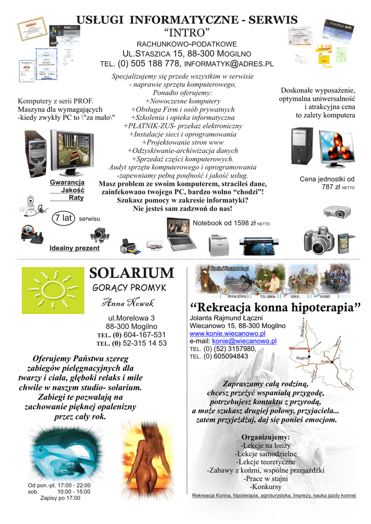 USŁUGI INFORMATYCZNE - SERWIS “INTRO” RACHUNKOWO-PODATKOWE UL.STASZICA 15, 88-300 MOGILNO TEL. (0) 505 188 778, [email protected] Specjalizujemy się przede wszystkim w serwisie - naprawie sprzętu komputerowego, Ponadto oferujemy: +Nowoczesne komputery Komputery z serii PROF. +Obsługa Firm i osób prywatnych Maszyna dla wymagających +Szkolenia i opieka informatyczna -kiedy zwykły PC to \"za mało\" +PŁATNIK-ZUS- przekaz elektroniczny +Instalacje sieci i oprogramowania +Projektowanie stron www +Odzyskiwanie-archiwizacja danych +Sprzedaż części komputerowych. Audyt sprzętu komputerowego i oprogramowania -zapewniamy pełną poufność i jakość usług. Gwarancja Masz problem ze swoim komputerem, straciłeś dane, Jakość zainfekowano twojego PC, bardzo wolno “chodzi”! Raty Szukasz pomocy w zakresie informatyki? Nie jesteś sam zadzwoń do nas! 7 lat serwisu Doskonałe wyposażenie, optymalna uniwersalność i atrakcyjna cena to zalety komputera Cena jednostki od 787 zł NETTO Notebook od 1598 zł NETTO Idealny prezent SOLARIUM GORĄCY PROMYK Anna Nowak ul.Morelowa 3 88-300 Mogilno TEL. (0) 604-167-531 TEL. (0) 52-315 14 53 Oferujemy Państwu szereg zabiegów pielęgnacyjnych dla twarzy i ciała, głęboki relaks i miłe chwile w naszym studio- solarium. Zabiegi te pozwalają na zachowanie pięknej opalenizny przez cały rok. Od pon.-pt. 17:00 - 22:00 sob. 10:00 - 15:00 Zapisy po 17:00 “Rekreacja konna hipoterapia” Jolanta Rajmund Łączni Wiecanowo 15, 88-300 Mogilno www.konie.wiecanowo.pl e-mail: [email protected] TEL. (0) (52) 3157980, TEL. (0) 605094843 Zapraszamy całą rodziną, chcesz przeżyć wspaniałą przygodę, potrzebujesz kontaktu z przyrodą, a może szukasz drugiej połowy, przyjaciela... zatem przyjeżdżaj, daj się ponieś emocjom. Organizujemy: -Lekcje na lonży -Lekcje samodzielne -Lekcje teoretyczne -Zabawy z końmi, wspólne przejażdżki -Prace w stajni -Konkursy Rekreacja Konna, hipoterapia, agroturystyka, imprezy, nauka jazdy konnej