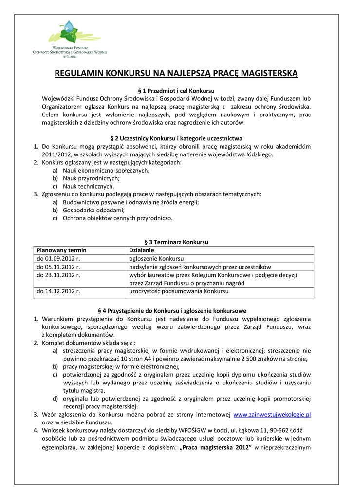 REGULAMIN KONKURSU NA NAJLEPSZĄ PRACĘ MAGISTERSKĄ § 1 Przedmiot i cel Konkursu Wojewódzki Fundusz Ochrony Środowiska i Gospodarki Wodnej w Łodzi, zwany dalej Funduszem lub Organizatorem ogłasza Konkurs na najlepszą pracę magisterską z zakresu ochrony środowiska. Celem konkursu jest wyłonienie najlepszych, pod względem naukowym i praktycznym, prac magisterskich z dziedziny ochrony środowiska oraz nagrodzenie ich autorów. § 2 Uczestnicy Konkursu i kategorie uczestnictwa 1. Do Konkursu mogą przystąpić absolwenci, którzy obronili pracę magisterską w roku akademickim 2011/2012, w szkołach wyższych mających siedzibę na terenie województwa łódzkiego. 2. Konkurs ogłaszany jest w następujących kategoriach: a) Nauk ekonomiczno-społecznych; b) Nauk przyrodniczych; c) Nauk technicznych. 3. Zgłoszeniu do konkursu podlegają prace w następujących obszarach tematycznych: a) Budownictwo pasywne i odnawialne źródła energii; b) Gospodarka odpadami; c) Ochrona obiektów cennych przyrodniczo. Planowany termin do 01.09.2012 r. do 05.11.2012 r. do 23.11.2012 r. do 14.12.2012 r. § 3 Terminarz Konkursu Działanie ogłoszenie Konkursu nadsyłanie zgłoszeń konkursowych przez uczestników wybór laureatów przez Kolegium Konkursowe i podjęcie decyzji przez Zarząd Funduszu o przyznaniu nagród uroczystość podsumowania Konkursu § 4 Przystąpienie do Konkursu i zgłoszenie konkursowe 1. Warunkiem przystąpienia do Konkursu jest nadesłanie do Funduszu wypełnionego zgłoszenia konkursowego, sporządzonego według wzoru zatwierdzonego przez Zarząd Funduszu, wraz z kompletem dokumentów. 2. Komplet dokumentów składa się z : a) streszczenia pracy magisterskiej w formie wydrukowanej i elektronicznej; streszczenie nie powinno przekraczać 10 stron A4 i powinno zawierać maksymalnie 2 500 znaków na stronie, b) pracy magisterskiej w formie elektronicznej, c) potwierdzonej za zgodność z oryginałem przez uczelnię kopii dyplomu ukończenia studiów wyższych lub wydanego przez uczelnię zaświadczenia o ukończeniu studiów i uzyskaniu tytułu magistra, d) oryginału lub potwierdzonej za zgodność z oryginałem przez uczelnię kopii promotorskiej recenzji pracy magisterskiej. 3. Wzór zgłoszenia do Konkursu można pobrać ze strony internetowej www.zainwestujwekologie.pl oraz w siedzibie Funduszu. 4. Wniosek konkursowy należy dostarczyć do siedziby WFOŚiGW w Łodzi, ul. Łąkowa 11, 90-562 Łódź osobiście lub za pośrednictwem podmiotu świadczącego usługi pocztowe lub kurierskie w jednym egzemplarzu, w zaklejonej kopercie z dopiskiem: „Praca magisterska 2012” w nieprzekraczalnym terminie do 05.11.2012 r., przy czym data wpływu rozumiana jest jako termin dostarczenia do siedziby Funduszu. § 5 Kolegium Konkursowe i zasady oceny zgłoszeń 1. Oceny nadesłanych zgłoszeń w każdej z kategorii dokona powołane przez Zarząd Funduszu Kolegium Konkursowe, zwane dalej Kolegium. 2. Wnioski konkursowe niezgodne z Regulaminem, w tym złożone po terminie wskazanym w § 4 ust. 4 Regulaminu, nie podpisane lub nieprawidłowo wypełnione, nie kompletne, nie będą podlegały ocenie Kolegium. 3. Kolegium dokona oceny nadesłanych zgłoszeń biorąc po uwagę: wartość naukową pracy, oryginalność sformułowania problemu badawczego, innowacyjność proponowanych rozwiązań i znaczenie podjętej w pracy problematyki dla województwa łódzkiego. § 6 Nagrody w Konkursie, wypłata i przeznaczenie nagród 1. Nagrody w Konkursie są nagrodami pieniężnymi. 2. Przewidywane są nagrody w wysokości po 5.000,00 zł dla zwycięzców w każdej kategorii, w każdym z obszarów tematycznych. Ogółem przewidywana pula nagród wynosi 45.000,00 zł. Oprócz nagród pieniężnych laureaci otrzymają dyplomy. 3. Ostateczne propozycje co do ilości nagród w Konkursie, po ocenie przedstawionych prac, Kolegium przedstawia Zarządowi Funduszu wnioskując o ich zatwierdzenie. Decyzja Zarządu Funduszu w tym zakresie jest ostateczna. 4. Zarząd Funduszu może w uzasadnionym przypadku dokonać zwiększenia puli środków przeznaczonych na Konkurs. 5. Wypłata nagrody pieniężnej następuje na wskazany przez laureata rachunek bankowy. Nagroda wypłacana osobie fizycznej podlega opodatkowaniu podatkiem dochodowym, zgodnie z obowiązującymi w tym zakresie przepisami. 6. Laureaci Konkursu zostaną poinformowani o miejscu i terminie ogłoszenia wyników i uroczystości podsumowującej Konkurs ze stosownym wyprzedzeniem. § 7 Postanowienia końcowe 1. O sprawach nieuregulowanych niniejszym Regulaminem decyduje Organizator Konkursu. 2. Nadesłane zgłoszenia konkursowe wraz z załącznikami nie będą zwracane. 3. Wszelkie wątpliwości interpretacyjne odnośnie postanowień Regulaminu rozstrzyga Zarząd Funduszu. 4. Zapytania dotyczące Konkursu można zgłaszać telefonicznie, faksem lub pocztą elektroniczną: nr tel. 42 66 34 196 lub 197, nr faks: 42 639 51 21, e-mail: [email protected]. 5. Przystąpienie do Konkursu oznacza akceptację postanowień niniejszego Regulaminu. 6. Wyniki Konkursu podawane są do publicznej wiadomości na stronie internetowej WFOŚiGW w Łodzi.