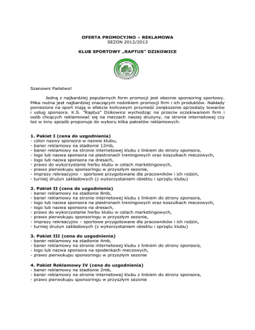 OFERTA PROMOCYJNO – REKLAMOWA SEZON 2012/2013 KLUB SPORTOWY „RAPTUS” DZIKOWICE Szanowni Państwo! Jedną z najbardziej popularnych form promocji jest obecnie sponsoring sportowy. Piłka nożna jest najbardziej znaczącym nośnikiem promocji firm i ich produktów. Nakłady poniesione na sport mają w efekcie końcowym przynieść zwiększenie sprzedaży towarów i usług sponsora. K.S. ”Raptus” Dzikowice wychodząc na przeciw oczekiwaniom firm i osób chcących reklamować się na meczach naszej drużyny, na stronie internetowej czy też w inny sposób proponuje do wyboru kilka pakietów reklamowych. 1. Pakiet I (cena do uzgodnienia) - człon nazwy sponsora w nazwie klubu, - baner reklamowy na stadionie 12mb, - baner reklamowy na stronie internetowej klubu z linkiem do strony sponsora, - logo lub nazwa sponsora na plastronach treningowych oraz koszulkach meczowych, - logo lub nazwa sponsora na dresach, - prawo do wykorzystanie herbu klubu w celach marketingowych, - prawo pierwokupu sponsoringu w przyszłym sezonie, - imprezy rekreacyjno – sportowe przygotowane dla pracowników i ich rodzin, - turniej drużyn zakładowych (z wykorzystaniem obiektu i sprzętu klubu) 2. Pakiet II (cena do uzgodnienia) - baner reklamowy na stadionie 8mb, - baner reklamowy na stronie internetowej klubu z linkiem do strony sponsora, - logo lub nazwa sponsora na plastronach treningowych oraz koszulkach meczowych, - logo lub nazwa sponsora na dresach, - prawo do wykorzystanie herbu klubu w celach marketingowych, - prawo pierwokupu sponsoringu w przyszłym sezonie, - imprezy rekreacyjno – sportowe przygotowane dla pracowników i ich rodzin, - turniej drużyn zakładowych (z wykorzystaniem obiektu i sprzętu klubu) 3. Pakiet III (cena do uzgodnienia) - baner reklamowy na stadionie 4mb, - baner reklamowy na stronie internetowej klubu z linkiem do strony sponsora, - logo lub nazwa sponsora na spodenkach meczowych, - prawo pierwokupu sponsoringu w przyszłym sezonie 4. Pakiet Reklamowy IV (cena do uzgodnienia) - baner reklamowy na stadionie 2mb, - baner reklamowy na stronie internetowej klubu z linkiem do strony sponsora, - prawo pierwokupu sponsoringu w przyszłym sezonie Żywimy nadzieję, że niniejsza oferta sponsorska znajdzie uznanie w Państwa oczach oraz miejsce wśród celów marketingowych Państwa Firmy, a ewentualna współpraca przyniesie wymierne korzyści zarówno Państwu, jak i naszemu klubowi. Zdajemy sobie sprawę, iż nasza oferta nie wyczerpuje wszystkich form przekazu marketingowego, w związku z powyższym jesteśmy otwarci na wszelkie Państwa sugestie dotyczące innych metod promocji. W przypadku chęci współpracy prosimy o kontakt: [email protected] tel: 697-571-957 Ze sportowym pozdrowieniem Andrzej Olejków - prezes