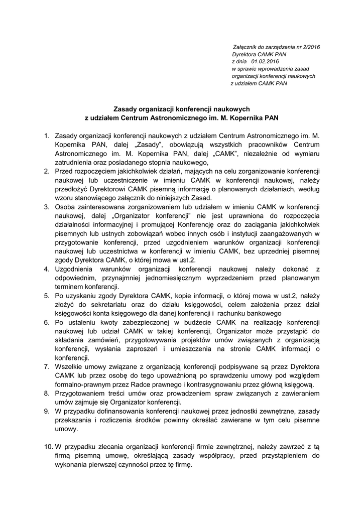 Załącznik do zarządzenia nr 2/2016 Dyrektora CAMK PAN z dnia 01.02.2016 w sprawie wprowadzenia zasad organizacji konferencji naukowych z udziałem CAMK PAN Zasady organizacji konferencji naukowych z udziałem Centrum Astronomicznego im. M. Kopernika PAN 1. Zasady organizacji konferencji naukowych z udziałem Centrum Astronomicznego im. M. Kopernika PAN, dalej „Zasady”, obowiązują wszystkich pracowników Centrum Astronomicznego im. M. Kopernika PAN, dalej „CAMK”, niezależnie od wymiaru zatrudnienia oraz posiadanego stopnia naukowego, 2. Przed rozpoczęciem jakichkolwiek działań, mających na celu zorganizowanie konferencji naukowej lub uczestniczenie w imieniu CAMK w konferencji naukowej, należy przedłożyć Dyrektorowi CAMK pisemną informację o planowanych działaniach, według wzoru stanowiącego załącznik do niniejszych Zasad. 3. Osoba zainteresowana zorganizowaniem lub udziałem w imieniu CAMK w konferencji naukowej, dalej „Organizator konferencji” nie jest uprawniona do rozpoczęcia działalności informacyjnej i promującej Konferencję oraz do zaciągania jakichkolwiek pisemnych lub ustnych zobowiązań wobec innych osób i instytucji zaangażowanych w przygotowanie konferencji, przed uzgodnieniem warunków organizacji konferencji naukowej lub uczestnictwa w konferencji w imieniu CAMK, bez uprzedniej pisemnej zgody Dyrektora CAMK, o której mowa w ust.2. 4. Uzgodnienia warunków organizacji konferencji naukowej należy dokonać z odpowiednim, przynajmniej jednomiesięcznym wyprzedzeniem przed planowanym terminem konferencji. 5. Po uzyskaniu zgody Dyrektora CAMK, kopie informacji, o której mowa w ust.2, należy złożyć do sekretariatu oraz do działu księgowości, celem założenia przez dział księgowości konta księgowego dla danej konferencji i rachunku bankowego 6. Po ustaleniu kwoty zabezpieczonej w budżecie CAMK na realizację konferencji naukowej lub udział CAMK w takiej konferencji, Organizator może przystąpić do składania zamówień, przygotowywania projektów umów związanych z organizacją konferencji, wysłania zaproszeń i umieszczenia na stronie CAMK informacji o konferencji. 7. Wszelkie umowy związane z organizacją konferencji podpisywane są przez Dyrektora CAMK lub przez osobę do tego upoważnioną po sprawdzeniu umowy pod względem formalno-prawnym przez Radce prawnego i kontrasygnowaniu przez główną księgową. 8. Przygotowaniem treści umów oraz prowadzeniem spraw związanych z zawieraniem umów zajmuje się Organizator konferencji. 9. W przypadku dofinansowania konferencji naukowej przez jednostki zewnętrzne, zasady przekazania i rozliczenia środków powinny określać zawierane w tym celu pisemne umowy. 10. W przypadku zlecania organizacji konferencji firmie zewnętrznej, należy zawrzeć z tą firmą pisemną umowę, określającą zasady współpracy, przed przystąpieniem do wykonania pierwszej czynności przez tę firmę. 11. W przypadku dokonywania zakupów lub zlecania usług przez Organizatora konferencji, należy postępować zgodnie z zarządzeniem nr 2/2008 dyrektora CAMK w sprawie zasad dokonywania zakupu dostaw, usług i robót budowlanych na potrzeby Centrum Astronomicznego im. M. Kopernika o wartości nieprzekraczającej równowartości kwoty określonej w art.11 ust.8 ustawy z 29 stycznia 2004 Prawo zamówień publicznych (dalej „uPzp”) (tekst jednolity Dz. U.z 2007r. Nr 223, poz. 1655 z poźn. zm.) Procedury określone w wymienionym zarządzeniu muszą być przeprowadzone przed dokonaniem zakupów towarów i usług. 12. Po zakończeniu konferencji należy uzupełnić prowadzoną przez sekretariat naukowy CAMK dokumentację sprawozdawczą konferencji naukowej oraz prowadzoną przez księgowość dokumentację rachunkową konferencji, a w szczególności przekazać kopię zawartych umów, wzór zaproszeń i ogłoszeń oraz listę uczestników konferencji i program konferencji naukowej. Załącznik do zasad organizacji konferencji naukowych z udziałem CAMK PAN Informacja o organizowanej konferencji naukowej. A. INFORMACJA OGÓLNA a. Nazwa/tytuł konferencji: b. Miejsce i czas trwania: c. Planowana liczba uczestników: d. Jednostka organizująca konferencję: e. Jednostki współorganizujące: f. Osoba odpowiedzialna w CAMK: g. W przypadku zlecenia organizacji firmie zewnętrznej podać dane firmy. B. INFORMACJA MERYTORYCZNA (zwięzły opis merytoryczny konferencji) C. INFORMACJA FINANSOWA a. Zestawienie planowanych kosztów: nazwa Koszt zaproszenia wykładowców (noclegi, koszty podróży, wyżywienie, etc.) Przygotowanie materiałów promocyjnych (plakaty, strona internetowa, zaproszenia, etc.) Wynajęcie sal Catering (w tym ewentualnie obiad konferencyjny) Transport Inne - wymienić jakie (np. zakup materiałów biurowych, obsługa finansowa, sprzątanie, ochrona, recepcja) RAZEM: kwota b. Planowane źródła finansowania: nazwa Wpływy z opłat konferencyjnych Śródki współorganizatorów (wymienić instytucje i preliminowane kwoty) Inne środki (wymienić jakie i od kogo) RAZEM: kwota ………………………………. miejscowość i data …………………………………….. podpis Organizatora Potwierdzenie zabezpieczenia środków finansowych W wysokości ……………….przez główną księgową …………………………………………………………. Podpis gł. księgowej Akceptuję …………………………………… Dyrektor CAMK PAN