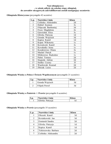 Nasi olimpijczycy - w szkole odbyły się szkolne etapy olimpiad, do zawodów okręgowych zakwalifikowani zostali następujący uczniowie: Olimpiada Historyczna (przystąpiło 42 uczniów) L.p. 1 2 3 4 5 6 7 8 9 10 11 12 13 14 15 16 17 18 19 Nazwisko i imię Celińska Aleksandra Dubiel Szymon Filipczak Bartłomiej Fryze Magdalena Gawriołek Eliza Gliwka Patrycja Grenda Wojciech Kapica Kamil Koput Wikotoria Kowalczyk Kamil Kovalenko Irena Kozakiewicz Diana Machel Patryk Miśkiewicz Radosław Palmi Tomasz Siegieda Adrian Sieńko Cezary Wasilewski Konrad Zbiciak Luiza Klasa 2d 3c 3d 2e 3c 1d 3d 1d 1c 3c 1c 3e 1c 1c 2d 2d 3f 2d 2d Olimpiada Wiedzy o Polsce i Świecie Współczesnym (przystąpiło 21 uczniów) Lp. 1 2 Nazwisko i imię Grenda Wojciech Filipek Paweł Klasa 3d 3d Olimpiada Wiedzy o Państwie i Prawie (przystąpiło 8 uczniów) Lp. 1 Nazwisko i imię Gliwka Patrycja Klasa 1d Olimpiada Wiedzy o Prawie (przystąpiło 35 uczniów) L.p. 1 2 3 4 5 6 7 Nazwisko i imię Oleszek Kamil Kwiatkowski Jan Gontarek Sandra Gliwka Patrycja Kapica Kamil Tchórzewska Barbara Celińska Aleksandra Klasa 3d 3d 2d 1d 1d 2d 2d Olimpiada Losy Żołnierza i Dzieje Oręża Polskiego (przystąpiło 8 uczniów) Lp. 1 2 3 4 Nazwisko i imię Babisz Paweł Palmi Tomasz Szymański Robert Wojciech Jakubczyk Klasa 2d 2d 2d 1e Konkurs Wiedzy o Samorządzie Terytorialnym Lp. 1 2 Nazwisko i imię Bartosz Drożdżyk Miriam Modrzejewska Klasa 3d 2c