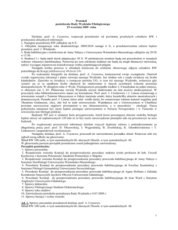 Protokół posiedzenia Rady Wydziału Filologicznego 15 września 2009 roku Dziekan, prof. A. Ceynowa, rozpoczął posiedzenie od powitania przybyłych członków RW i przekazania aktualnych informacji: 1. Następne posiedzenie RW odbędzie się 8 X. 2. Oficjalna inauguracja roku akademickiego 2009/2010 nastąpi 6 X, a przedstawicielem rektora będzie prorektor, prof. J. Włodarski. 3. Rada habilitacyjna z kolokwium dr Anny Ndiaye z Uniwersytetu Warmińsko-Mazurskiego odbędzie się 28 IX o 13.30. 4. Studenci I r. będą mieli dzień adaptacyjny 30 X. W późniejszym terminie będą oni przeszkoleni w zasadach ochrony własności intelektualnej. PoniewaŜ po tym szkoleniu studenci nie będą się mogli tłumaczyć niewiedzą, naleŜy wyciągać najsurowsze konsekwencje wobec popełniających plagiat. Nastąpiła krótka przerwa w obradach konieczna do zrobienie zbiorowego zdjęcia członków RW potrzebnego do Księgi jubileuszowej 40-lecia UG. Po wykonaniu fotografii się dziekan, prof. A. Ceynowa, kontynuował swoje wystąpienie. Omówił wyniki tegorocznej rekrutacji i plany rozwoju naszego Wydziału. JuŜ siódmy rok z rzędu zwiększa się liczba kandydatów. Zjawisko to świadczy o rosnącym prestiŜu UG, w tym teŜ naszego Wydziału, zwłaszcza gdy zestawi się je ze spadkiem liczby chętnych do studiowania w innych uczelniach wskutek przemian demograficznych. W ubiegłym roku w Wydz. Filologicznym przypadło średnio 3, 8 kandydata na jedno miejsce, w obecnym zaś 3, 85. Planowany rozwój Wydziału uczyni studiowanie na nim jeszcze atrakcyjniejsze. W przyszłym roku bibliotekoznawstwo stanie się kierunkiem. Prof. prof. J. Ciechowicz i J. Limon rozmawiają o utworzeniu wespół z Teatrem Muzycznym w Gdyni instytutu sztuki, który kształciłby aktorów musicalowych i dramatycznych. Ponadto prof. J. Limon, który miał wielki dzień, bo wmurowano właśnie kamień węgielny pod Theatrum Gedanense, chce, aby był to teatr uniwersytecki. Współpraca zaś z Uniwersytetem w Charbinie powinna zaowocować najpierw powstaniem u nas chinoznawstwa, a w przeszłości – sinologii. Nasza polonistyka natomiast być moŜe będzie pomagać uniwersytetom w NiŜnym Nowgorodzie i w Tiencinie w utworzeniu tam filologii polskiej. Budynek WF jest w ostatniej fazie przygotowania. JeŜeli koszt powstającej obecnie siedziby biologii będzie niŜszy od zaplanowanych 120 mln zł, to być moŜe zaoszczędzone pieniądze uda się przeznaczyć na nasz budynek. Po wygłoszeniu powyŜszych informacji dziekan wręczył dyplomy rektora z podziękowaniami za długoletnią pracę prof. prof. D. Olszewskiej, J. Węgrodzkiej, B. Zwolińskiej, K. Głombiowskiemu i T. Linknerowi i pogratulował wyróŜnionym. Następnie dziekan, prof. A. Ceynowa, przeszedł do zatwierdzenia porządku obrad. PoniewaŜ nikt nie zgłosił uwag odbyło się głosowanie. Skład RW 100 osób, w tym samodzielnych 68; obecnych 58osób, w tym samodzielnych 48. W głosowaniu jawnym porządek posiedzenia został jednogłośnie zatwierdzony. Porządek posiedzenia: 1. Sprawy personalne. 2. Rozpatrzenie wniosku Komisji do przeprowadzenia procedury nadania tytułu profesora dr hab. Urszuli Kęsikowej z Instytutu Polonistyki Akademii Pomorskiej w Słupsku. 3. Rozpatrzenie wniosku Komisji do przeprowadzenia procedury przewodu habilitacyjnego dr Anny Ndiaye z Instytutu Neofilologii Uniwersytetu Warmińsko-Mazurskiego. 4. Powołanie Komisji do przeprowadzenia procedury przewodu habilitacyjnego dr Eweliny Kamińskiej z Instytutu Filologii Germańskiej Uniwersytetu Szczecińskiego. 5. Powołanie Komisji do przeprowadzenia procedury przewodu habilitacyjnego dr Agaty Hofman z Zakładu Kształcenia Nauczycieli Języków Obcych Uniwersytetu Gdańskiego. 6. Powołanie Komisji do przeprowadzenia procedury przewodu habilitacyjnego dr Jean Ward z Instytutu Anglistyki Uniwersytetu Gdańskiego. 7. Sprawy doktorskie. 8. Sprawy Filologicznego Studium Doktoranckiego. 9. Sprawy toku studiów. 10. Zatwierdzenie protokółu posiedzenia Rady Wydziału z 9.07.2009 r. 11. Sprawy bieŜące i wolne wnioski. Ad. 1. Sprawy personalne przedstawił dziekan, prof. A. Ceynowa. Skład RW 100 osób, w tym samodzielnych 68; obecnych 58osób, w tym samodzielnych 48. 1 1.1. Zatrudnienie na czas określony. a. Zatrudnienie mgr. Sebastiana JaŜdŜewskiego w wyniku konkursu na stanowisku asystenta w Katedrze Skandynawistyki od 1.10.2009 r. na okres 1 roku. Prof. M. Mrozowicki zapytał, czy istnieje w UG stanowisko asystenta. Dziekan odpowiedział, Ŝe takie stanowisko przewiduje Ustawa. Z reguły zatrudniamy doktorów, ale poniewaŜ skandynawistyce brakuje zarówno językoznawców, jak i literaturoznawców rektor wyraził zgodę na zatrudnienie pana mgr. JaŜdŜewskiego. W głosowaniu tajnym wszyscy członkowie RW: 50 – tak, 2 – nie, nikt się nie wstrzymał. RW zatwierdziła wniosek. b. Zatrudnienie dr Sylwii Firyn w wyniku konkursu na stanowisku adiunkta w Zakładzie Lingwistyki Stosowanej i Translatoryki od 1.10.2009 r. na okres 5 lat. W głosowaniu tajnym wszyscy członkowie RW: 50 – tak, 0 – nie, 3 się wstrzymało. RW zatwierdziła wniosek. c. Zatrudnienie dr Małgorzaty Lisiewicz (konkurs) na stanowisku adiunkta w Instytucie Anglistyki od 1. 10.2009 r. na okres 5 lat. Dziekan podkreślił, Ŝe pani dr Lisiewicz jest i pisarką, i ma dyplom lekarza, amerykański doktorat z wystawiennictwa, a takŜe doktorat u prof. M. Janion. W głosowaniu tajnym wszyscy członkowie RW: 48 – tak, 0 – przeciw, 4 się wstrzymało. RW zatwierdziła wniosek. d. Zatrudnienie dr Izabeli Filipiak w wyniku konkursu na stanowisku adiunkta w Instytucie Anglistyki od 1. 10.2009 r. na okres 5 lat. W głosowaniu tajnym wszyscy członkowie RW: 50 – tak, 0 – nie, 4 się wstrzymało. RW zatwierdziła wniosek. e. Zatrudnienie mgr Olgi Yershovej na stanowisku lektora w Instytucie Filologii Wschodniosłowiańskiej od 1. 10.2009 r. na okres 1 roku. Ten wniosek wywołał dyskusję. Prof. E. Biernat zapy
