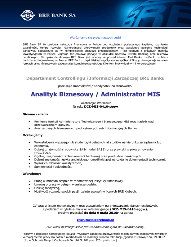 Wyróżniamy się przez naszych Ludzi BRE Bank SA to czołowa instytucja finansowa w Polsce pod względem posiadanego kapitału, rozmiarów działalności, tempa rozwoju, różnorodności oferowanych produktów oraz wysokiego poziomu technologii bankowej. Specjalizuje się w kompleksowej obsłudze przedsiębiorstw i jest jednym z głównych banków inwestycyjnych w Polsce. Zajmuje też czołowe pozycje w obsłudze Klientów Private Banking oraz Klientów detalicznych. Na rynku detalicznym BRE Bank jest obecny za pośrednictwem MultiBanku i mBanku – lidera bankowości internetowej w Polsce. BRE Bank, dzięki bliskiej współpracy ze spółkami Grupy, funkcjonuje na wielu rynkach usług finansowych zapewniając kompleksową obsługę Klientom indywidualnym i korporacyjnym. Departament Controllingu i Informacji Zarządczej BRE Banku poszukuje Kandydatów / Kandydatek na stanowisko: Analityk Biznesowy / Administrator MIS Lokalizacja: Warszawa Nr ref.: DCZ-MIS-0410-sggw Główne zadania: Pełnienie funkcji Administratora Technicznego i Biznesowego MIS oraz nadzór nad przetwarzaniem danych, Analiza danych biznesowych pod kątem potrzeb informacyjnych Banku. Oczekujemy: Wykształcenia wyższego lub studenta/ki ostatnich lat studiów na kierunku zarządzania lub ekonomia, Dobrej znajomości środowiska SAS(moduł BASE) oraz praktyki w programowaniu (4GL/SQL), Ogólnej znajomości rachunkowości bankowej oraz produktów bankowych, Dobrej znajomości języka angielskiego, umożliwiającej na czytanie dokumentacji technicznej, Wysokich zdolności analitycznych, Sumienności i dokładności. Oferujemy: Pracę w młodym zespole w renomowanej instytucji finansowej, Umowę o pracę w pełnym wymiarze godzin, Opiekę medyczną, Możliwość rozwoju swoich pasji i zainteresowań w licznych BRE Klubach, CV wraz z listem motywacyjnym oraz zezwoleniem na przetwarzanie danych osobowych, z podaniem w tytule e-maila nr referencyjnego (DCZ-MIS-0410-sggw), prosimy przesyłać do dnia 9 maja 2010r na adres: [email protected] BRE Bank zastrzega sobie prawo odpowiedzi tylko na wybrane oferty. Prosimy o dopisanie następującej klauzuli: Wyrażam zgodę na przetwarzanie moich danych osobowych zawartych w mojej ofercie pracy dla potrzeb niezbędnych do realizacji procesu rekrutacji (zgodnie z ustawą z dn. 29.08.97 roku o Ochronie Danych Osobowych Dz. Ust Nr 101 poz. 926 z późn. zm.)