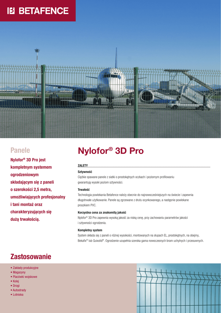 Panele Nylofor® 3D Pro Nylofor® 3D Pro jest kompletnym systemem ogrodzeniowym ZALETY Sztywność Ciężkie spawane panele z siatki o prostokątnych oczkach i poziomym profilowaniu składającym się z paneli gwarantują wysoki poziom sztywności. o szerokości 2,5 metra, Trwałość umożliwiających profesjonalny Technologia powlekania Betafence należy obecnie do najnowocześniejszych na świecie i zapewnia i tani montaż oraz proszkiem PVC. długotrwałe użytkowanie. Panele są zgrzewane z drutu ocynkowanego, a następnie powlekane charakteryzujących się Korzystna cena za znakomitą jakość dużą trwałością. Nylofor® 3D Pro zapewnia wysoką jakość za niską cenę, przy zachowaniu parametrów jakości i sztywności ogrodzenia. Kompletny system System składa się z paneli o różnej wysokości, montowanych na słupach EL, prostokątnych, na obejmy, Bekafix® lub Quixolid®. Ogrodzenie uzupełnia szeroka gama nowoczesnych bram uchylnych i przesuwnych. Zastosowanie • Zakłady produkcyjne • Magazyny • Placówki wojskowe • Kolej • Drogi • Autostrady • Lotniska Słupy Panele Panele o szerokości 2500 mm są dostępne w różnych wysokościach w zakresie od 1030 do 2430 mm. Panele są jednostronnie zakończone ostrymi końcówkami o długości 30 mm, które można umieścić u góry lub na dole panelu. Poziome profilowania nadają panelom dodatkową sztywność. Wymiary oczek: 200 x 50 mm oraz 100 x 50 mm w miejscu profilowania. Średnica drutu: 5 mm. System słupów EL (str. 74) Panele mocowane są na przedniej stronie słupów za pomocą złączek i śrub hakowych. Spawane słupy o przekroju prostokątnym (40 x 60 x 1,5 mm) posiadają otwory do mocowania paneli i zakończone są plastikowym kapturkiem. System słupów na obejmy (str. 75) Słupy stalowe o przekroju prostokątnym 40 x 60 x 1,5 mm, bez otworow. Bramy Nylofor® 3D Pro jest kompletnym systemem ogrodzeniowym stanowiącym optymalne zabezpieczenie dzięki nowoczesnym bramom skrzydłowym i przesuwnym Egidia®, Nylofor® i Robusta®. Obejmy prostokątne: panele montowane są do dwóch przeciwległych boków słupa przy pomocy obejm stalowych łączonych śrubą. Technologia powlekania Panele wykonane są z ocynkowanego drutu (min. 25 g/m2). Zastosowany proces przygotowania powierzchni zapewnia doskonałą przyczepność powłoki PVC do podłoża. Słupy są ocynkowane od wewnątrz i z zewnątrz (minimalna grubość pokrycia wynosi 275 g/m2, z obydwu stron), zgodnie z normą EN 10326. Następnie nakładana jest warstwa podkładowa, a na koniec słupy powlekane są proszkiem poliestrowym (min. 60 mikrometrów). Obejmy z drutu nierdzewnego: panele zahaczane są o obejmę, a następnie mocowane do jednego z boków słupa. System słupów Bekafix® (str. 76) Panele są montowane do boku słupa za pomocą specjalnych złączek wykonanych z poliamidu lub metalu (względy bezpieczeństwa). Słupy o przekroju rurowym 70 x 44 mm w kształcie litery H zakończone są plastikowym kapturkiem. Kolory (str. 2) Zielony RAL 6005, biały RAL 9010 i antracytowy wysokości 1530, 1730 i 1930 mm). BF 7016M (tylko System słupów Quixolid® (str. 80) Panele są mocowane do boków słupa, zawieszane na specjalnych haczykach i zabezpieczane metalowymi zaciskami. Żadne dodatkowe akcesoria nie są wymagane. Słupy stalowe w kształcie litery H o wymiarach 75 x 50 mm, są wyposażone w plastikowy kapturek. Panele można zamontować również na słupach Bekafix® Super (str. 77). Informacje techniczne na temat różnych systemów słupów znajdują się w części katalogu dotyczącej systemów słupów. SYSTEM Nylofor® 3D Pro Wysokość ogrodzenia [mm] Panele szer. x wys. [mm] Liczba profilowań panelu Liczba mocowań Wysokość słupa [mm] Słup EL Złączki Śruby hakowe Słup na obejmy Słup Bekafix® Pośredni i narożny Końcowy 1100 2500 x 1030 2 1500 4 3 2 4 2 1300 2500 x 1230 2 1700 5 3 3 4 2 1600 2500 x 1530 3 2000 5 4 3 6 3 1800 2500 x 1730 3 2200 (2400*) 6 4 4 6 3 2000 2500 x 1930 3 2400 (2600*) 6 5 4 8 4 2100 2500 x 2030 4 2600 6 5 4 8 4 2500 2500 x 2430 4 3200 8 6 5 8 4 Słup Quixolid® bez akcesoriów Betafence Sp. z o.o. ul. Dębowa 4, 47-246 Kotlarnia tel. +48 77 40 62 200 fax +48 77 48 25 000 [email protected] www.betafence.pl www.ogradzamy.pl Wszelkie prawa zastrzeżone Panele * tylko dla słupa EL PL Betafence 2012
