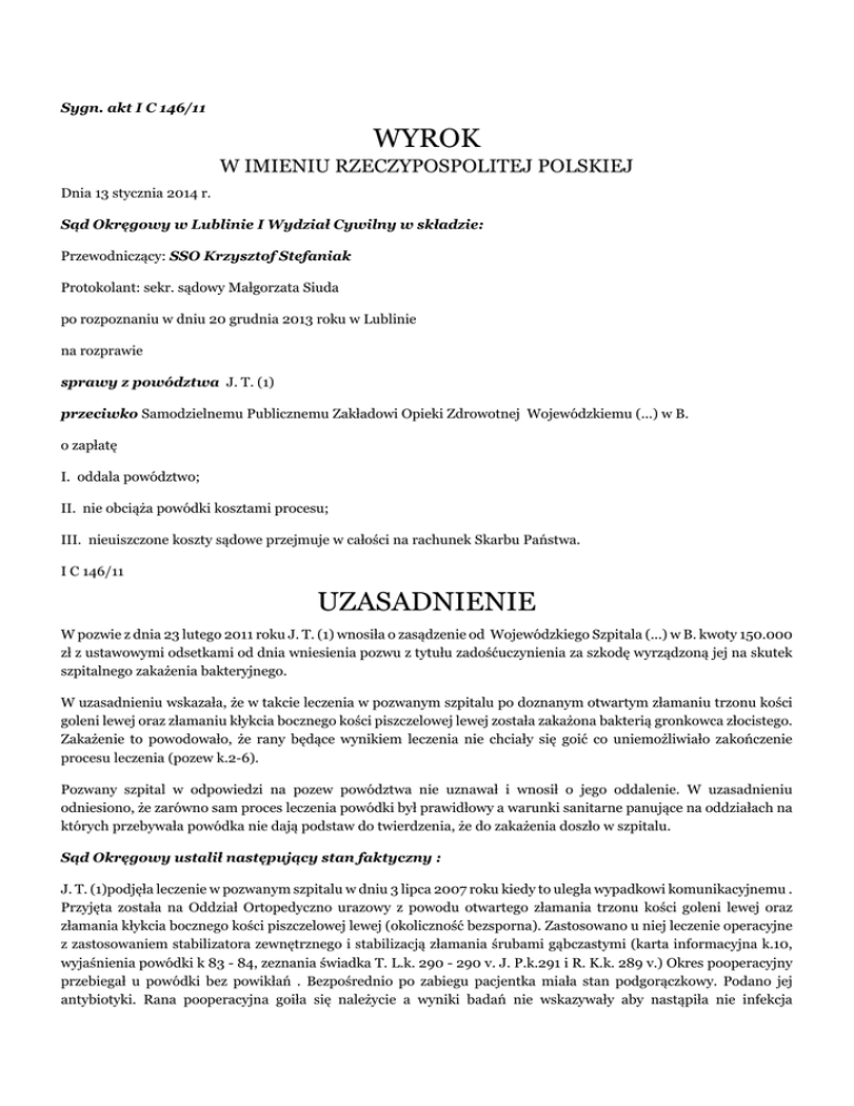 Sygn. akt I C 146/11 WYROK W IMIENIU RZECZYPOSPOLITEJ POLSKIEJ Dnia 13 stycznia 2014 r. Sąd Okręgowy w Lublinie I Wydział Cywilny w składzie: Przewodniczący: SSO Krzysztof Stefaniak Protokolant: sekr. sądowy Małgorzata Siuda po rozpoznaniu w dniu 20 grudnia 2013 roku w Lublinie na rozprawie sprawy z powództwa J. T. (1) przeciwko Samodzielnemu Publicznemu Zakładowi Opieki Zdrowotnej Wojewódzkiemu (...) w B. o zapłatę I. oddala powództwo; II. nie obciąża powódki kosztami procesu; III. nieuiszczone koszty sądowe przejmuje w całości na rachunek Skarbu Państwa. I C 146/11 UZASADNIENIE W pozwie z dnia 23 lutego 2011 roku J. T. (1) wnosiła o zasądzenie od Wojewódzkiego Szpitala (...) w B. kwoty 150.000 zł z ustawowymi odsetkami od dnia wniesienia pozwu z tytułu zadośćuczynienia za szkodę wyrządzoną jej na skutek szpitalnego zakażenia bakteryjnego. W uzasadnieniu wskazała, że w takcie leczenia w pozwanym szpitalu po doznanym otwartym złamaniu trzonu kości goleni lewej oraz złamaniu kłykcia bocznego kości piszczelowej lewej została zakażona bakterią gronkowca złocistego. Zakażenie to powodowało, że rany będące wynikiem leczenia nie chciały się goić co uniemożliwiało zakończenie procesu leczenia (pozew k.2-6). Pozwany szpital w odpowiedzi na pozew powództwa nie uznawał i wnosił o jego oddalenie. W uzasadnieniu odniesiono, że zarówno sam proces leczenia powódki był prawidłowy a warunki sanitarne panujące na oddziałach na których przebywała powódka nie dają podstaw do twierdzenia, że do zakażenia doszło w szpitalu. Sąd Okręgowy ustalił następujący stan faktyczny : J. T. (1)podjęła leczenie w pozwanym szpitalu w dniu 3 lipca 2007 roku kiedy to uległa wypadkowi komunikacyjnemu . Przyjęta została na Oddział Ortopedyczno urazowy z powodu otwartego złamania trzonu kości goleni lewej oraz złamania kłykcia bocznego kości piszczelowej lewej (okoliczność bezsporna). Zastosowano u niej leczenie operacyjne z zastosowaniem stabilizatora zewnętrznego i stabilizacją złamania śrubami gąbczastymi (karta informacyjna k.10, wyjaśnienia powódki k 83 - 84, zeznania świadka T. L.k. 290 - 290 v. J. P.k.291 i R. K.k. 289 v.) Okres pooperacyjny przebiegał u powódki bez powikłań . Bezpośrednio po zabiegu pacjentka miała stan podgorączkowy. Podano jej antybiotyki. Rana pooperacyjna goiła się należycie a wyniki badań nie wskazywały aby nastąpiła nie infekcja bakteryjna. W dniu 24 lipca 2006 roku wypisana została w stanie dobrym i bez gorączki (historia choroby k.93, opinia biegłego k. 427-441). W dniach 3 - 18 grudnia J. T. (1) ponownie została przyjęta na ten sam oddział pozwanego szpitala celem usunięcia "zespoleń kości" Po operacyjnym usunięciu materiału zespalającego i zastosowaniu opatrunku gipsowego została wypisana do domu w stanie dobrym. W czasie tego pobytu rozpoznano u niej ponadto staw rzekomy goleni lewej. Nie odnotowano natomiast aby pacjentka gorączkowała (historia choroby j.w.). W dniach 7 lipca - 2 sierpnia 2007 roku powódka znowu została przyjęta na Oddział Urazowo - Ortopedyczny celem leczenia zdiagnozowanego wcześniej stawu rzekomego goleni lewej. Przyjęta została w stanie dobrym a , w dniu 11 lipca 2007 roku otrzymała przepustkę z której powrócił w dniu 16 lipca kiedy to została poddana zabiegowi operacyjnemu . Bezpośrednio po zabiegu u powódki utrzymywał się dość wysoka gorączka - 39 °C . W związku ze stwierdzeniem niewielkiego zaczerwienia przyrannego i dolegliwościach bólowych , ale braku gorączki w dniu 23 lipca zlecono pobranie wymazu i kontynuowano antybiotykoterapię. Wynik badania posiewu z dnia 27 lipca wskazywał na wynik ujemny. Wypisana do domu w sanie dobrym (historia choroby j.w. , wynik badania bakteriologicznego k.462 zeznania świadków R. B. (1) k.84v.- 85, A. B. k. 85 – 85 v.). Po powrocie do domu noga powódki zaczęła „sinieć a z rany sączyć ropa (wyjaśnienia powódki k.83). Po każdym pobycie w szpitalu powódka kontynuowała leczenie w poradni przyszpitalnej, gdzie zgłosiła problemy z gojeniem rany – przypisano jej coś do przemywania rany , która pełnym czasie się „zasklepiła (wyjaśnienia powódki k. 83 v., historia leczenia k. 18-23). Po raz kolejny powódka została przyjęta na ten sam oddział pozwanego w szpitala w dniu 3 marca 2008 roku i jego trakcie usunięto stabilizator kości oraz dokonano przeszczepu skóry. Uzyskano wygojenie ran i w dniu 10 marca i. T. wypisana została ze szpitala w stanie dobrym (historia choroby j.w., karta informacyjna k.13). Rana po operacji przeszczepu zagoiła się ( okoliczność przyznana przez powódkę k.83 v.). W 2009 roku rana na nodze powódki zaczęła „ponownie się otwierać w tym miejscu gdzie robiony był przeszczep” (wyjaśnienia powódki k. 83 v.) . Powódka kontynuując leczenie w poradni przyszpitalnej zgłaszała się na wizyty kontrolne w gdzie stosowano leczenie, które przynajmniej na pewien okres powodowało zasklepianie się rany (opinia biegłego k.437, okoliczności przyznane przez powódkę historia leczenia k. 18-23). W związku z tym, że stan rany pogarszał się i J. T. niezadowolona była z wyników leczenia , za namową swoich córek , zgłosiła się do lekarza w K. . Tam zlecono przeprowadzenie badań posiewu z rany (okoliczność bezsporna) które dały wynik pozytywny – w ranie stwierdzono obecność gronkowca złocistego – szczep metylicyno - wrażliwego – wrażliwego na niemal wszystkie antybiotyki (wynik badań k. 14). W wyniku podjętego leczenie uzyskano poprawę stanu rany – jej wygojenie (okoliczność przyznana przez powódkę, zeznania świadka J. D. k.504). W lipcu 2010 roku rana na nodze powódki znowu się „otworzyła ale w następnym miejscu” (okoliczność przyznana przez powódkę k 83v.). Z tego względu powódka zgłosiła się ponownie do poradni przyszpitalnej pozwanego szpitala , gdzie ponownie zlecono badan